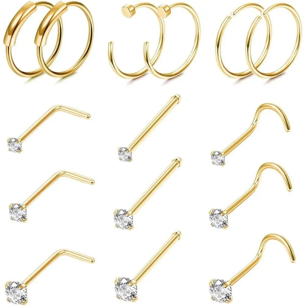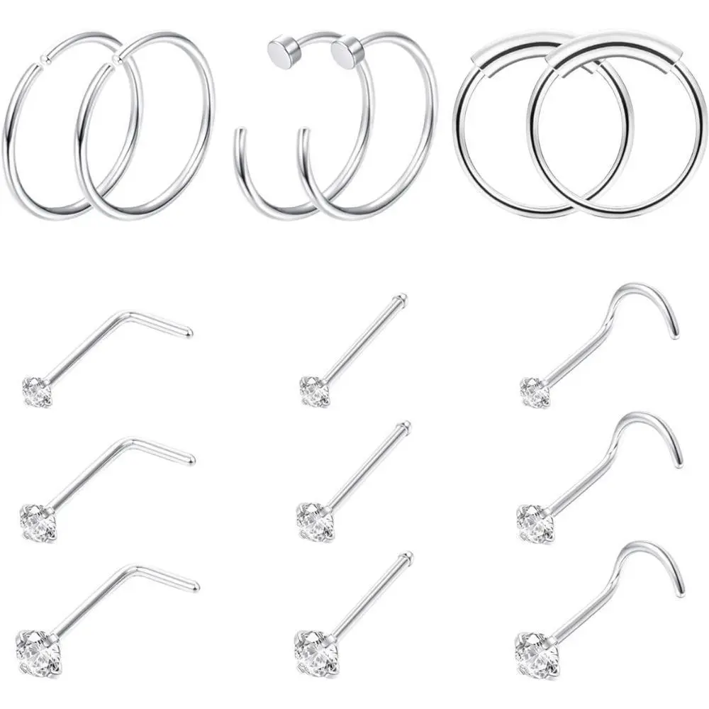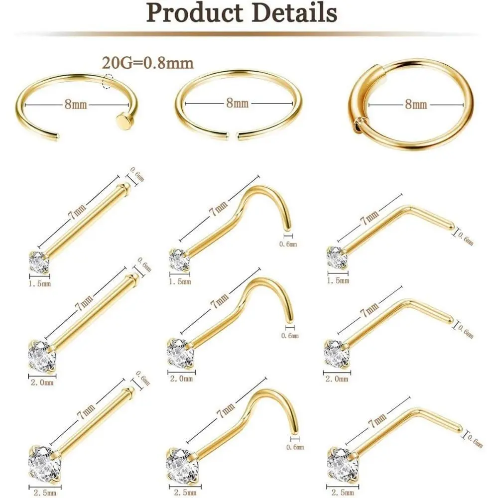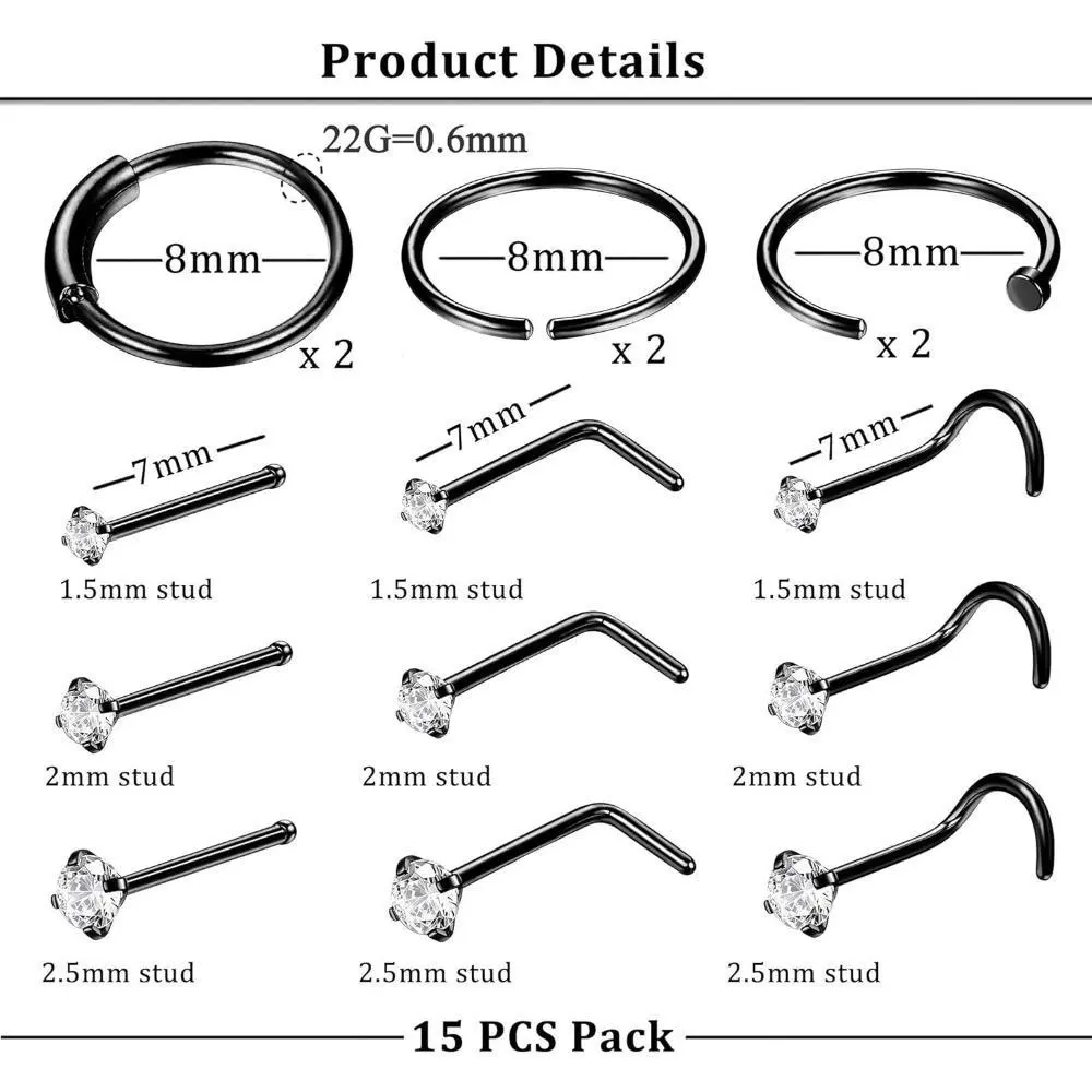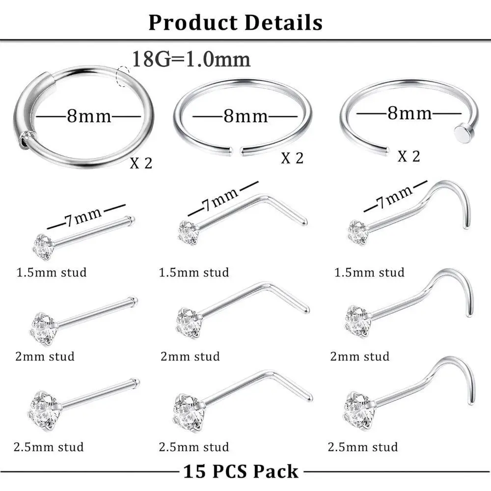 ·Versatile Sizes: This set includes 15 pieces of nose rings and studs in various sizes (22G, 20G, and 18G), allowing you to choose the perfect fit for your piercing.