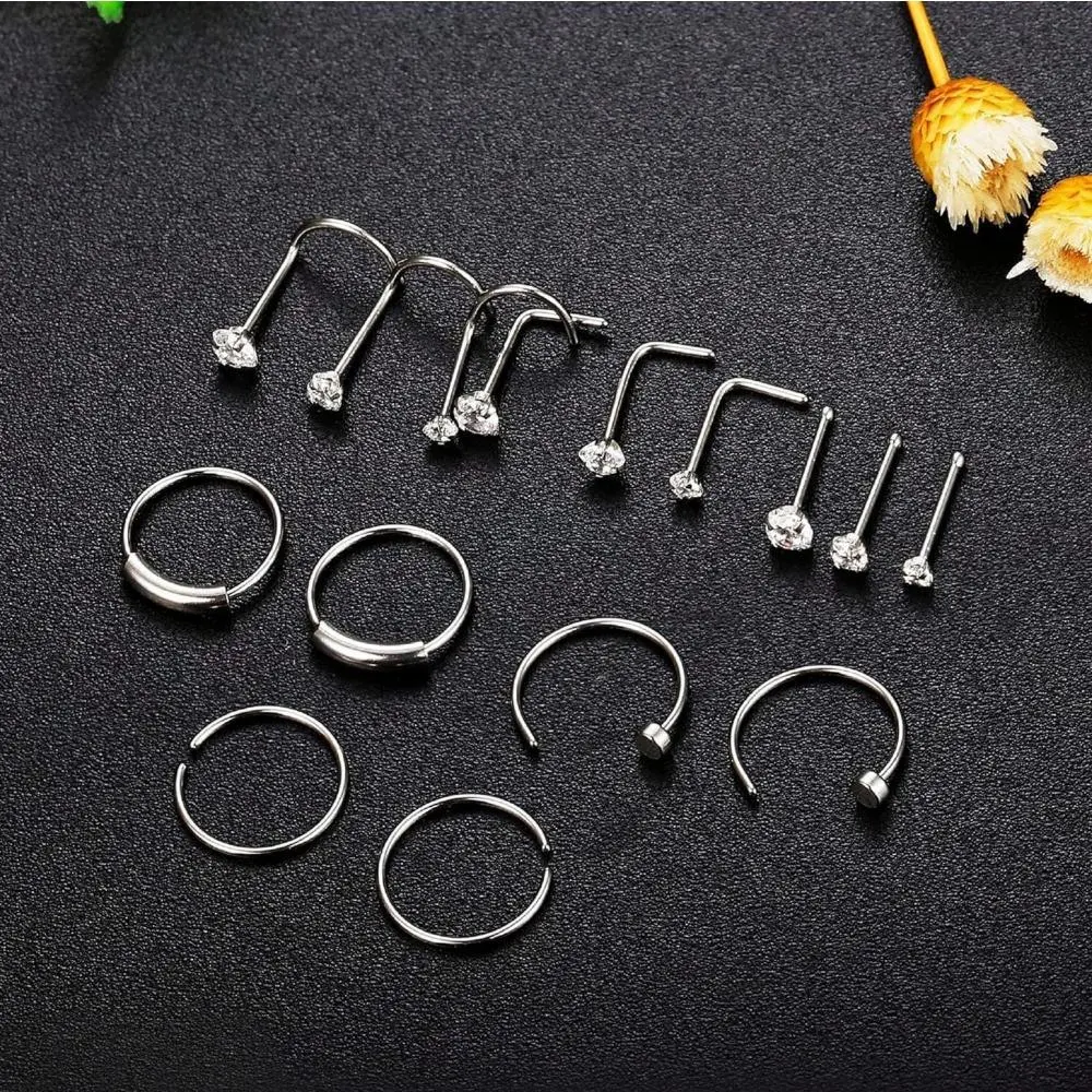 FLORIDECO 15PCS 22G 20G 18G Surgical Steel Nose Rings Hoop Studs Cartilage Earrings Body Piercing Jewelry 1.5mm 2mm 2.5mm CZ Daily