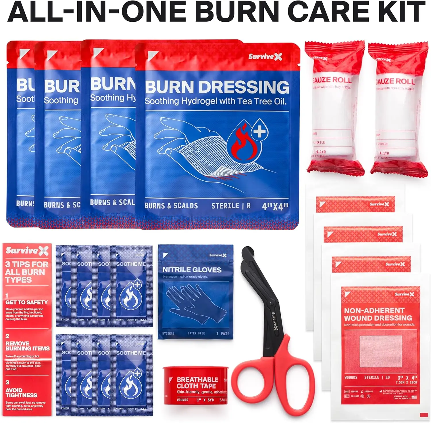 This complete thermal care kit includes 4 large 4x4" hydrogel pads, 8 cooling gel packets, trauma shears, gauze, non-adherent dressings, breathable cloth tape, nitrile gloves, and a first aid guide.