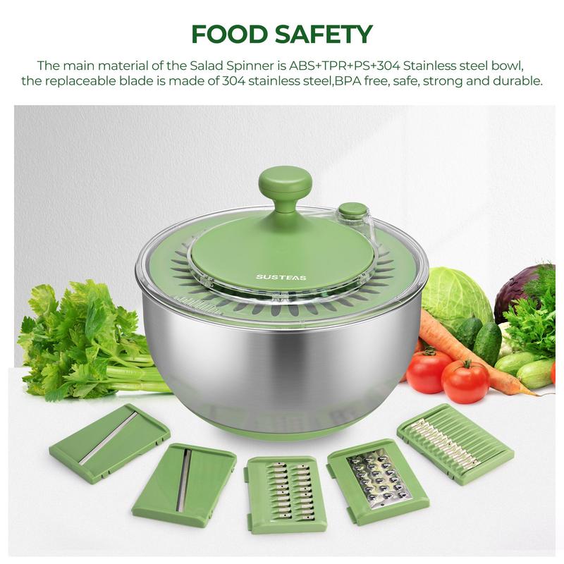 The SUSTEAS 5-in-1 Salad Spinner is a versatile kitchen tool. It combines a salad spinner, vegetable cutting, and cleaning basket. The basket features a fruit filter, perfect for preparing meals. This green kitchen utensil streamlines your cooking process. Ideal for those who value efficiency in the kitchen.