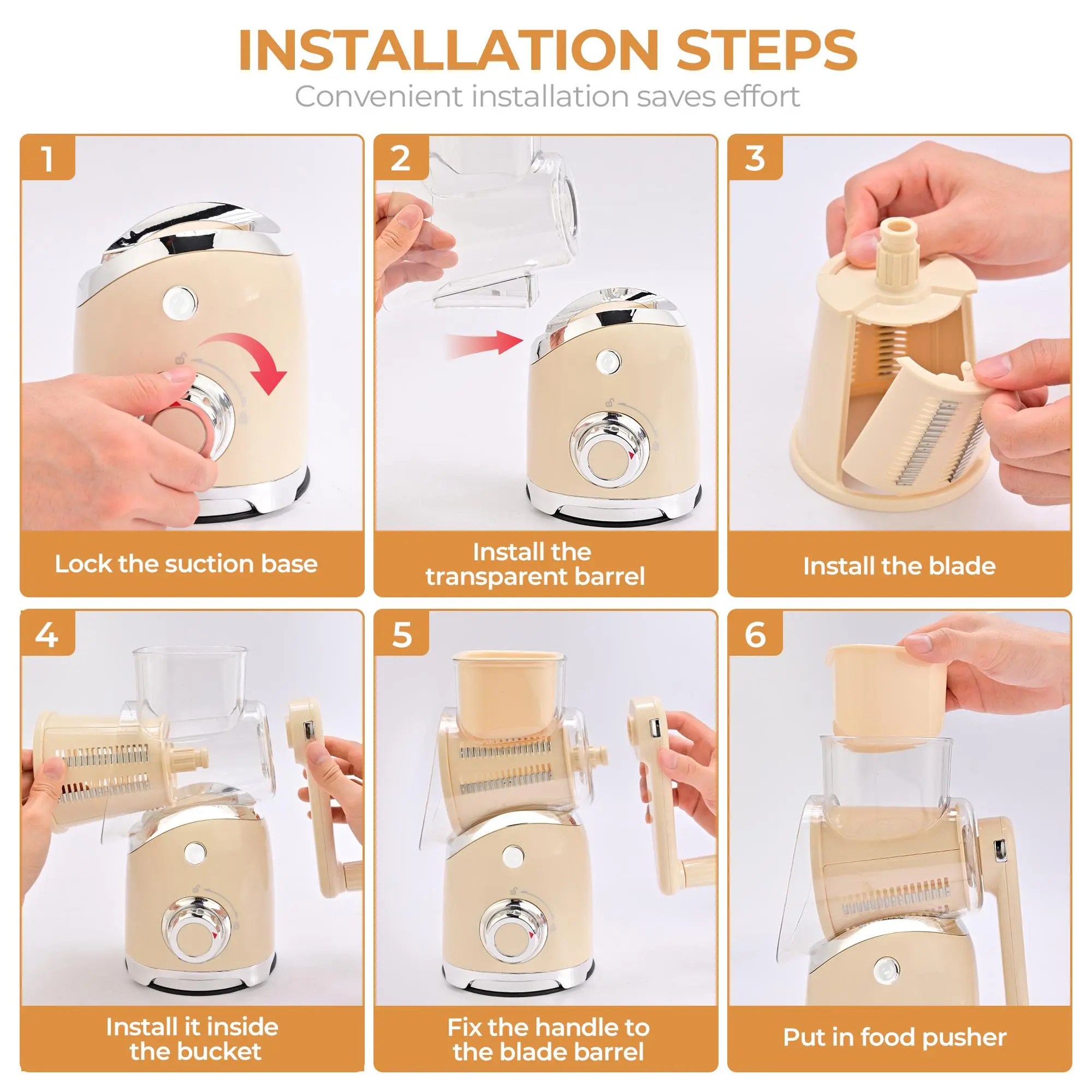 SUSTEAS 6-in-1 Pro Rotary Grater – Crush Ice, Shred Cheese & Slice Veggies with Ease! Secure Suction Base & Hand Guard for Ultimate Control & Safety – Effortless Prep