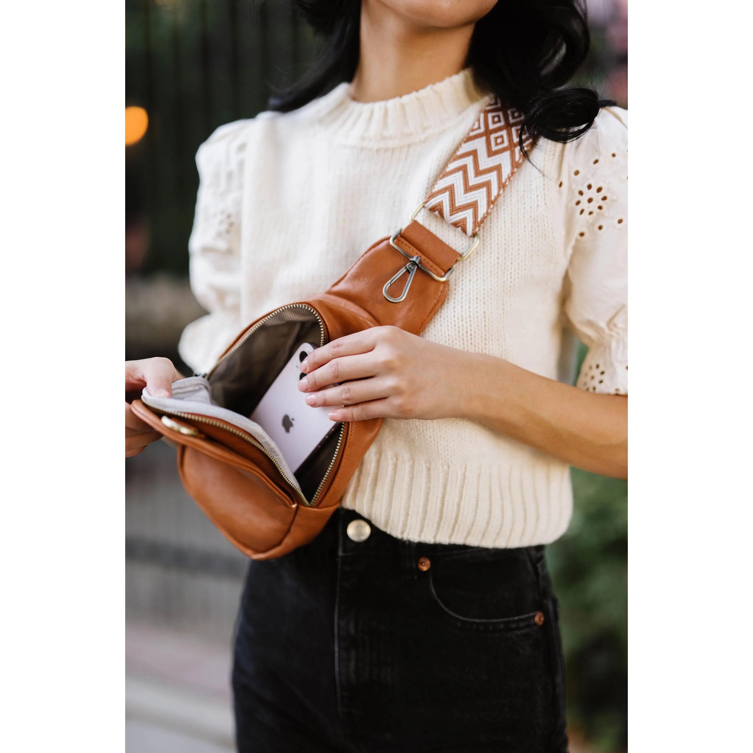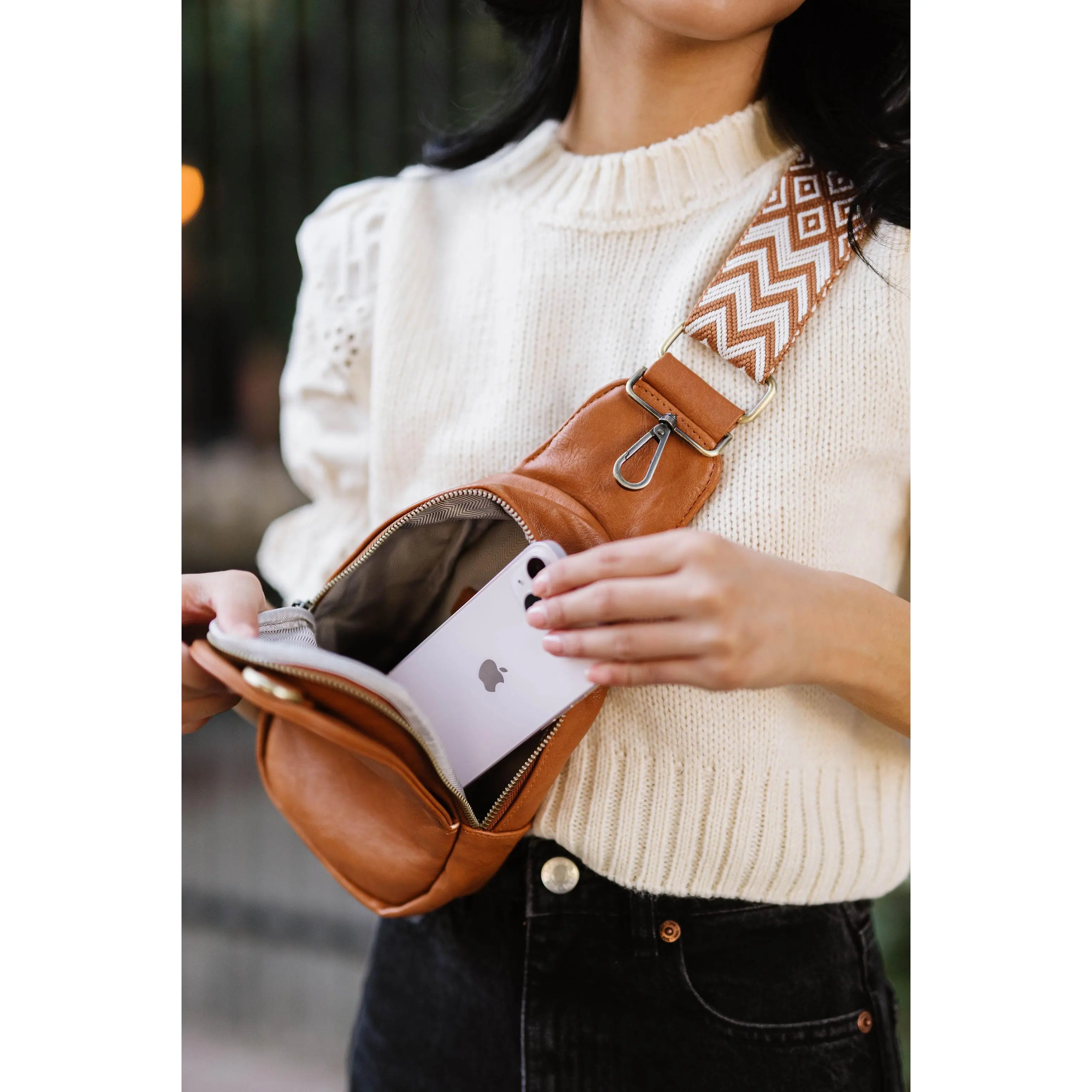 ·Metal clasp hooks to loop in front pocket for extra security