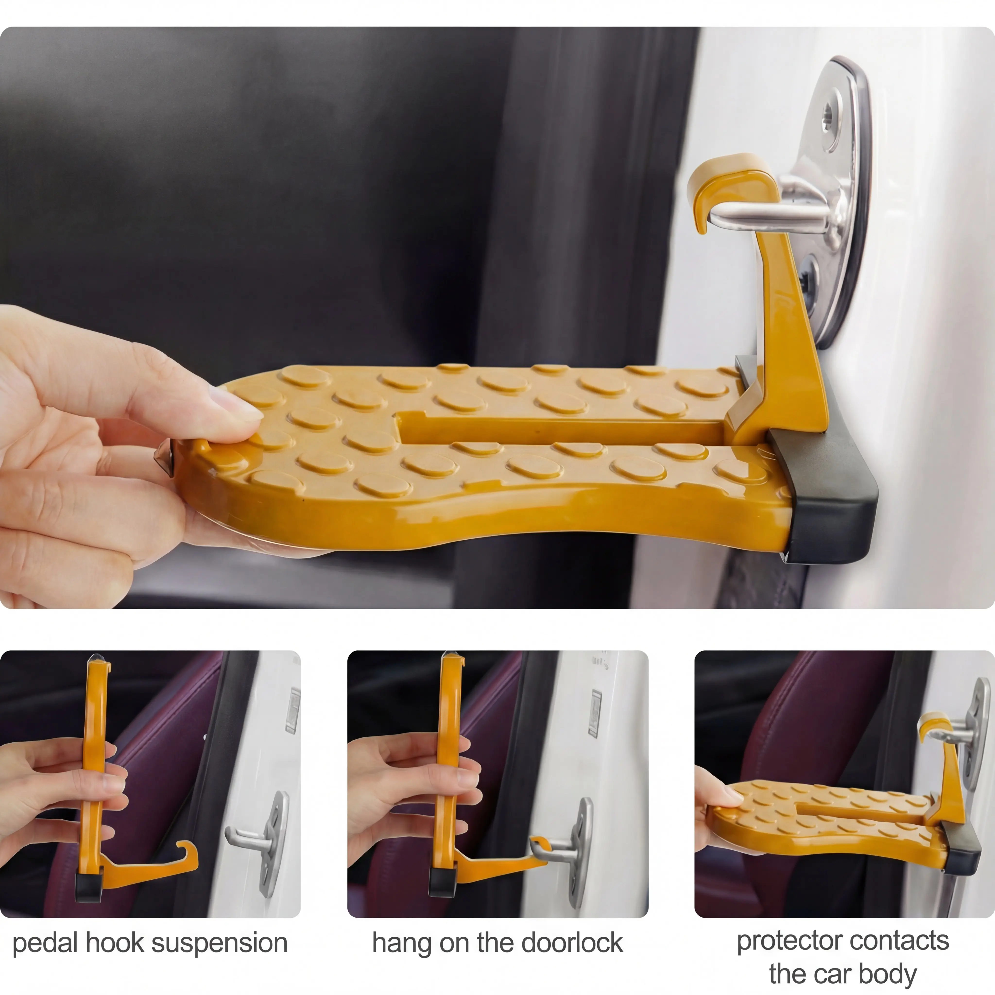 ·Hook-On Design: The foot pedal hooks onto the car door for a secure and stable connection.