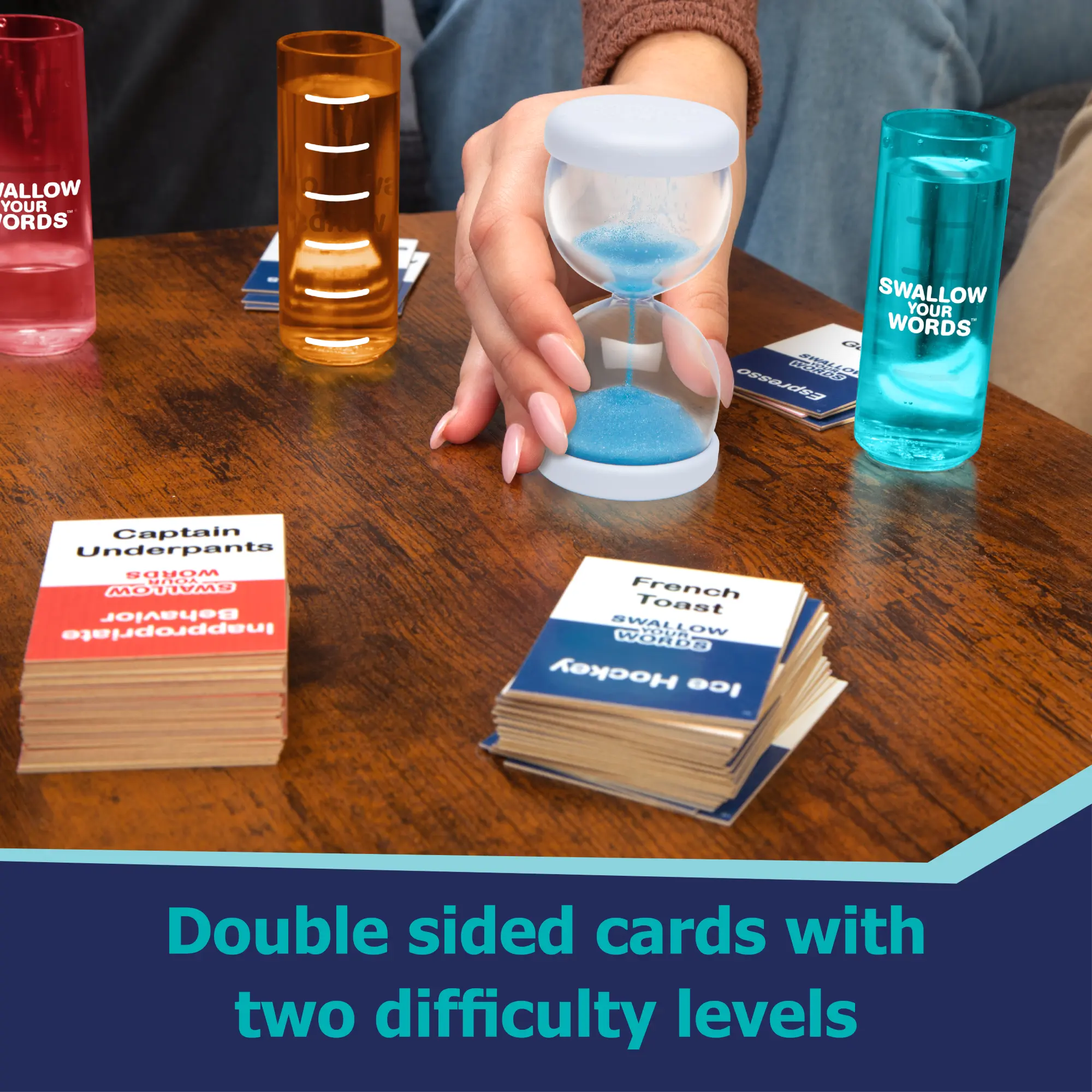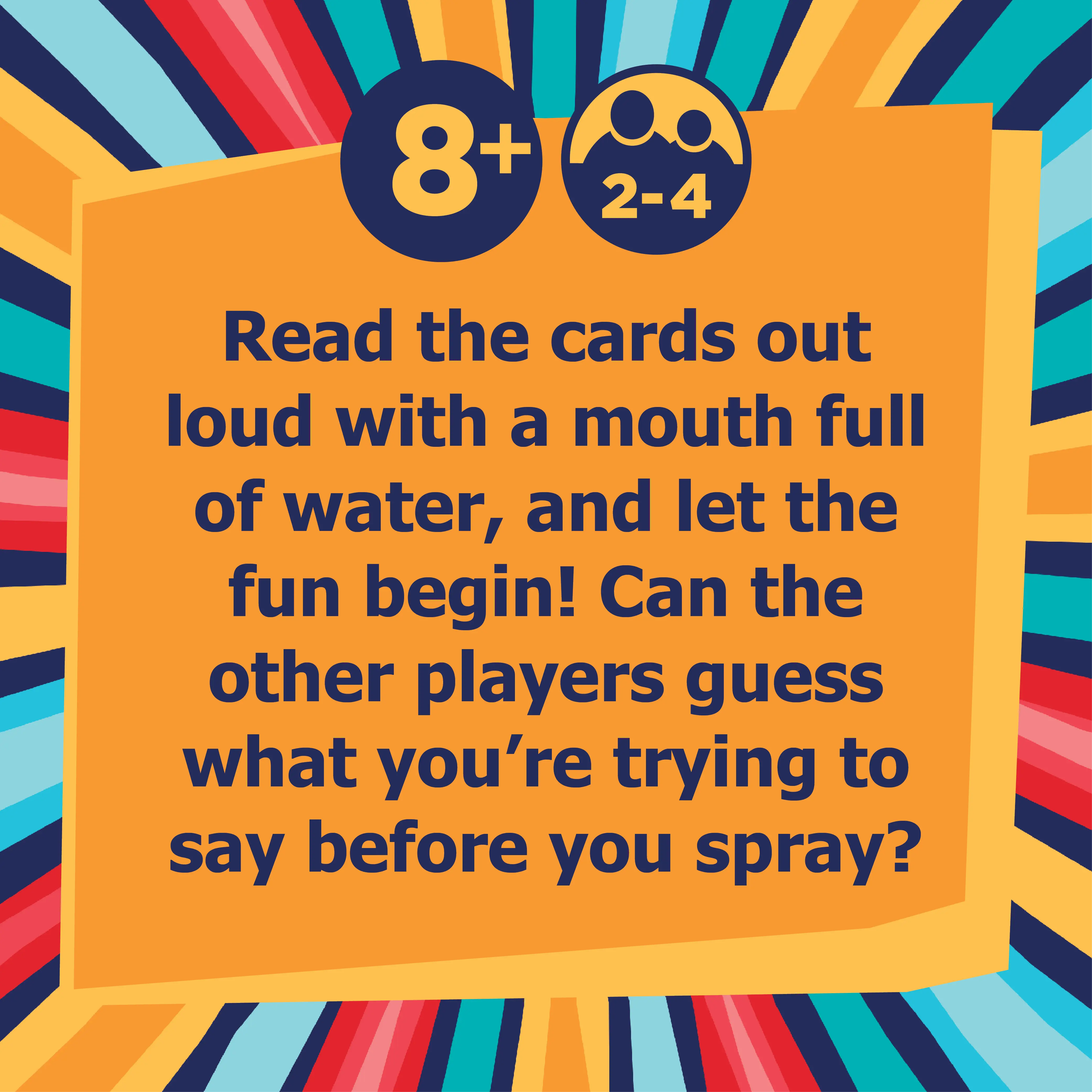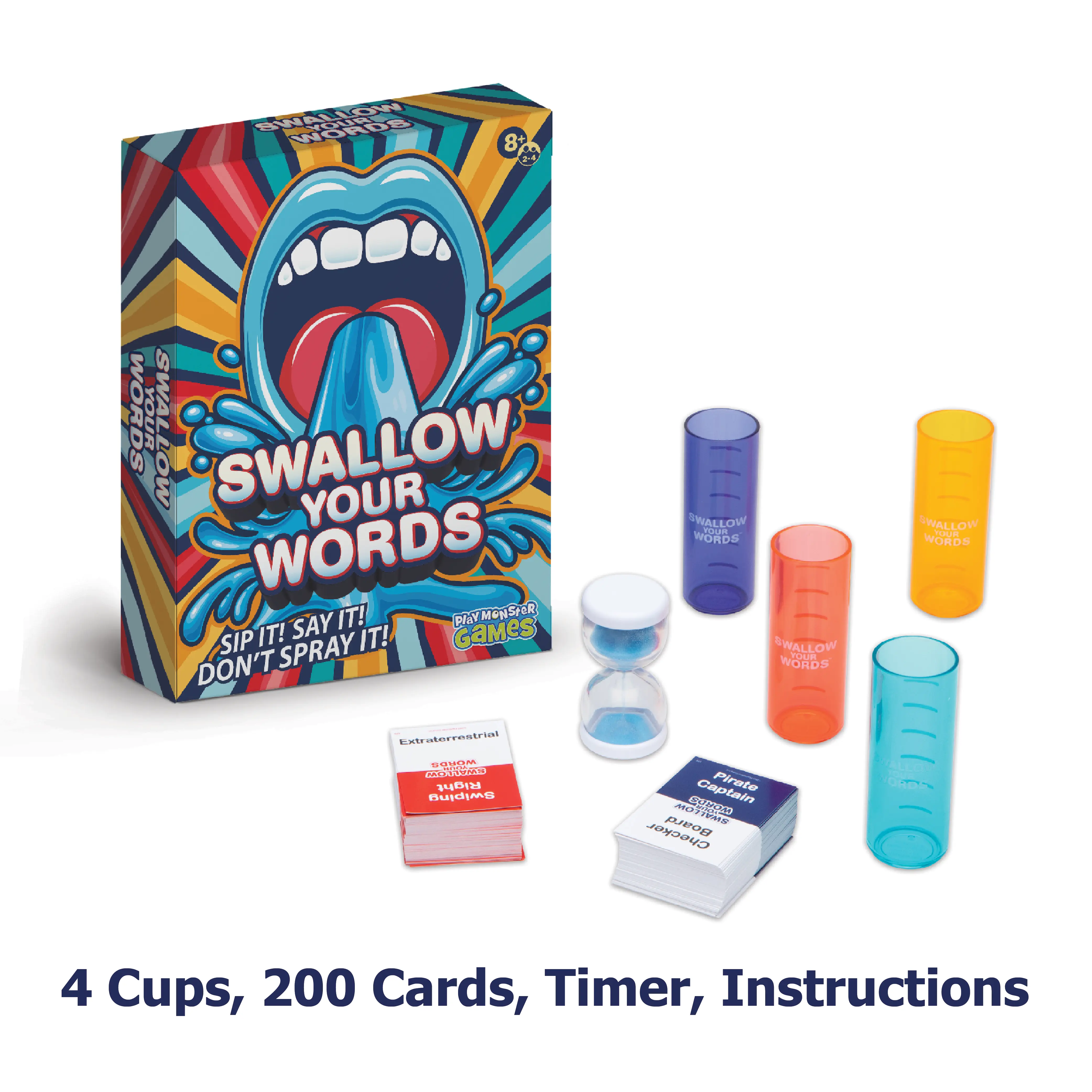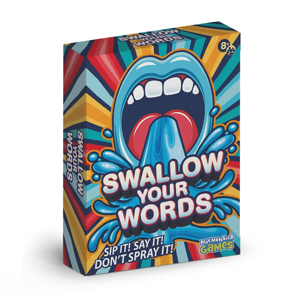 Sip it, say it, and don't you dare spray it in the hilarious family party game Swallow Your Words! Read the cards out loud with a mouth full of water, and let the fun begin! Can the other players guess what you're trying to say before you spray? A laugh-out-loud time for 2–4 players ages 8 and up!