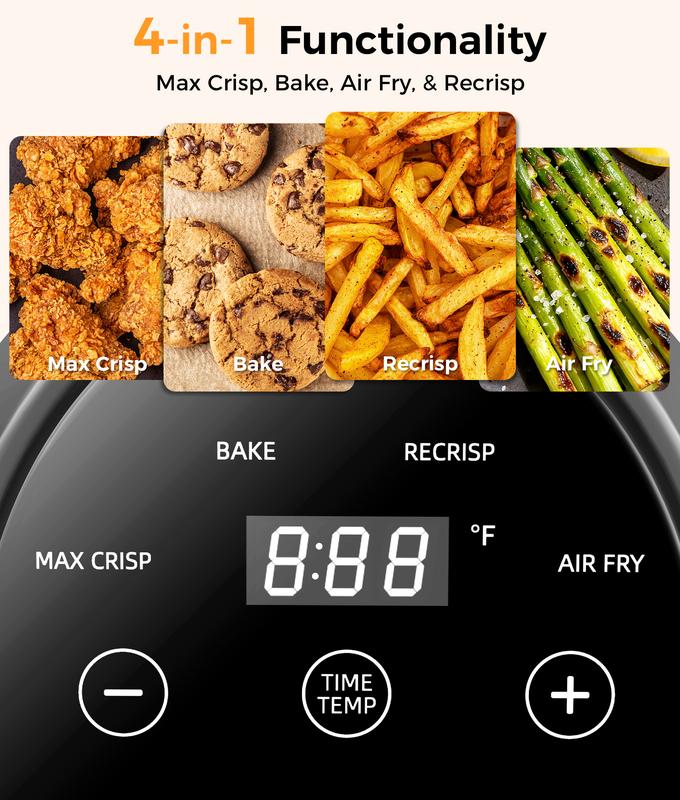 The 4-in-1 Glass Air Fryer System offers Bake, Air Fry, Max Crisp, and Recrisp in one compact appliance. Create juicy roasts, crispy fries, or reheated snacks with 95% less oil. Perfect for busy families who love fast, healthy meals. Voltage: 110V.