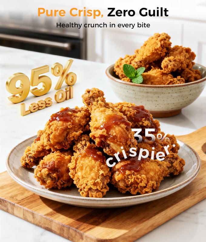The 1500W turbo heating system delivers fast, even results with 95% less oil. Enjoy golden crispiness without guilt. Product dimensions: 11.8in × 9.8in × 11.4in (4.2QT), 8.5in × 7.9in × 9.1in (1.6QT).