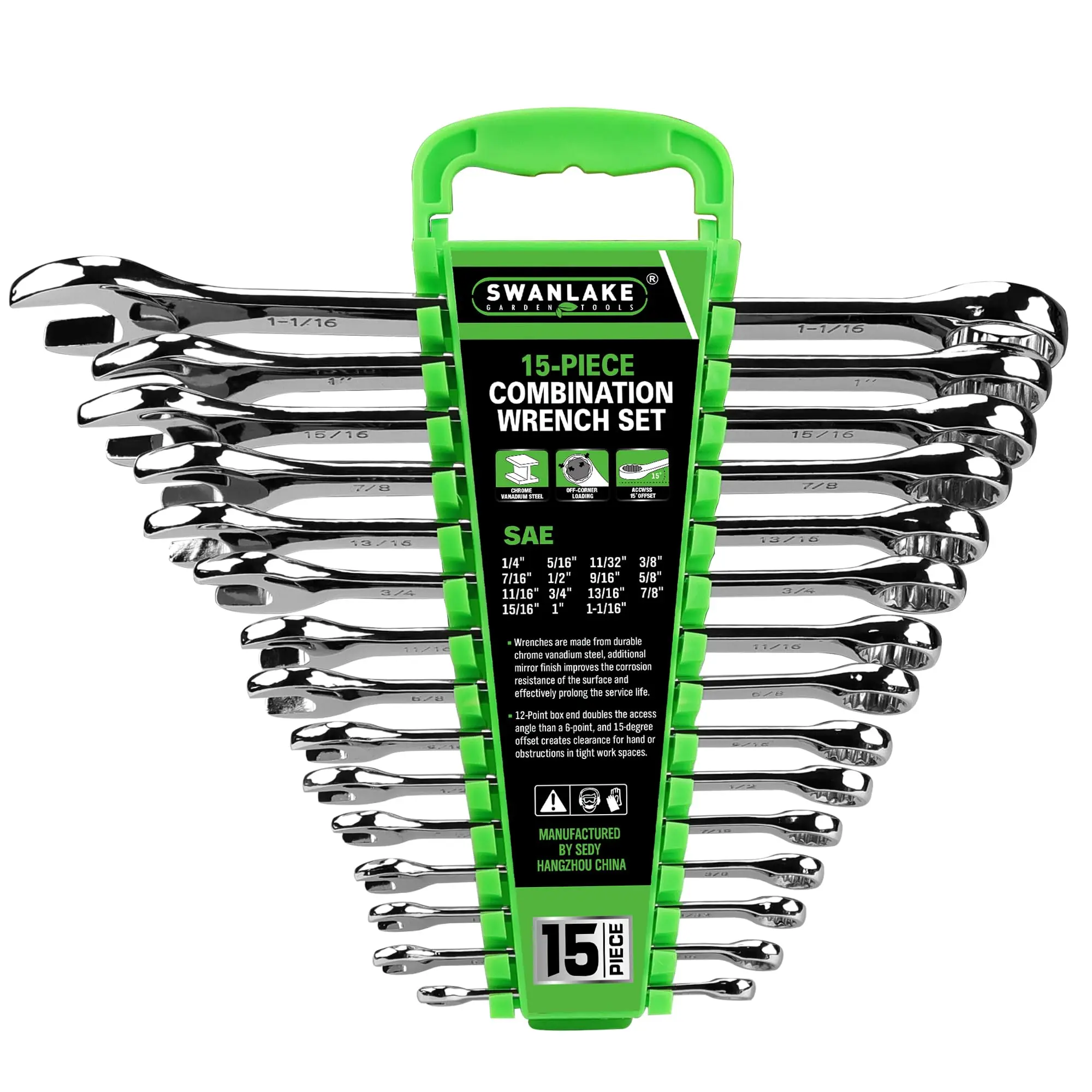 This 15-piece SAE wrench set is made from high-strength chrome-vanadium steel for maximum durability. The mirror finish enhances corrosion resistance, extending the tools' lifespan. The unique V-Notch design ensures a strong grip on fasteners, providing increased torque and reducing wear on fasteners.