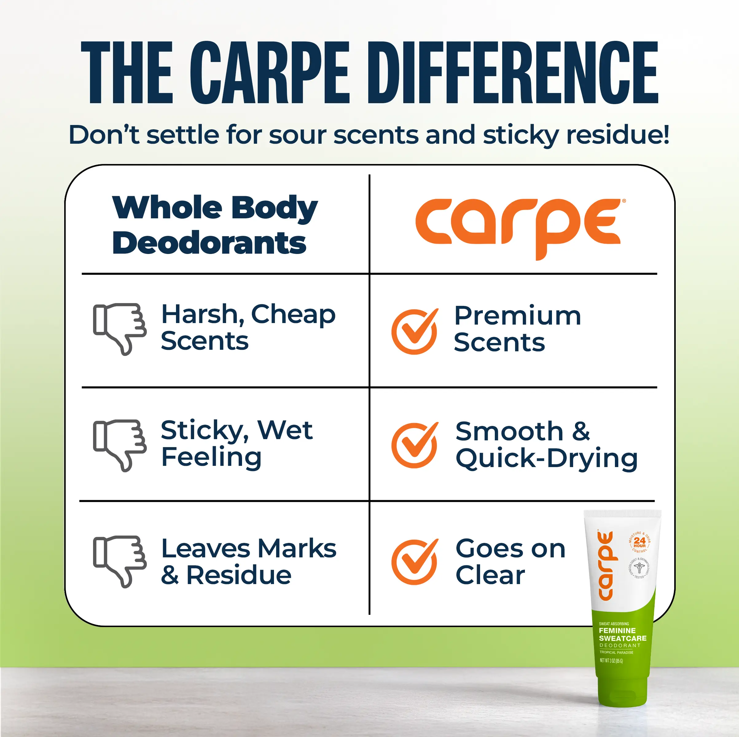 | Ingredients | Underarm: Aluminum Sesquichlorohydrate at 15%, Water (Aqua), Glyceryl Stearate SE, Silica, Silica Silylate, Glycerin, Dimethicone, Ethylhexyl Palmitate, Cetyl Alcohol, Cetearyl Alcohol, Fragrance/Eucalyptus Oil (excluded in Fragrance Free), Isopropyl Myristate, Phenoxyethanol, Hydroxypropyl Methylcellulose, Ethylhexylglycerin, Sodium Hydroxide,Feminine Care Deodorant: Water (Aqua), Distarch Phosphate, Propanediol, Glycerin, Alcohol Denat., Hamamelis Virginiana (Witch Hazel) Water, Kaolin, Silica Cetyl Silylate, Isododecane, Polymethylsilsesquioxane, Sodium Zinc Polyitaconate, Fragrance (parfum) Excluded in Unscented,Alcohol, Ethylhexylglycerin, Carbomer, Polysilicone-11, Xanthan Gum, Hydroxyethyl Acrylate/Sodium Acryloyldimethyl Taurate Copolymer, Sodium Phytate, Octenidine HC1, Isohexadecane, Morinda Citrifolia Leaf Extract, Citric Acid, Melaleuca Alternifolia (Tea Tree) Leaf Oil, Phenoxyethanol, Potassium Hydroxide, Sodium Hydroxide, Phenylpropanol, Denatonium Benzoate, Polysorbate 60, Sorbitan Isostearate, t-Butyl Alcohol, Maltodextrin, Pentylene Glycol |