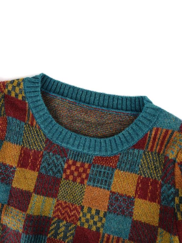 Women's Random Plaid Pattern Round Neck Sweater, Casual Half Sleeve Crew Neck Jumper for Fall & Winter, Fashion Ladies' Knitwear for Daily Wear