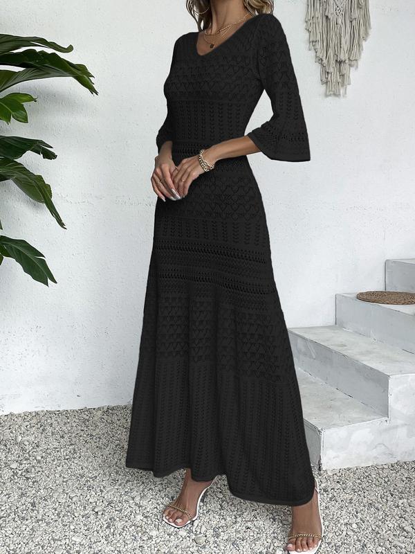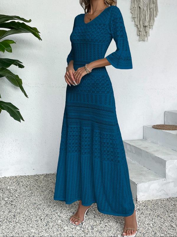 5. Elegant V-Neck Knit Dress, Hollow Out Design, Casual Fitted Long Skirt, Spring & Summer Beach Vacation Wear, Random Pattern