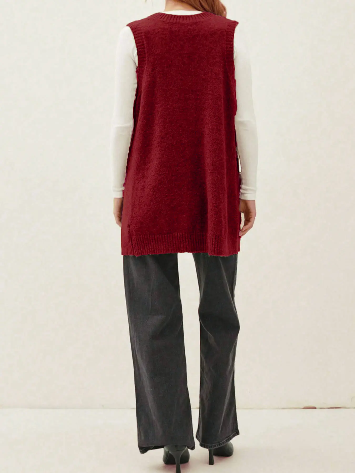 The red is just like the photo, very vibrant color! A dark red. Thease sweater vests are so cute!
