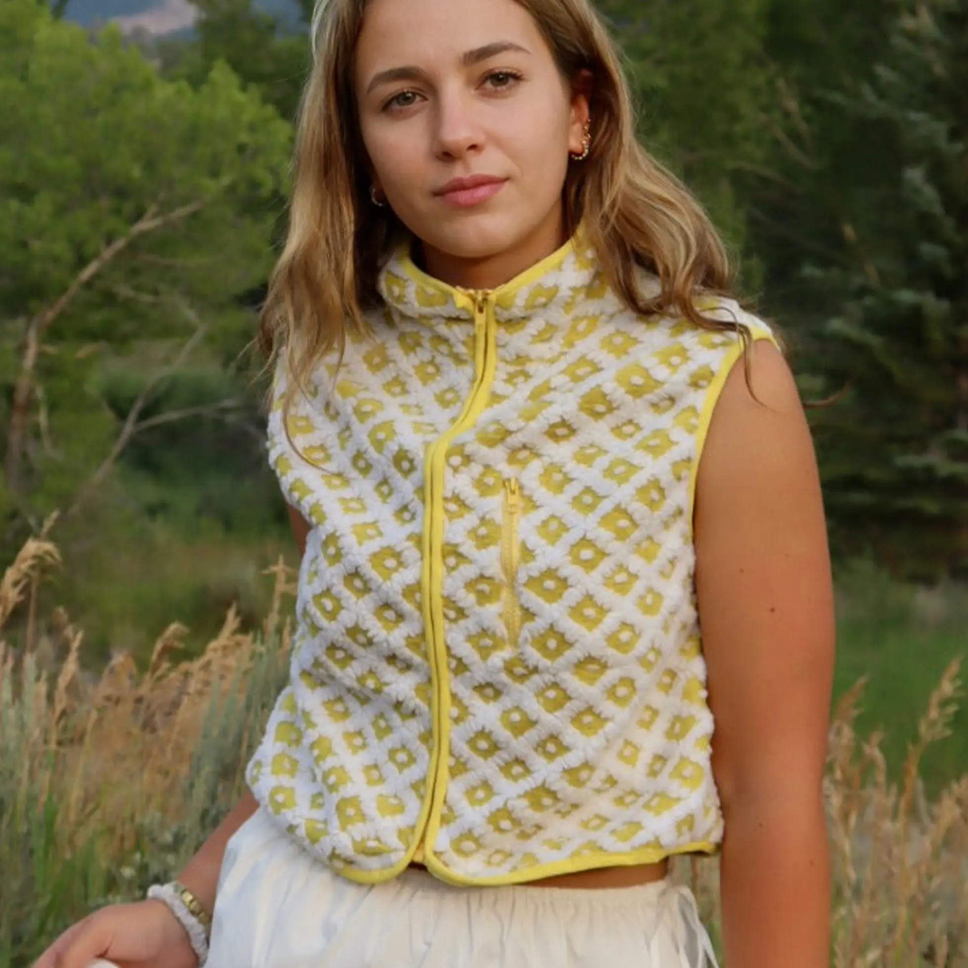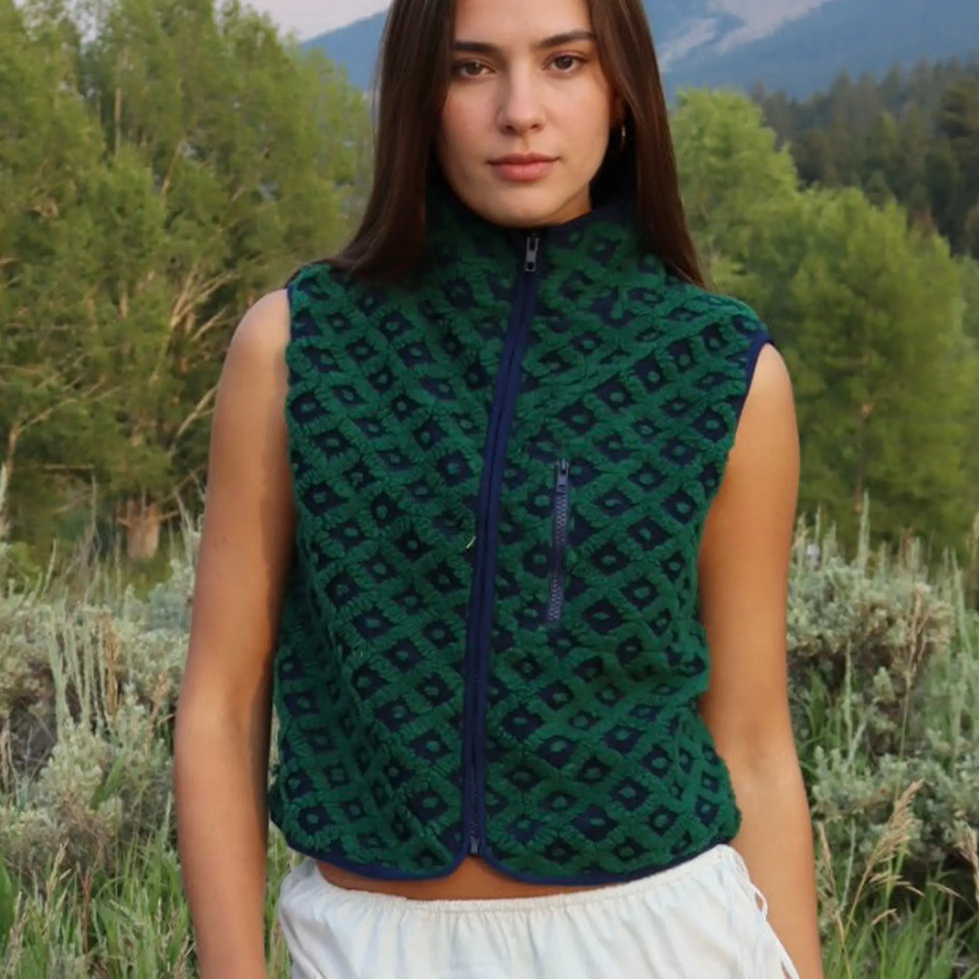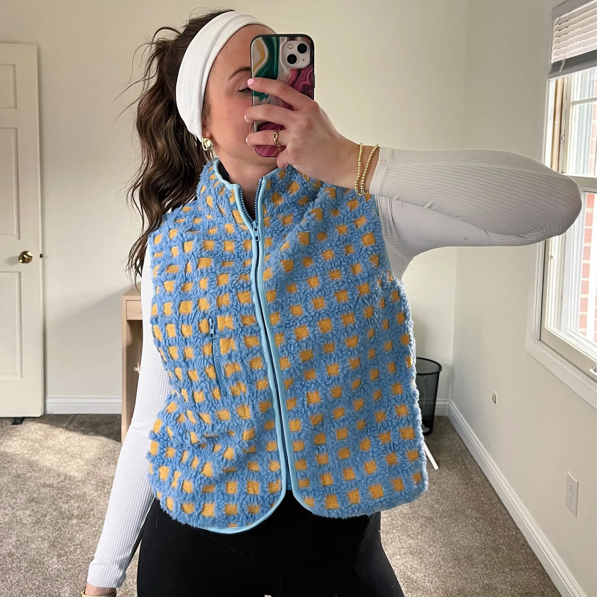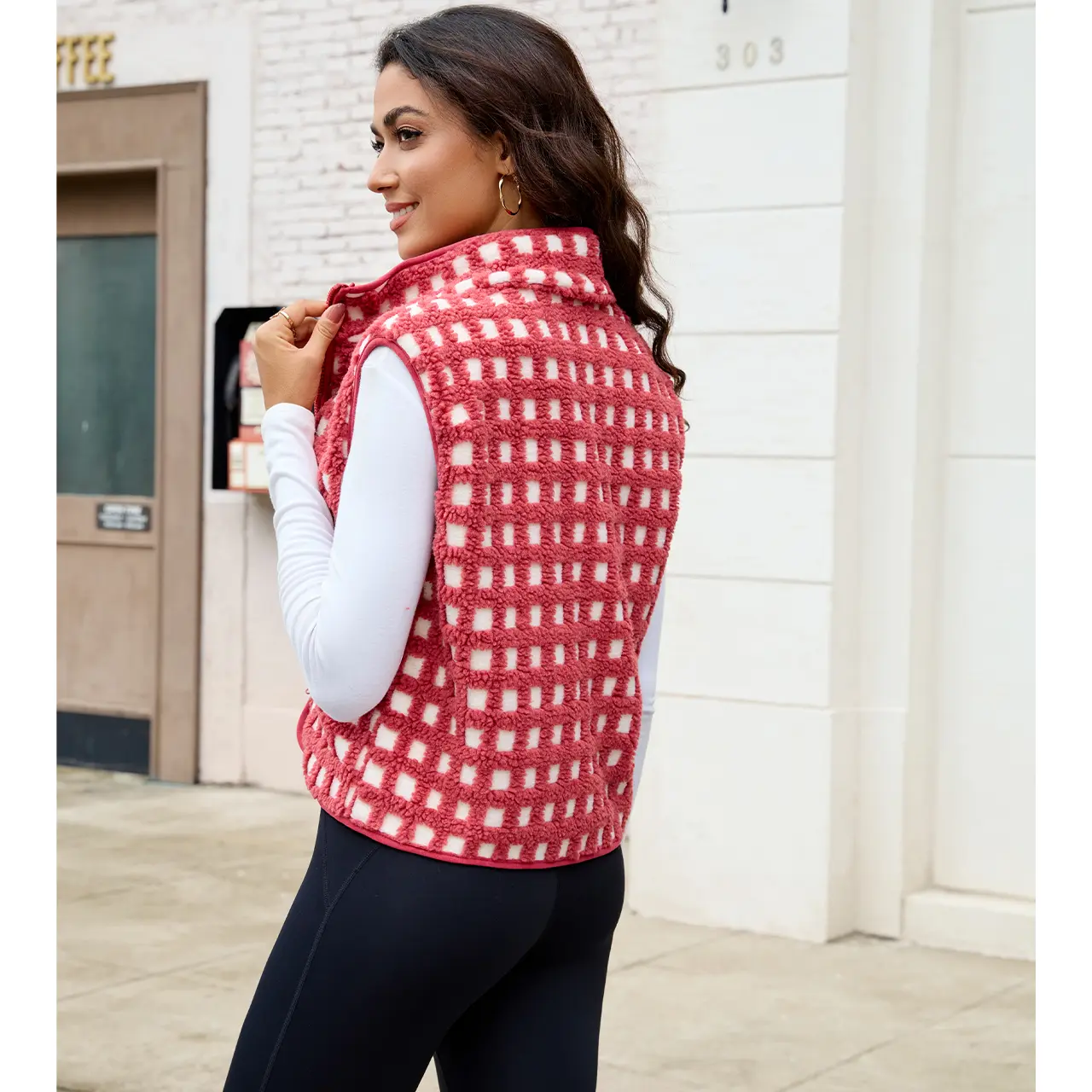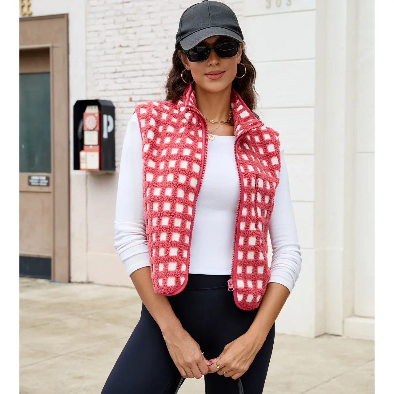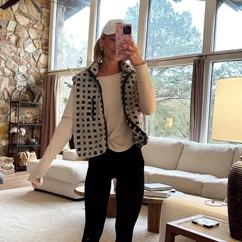 Feature: Trendy fleece vest for women, women plaid sherpa vest, sleeveless, high collar, chest pockets, loose fit, oversize, zip up, winter jacket