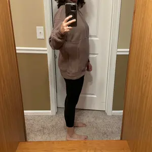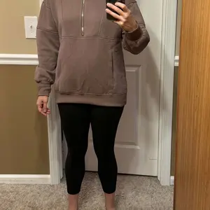 The inner hoodie kangaroo pocket is not sewn to the actual sweater it floats, and it creates weird creasing in the front of the sweater by the stomach when you wear it. It’s also a very light brown, like a taupe. It’s a thin quality, but still looks like it’s made well other than that.