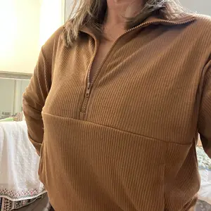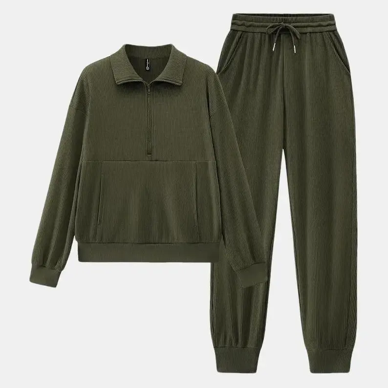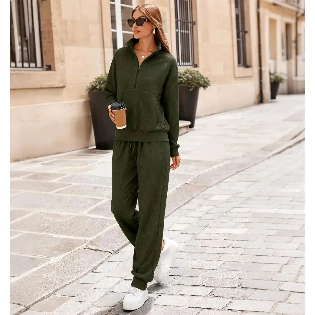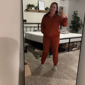 This lounge set is amazing! I am 5’5 and 160#. I ordered a medium in hunter green and it fits me perfectly. It’s made of a ribbed material that is so soft and comfy. The top is 1/2 zip with pockets that connect into one big pocket. The pants are cuffed at the bottom, have a drawstring waist, and have pockets. I would highly recommend these lounge sets to anyone! I will definitely be getting it in more colors!
