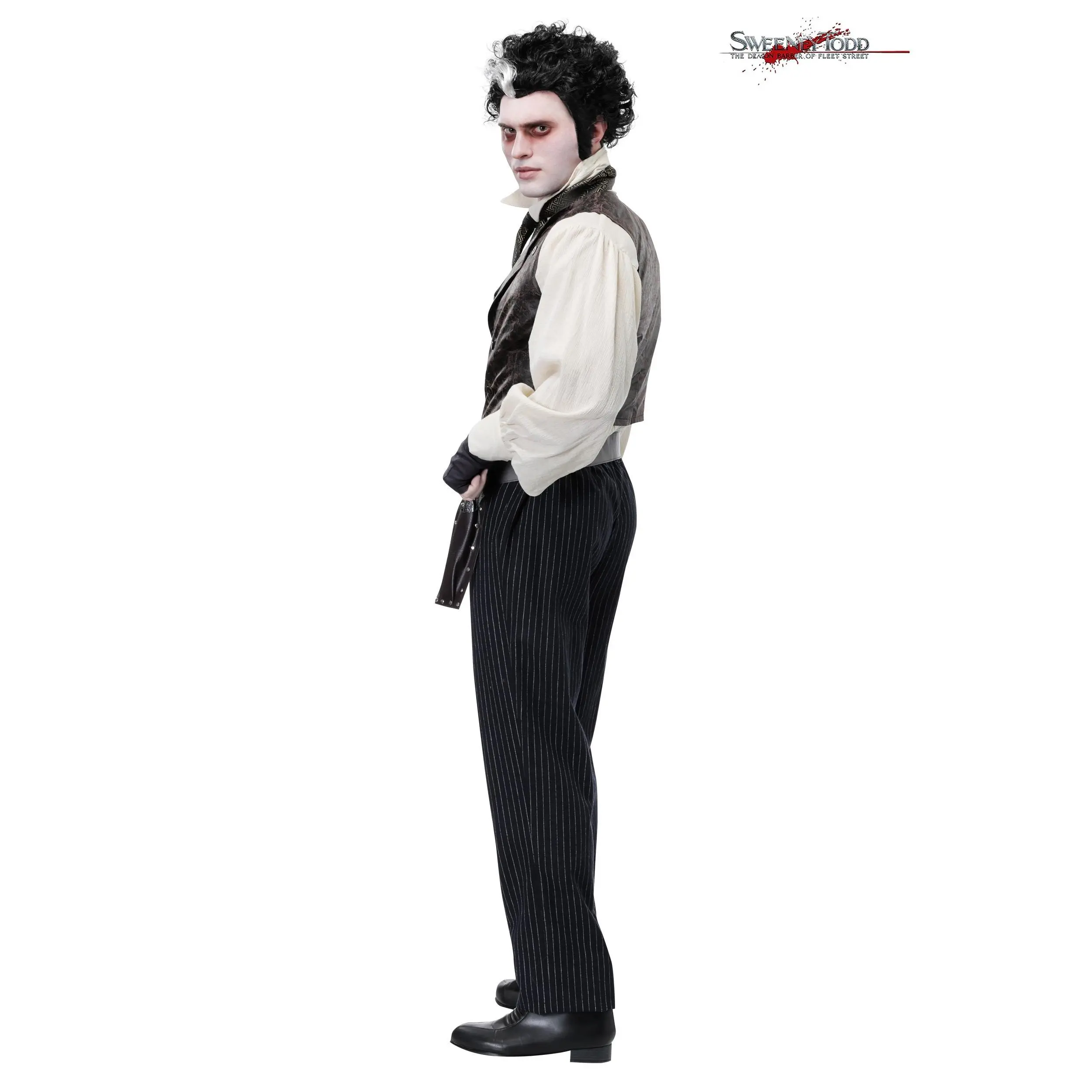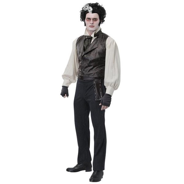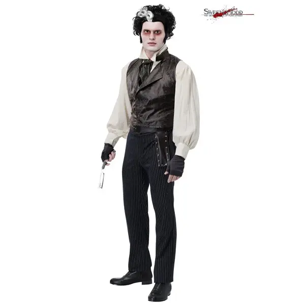 You don't have to go into business to become the demon barber of Fleet Street, just don this exclusive costume. You'll look like a truly unhinged Londoner in the full sleeves, leather textured vest, and cravat. With a holster to keep your sharp friends in you'll be ready for when that judge finally stops in for a shave. Tell him to keep still, it's going to be a close one!
