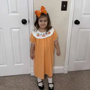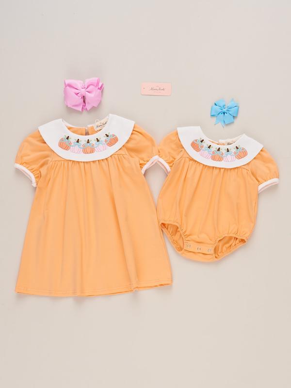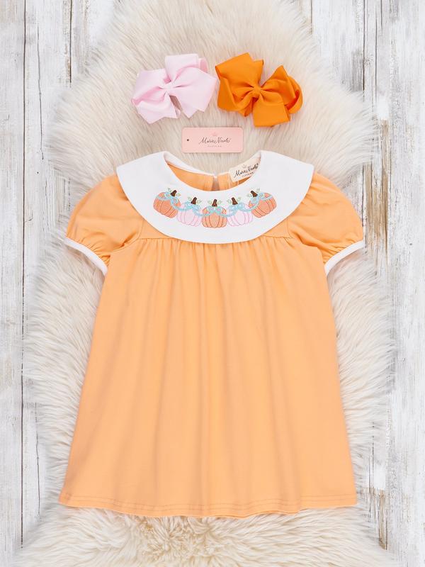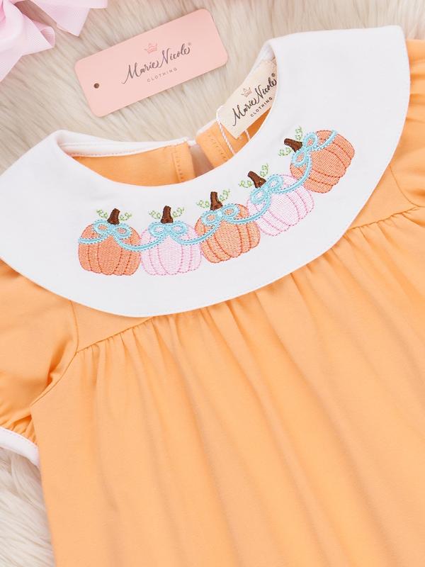 Bring sweet, autumn charm to any fall gathering with the Sweet as Pumpkin Pie Embroidered Dress! This piece from Marie Nicole Clothing stays classic with timeless fall orange and an all-around collar, accentuated with embroidered pumpkins and bows. Crafted with soft and comfortable fabric, your child will look and feel beautiful at any autumn celebration or Thanksgiving dinner in this dress.