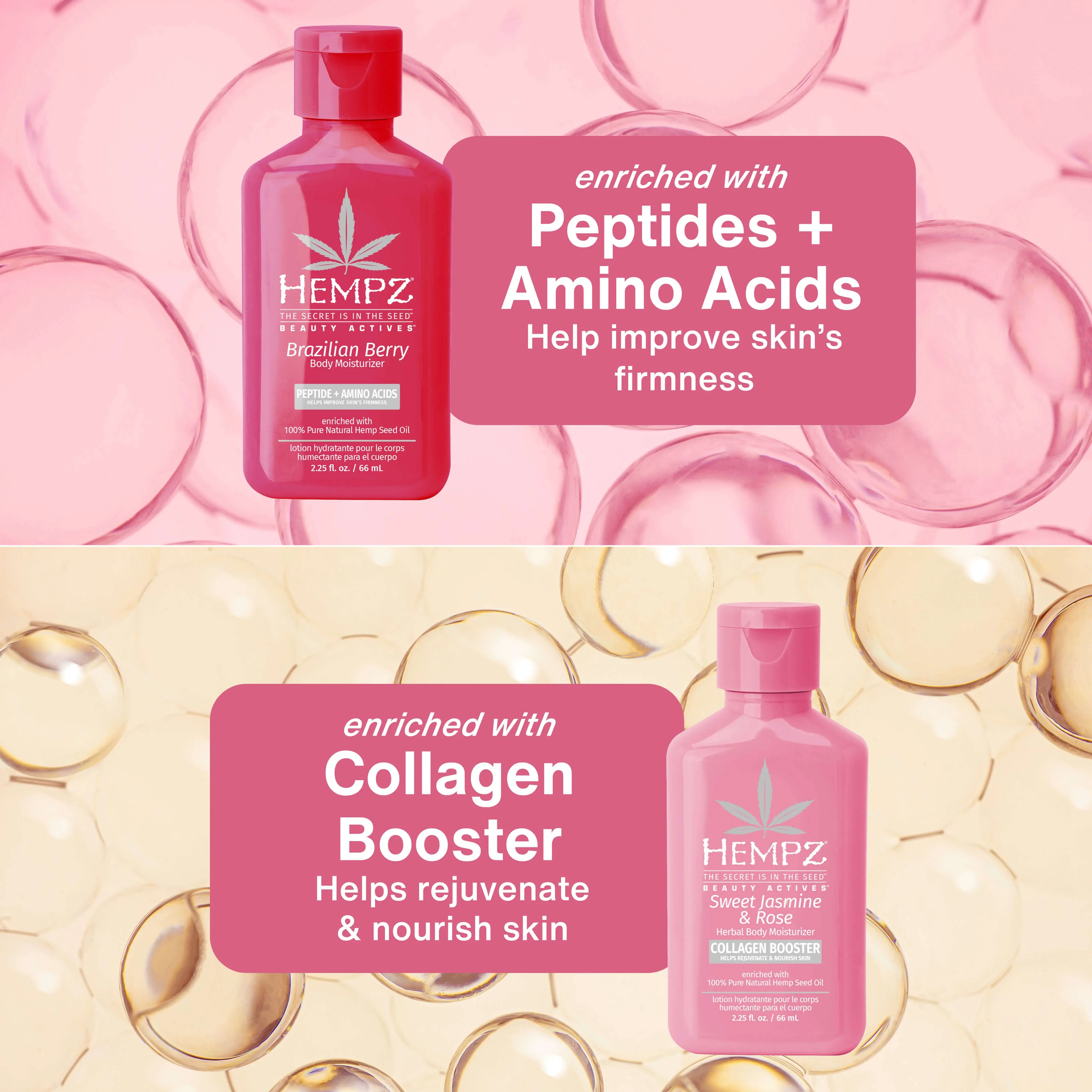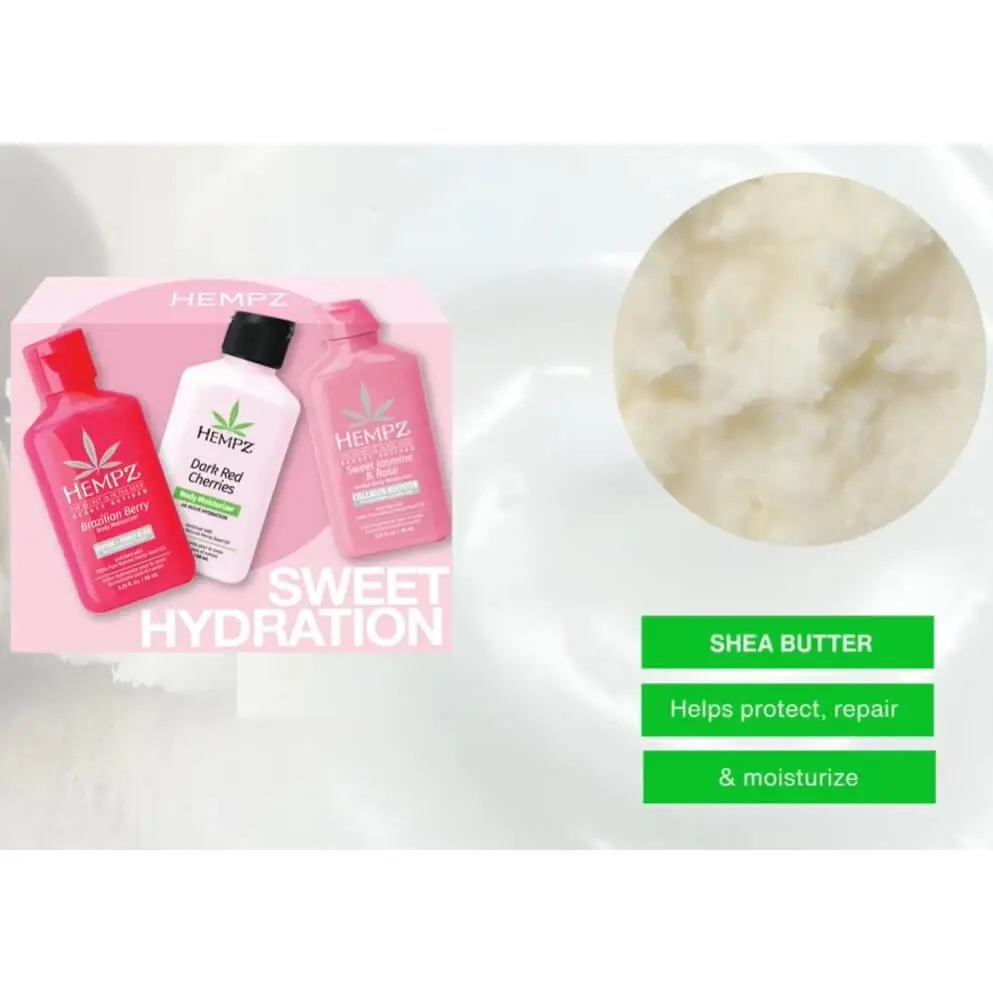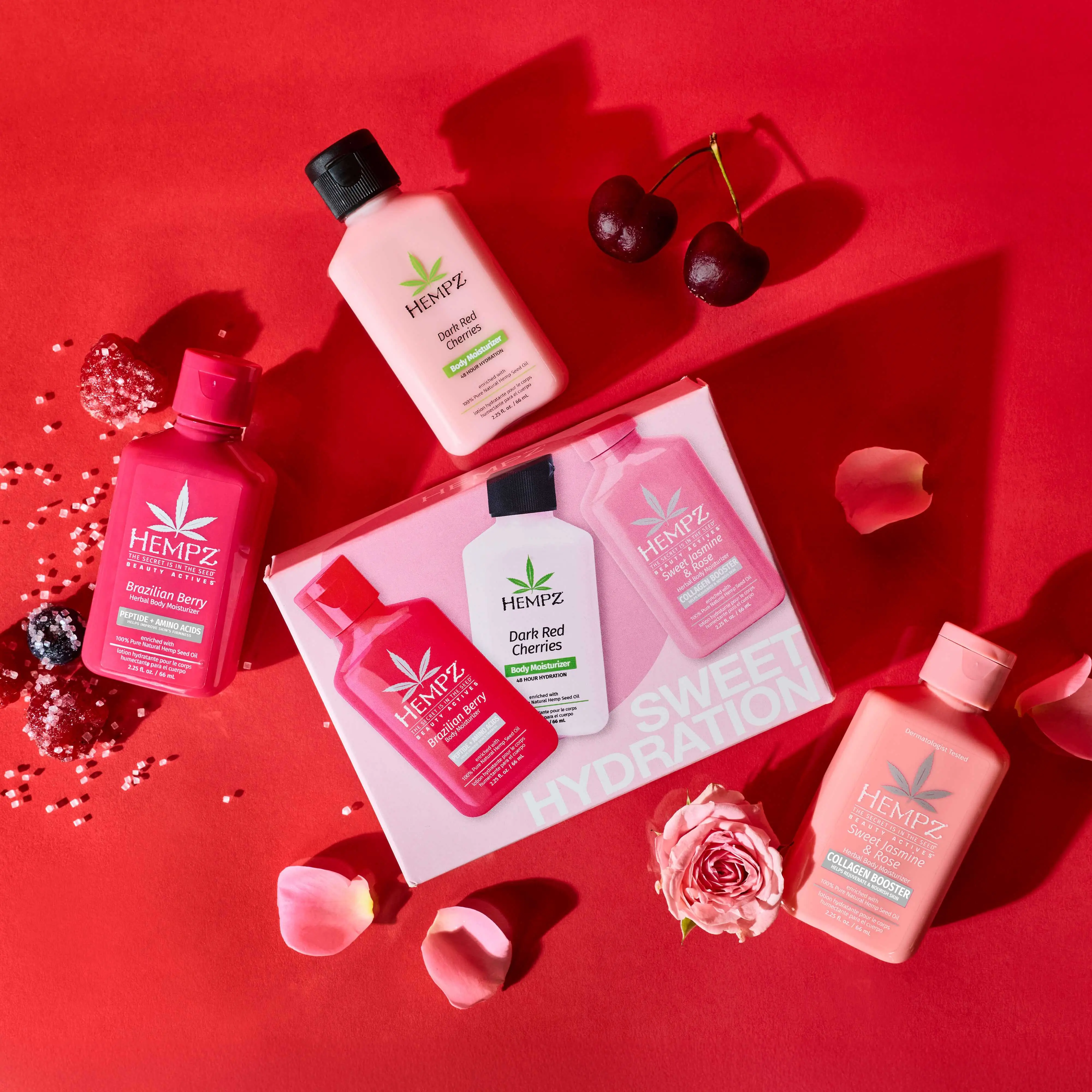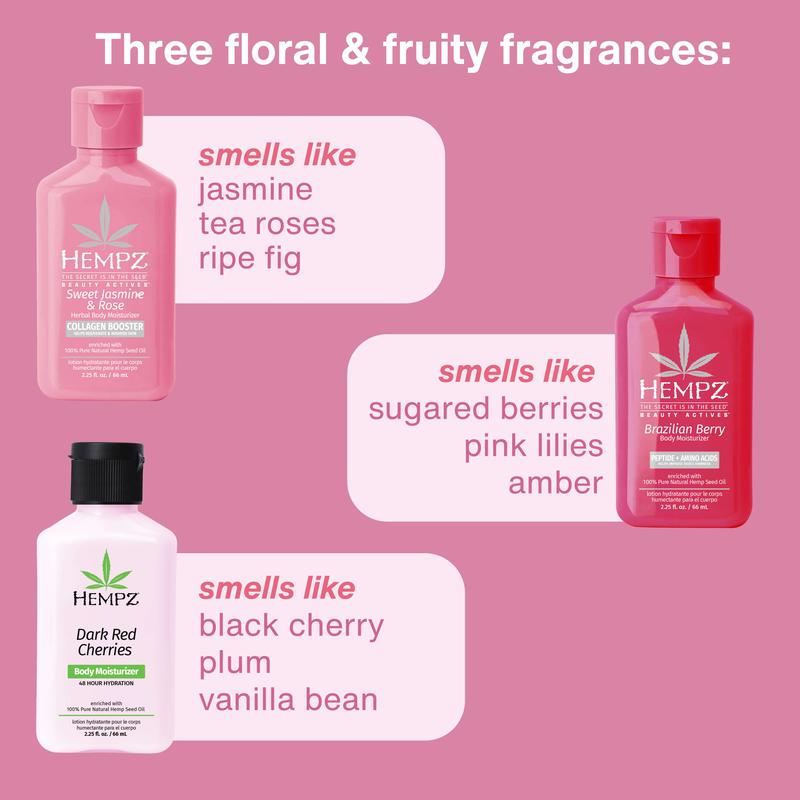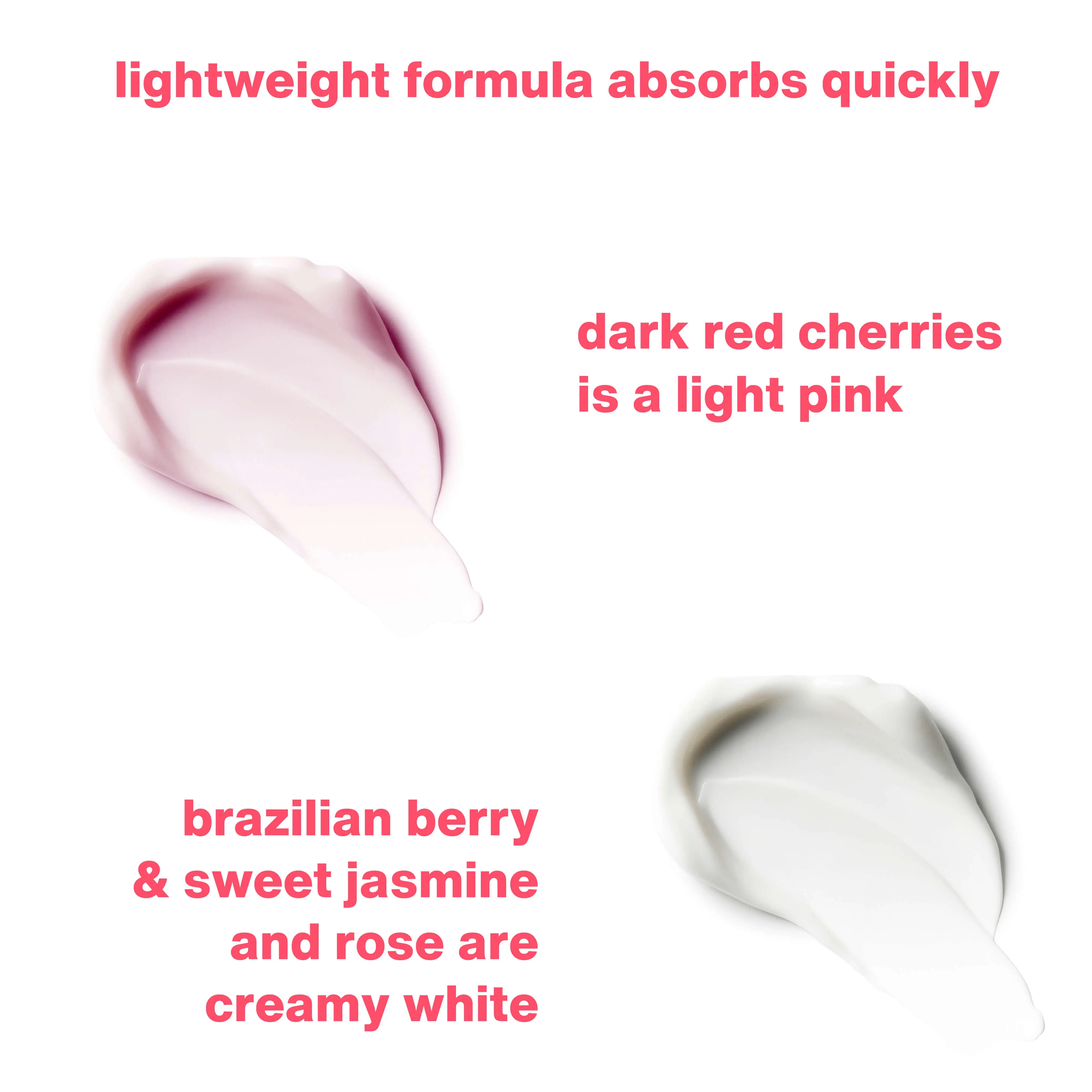 | Ingredients | BRAZILIAN BERRY Water/Aqua/Eau, Isopropyl Palmitate, Butylene Glycol, Propanediol, Glycerin, Butyrospermum Parkii (Shea) Butter, Dimethicone, Sorbitan Stearate, Fragrance (Parfum), Stearic Acid, Glyceryl Stearate, PEG-100 Stearate, Cannabis Sativa Seed Oil, Pisum Sativum (Pea) Peptide, Acetyl Hexapeptide-8, Euterpe Oleracea Fruit Extract, Orbignya Speciosa Kernel Oil, Aloe Barbadensis Leaf Juice, Astrocaryum Murumuru Seed Butter, Sodium PCA, Arginine, Glycine, Histidine, Leuconostoc/Radish Root Ferment Filtrate, Phenoxyethanol, Cetyl Alcohol, Alanine, Serine, Valine, Isoleucine, Proline, Threonine, Polysorbate 40, Nylon-12, Carbomer, Chlorphenesin, Aminomethyl Propanol, Ethylhexylglycerin, Trisodium Ethylenediamine Disuccinate, Limonene, Hexyl Cinnamal, Sodium Lactate, Linalool, Alpha-Isomethyl Ionone, Aspartic Acid, PCA, Coumarin, Ascorbic Acid, Tocopheryl Acetate, Phospholipids, Pantothenic Acid, Citric Acid, Potassium Sorbate, Acetic Acid, Sodium Benzoate, TBHQ, Tetramethyl Acetyloctahydronaphthalenes, Dimethyl Phenethyl Acetate, Vanillin, Phenylalanine, Rose Ketones Water/Aqua/Eau, Isopropyl Palmitate, Butylene Glycol, Propanediol, Fragrance (Parfum), Glycerin, Butyrospermum Parkii (Shea) Butter, Dimethicone, Sorbitan Stearate, Stearic Acid, Glyceryl Stearate, PEG-100 Stearate, Cannabis Sativa Seed Oil, Aloe Barbadensis Leaf Juice, Prunus Avium (Sweet Cherry) Fruit Extract, Tocopheryl Acetate, Panthenol, Phenoxyethanol, Cetyl Alcohol, Polysorbate 40, Nylon-12, Carbomer, Chlorphenesin, Ethylhexylglycerin, Aminomethyl Propanol, Trisodium Ethylenediamine Disuccinate, Coumarin, Hydroxycitronellal, Benzyl Benzoate, Linalool, Citronellol, Limonene, Alpha-Isomethyl Ionone, Red 40 (CI 16035), Ascorbic Acid, Citric Acid, Potassium Sorbate, Sodium Benzoate SWEET JASMINE Water/Aqua/Eau, Isopropyl Palmitate, Butylene Glycol, Propanediol, Glycerin, Butyrospermum Parkii (Shea) Butter, Dimethicone, Fragrance (Parfum), Sorbitan Stearate, Stearic Acid, Glyceryl Stearate, PEG-100 |