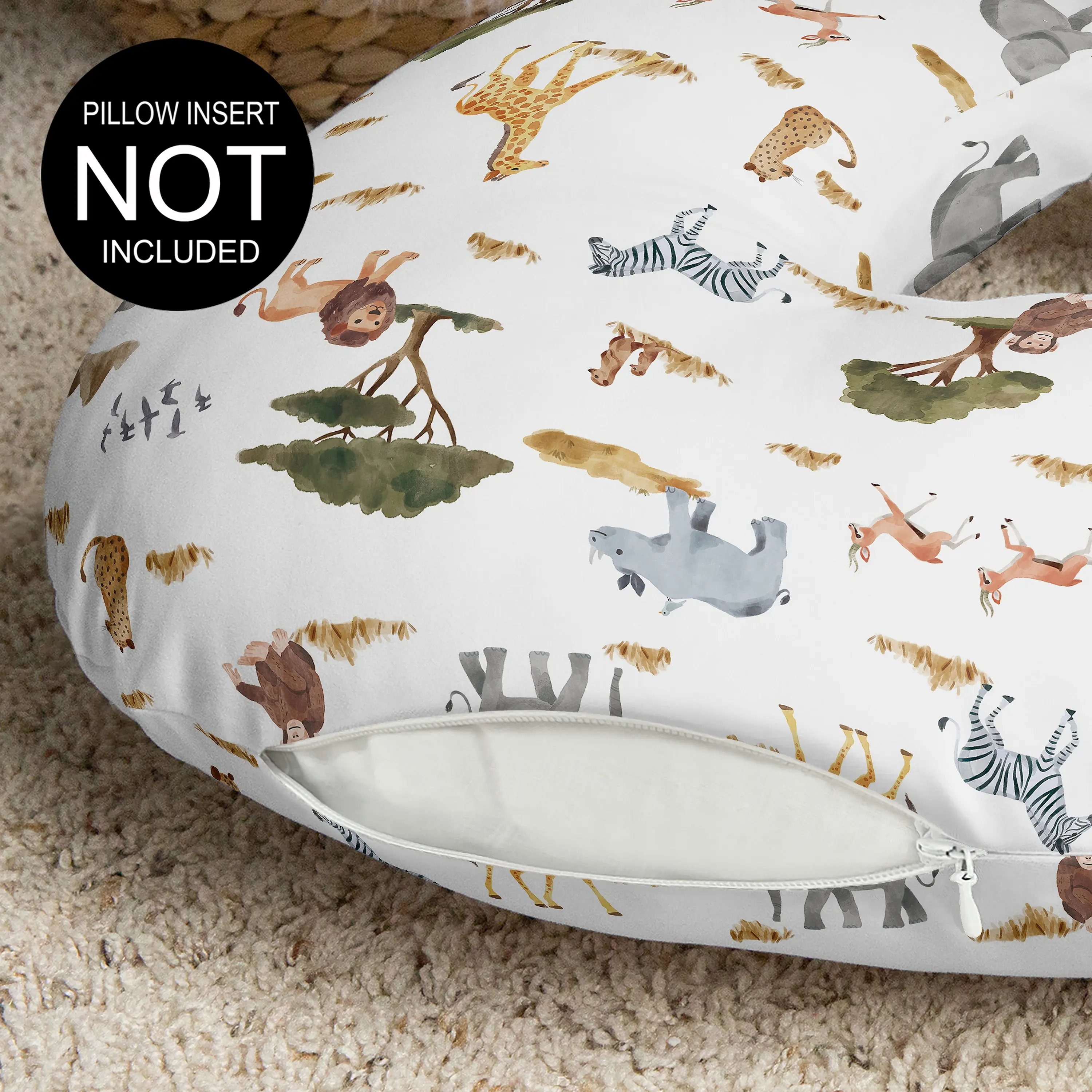 Protect your nursing pillow with a Sweet Jojo Designs nursing pillow cover. We've put extra thought into the design to ensure that our breastfeeding pillow covers are easy to slip on and off your standard nursing pillow for washes as needed. Each features a hidden zipper and uses our exclusive stretchy jersey fabrics to coordinate with our crib bedding sets, crib sheets, changing pad covers, and room decor accessories to give you a complete look for your nursery. Our versatile slipcovers fits most standard nursing pillows which help care takers hold your baby during feedings and will support your little one during supervised awake time as they grow and experience first year milestones. Our feeding and infant support pillowcases are made from soft durable fabrics and are machine washable, so no matter what messes may happen, you can easily wash it off in your regular washing cycle. They also make the perfect baby shower gift for parents welcoming a new addition to their family. 25.25 in. x 17.25 in. – Cover Fits Most Standard Shaped Nursing Pillows COVER ONLY – PILLOW NOT INCLUDED 95% Rayon/5% Spandex Jersey Stretch Knit featuring dark hunter green, gray, yellow, rust orange, black and white boho wildlife safari animal grey elephant giraffe lion monkey leopard cheetah zebra bird jungle animals print Hidden Zipper for Style and Comfort. Machine wash cold, tumble dry low. Please note: Nursing pillows are NOT intended for sleep. They should only be used while baby is awake and being supervised by an adult.
