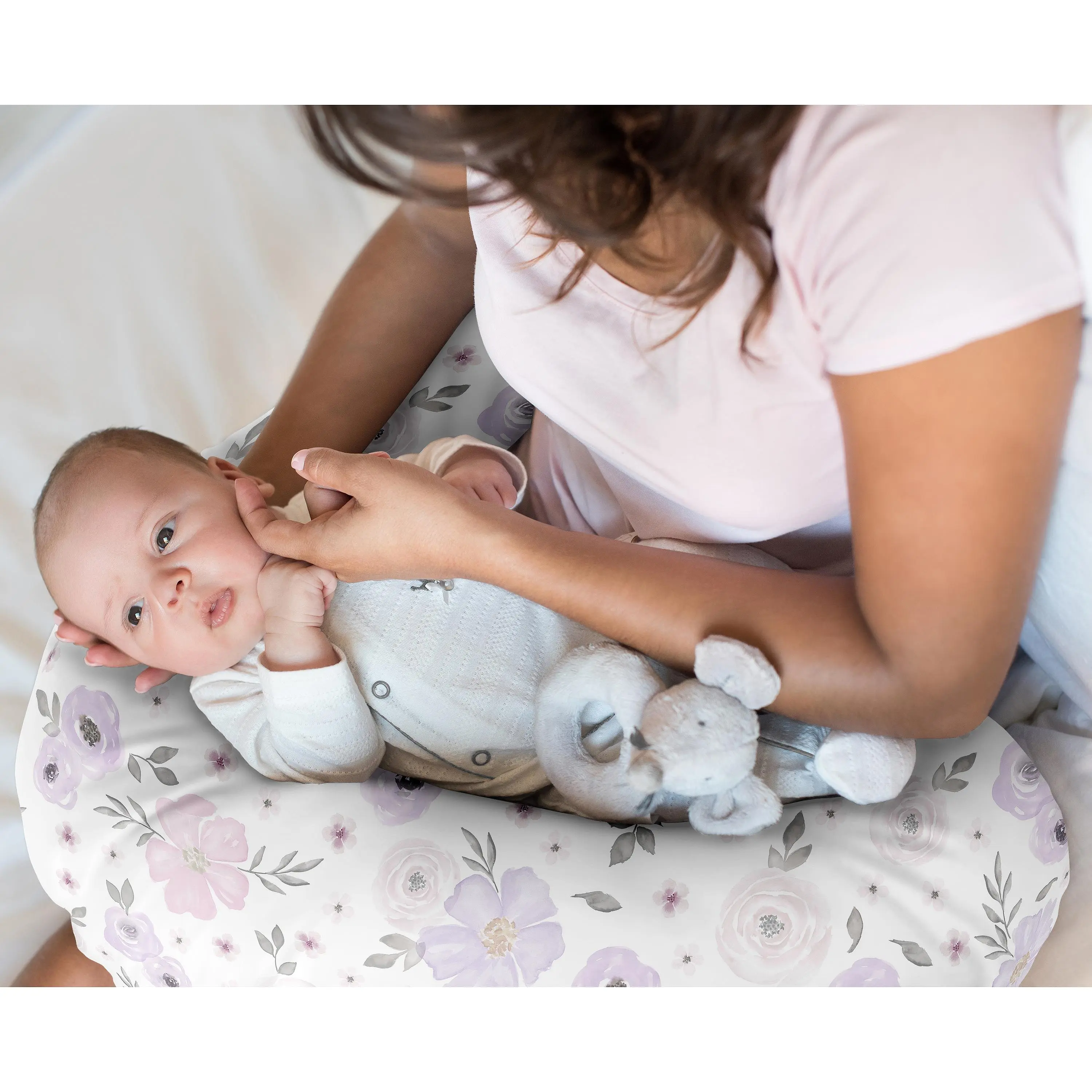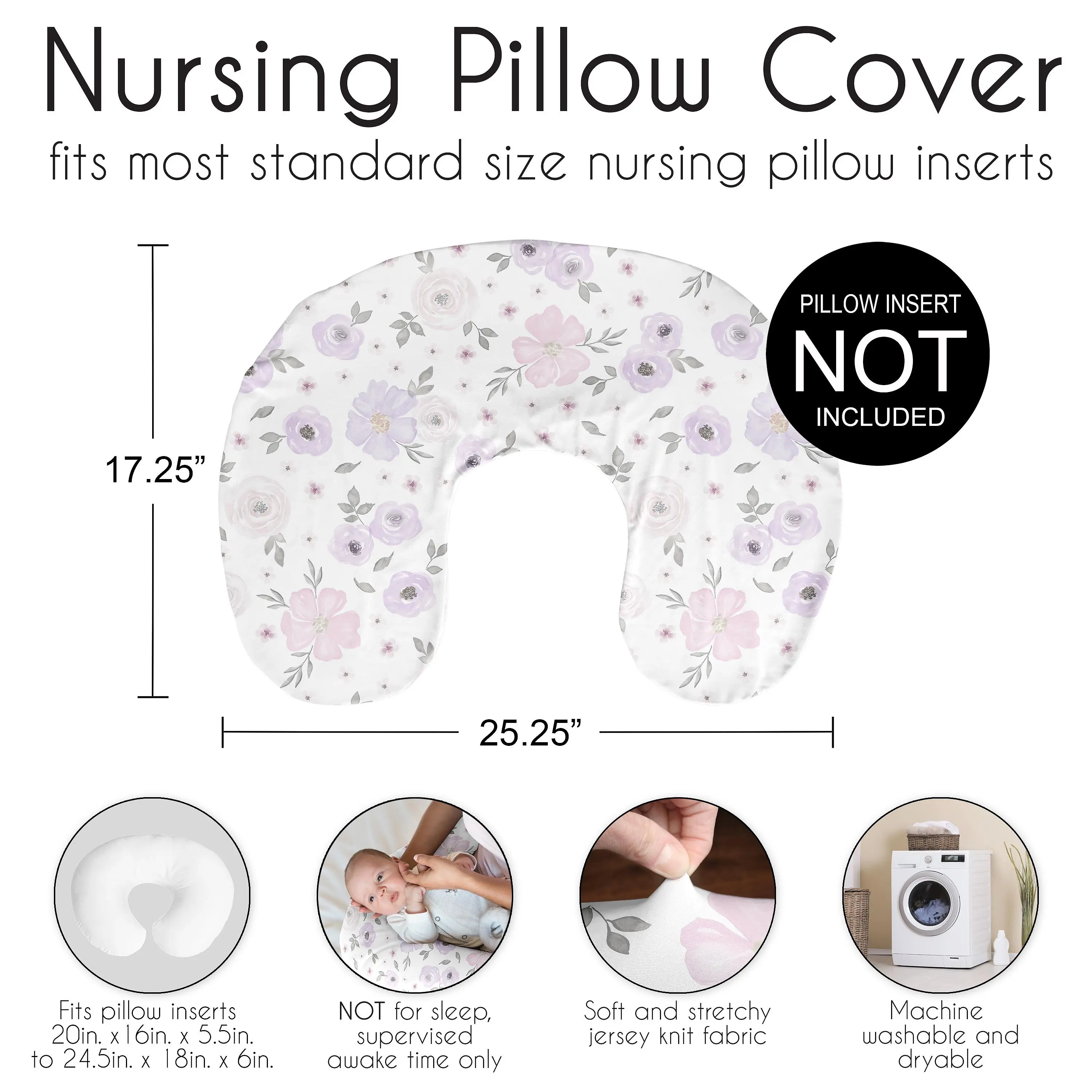 Protect your nursing pillow with a Sweet Jojo Designs nursing pillow cover. We've put extra thought into the design to ensure that our breastfeeding pillow covers are easy to slip on and off your standard nursing pillow for washes as needed. Each features a hidden zipper and uses our exclusive stretchy jersey fabrics to coordinate with our crib bedding sets, crib sheets, changing pad covers, and room decor accessories to give you a complete look for your nursery. Our versatile slipcovers fits most standard nursing pillows which help care takers hold your baby during feedings and will support your little one during supervised awake time as they grow and experience first year milestones. Our feeding and infant support pillowcases are made from soft durable fabrics and are machine washable, so no matter what messes may happen, you can easily wash it off in your regular washing cycle. They also make the perfect baby shower gift for parents welcoming a new addition to their family. 25.25 in. x 17.25 in. – Cover Fits Most Standard Shaped Nursing Pillows COVER ONLY – PILLOW NOT INCLUDED 95% Rayon / 5% Spandex Jersey Stretch Knit featuring lavender purple, pink and grey watercolor floral flowers Hidden Zipper for Style and Comfort. Machine wash cold, tumble dry low. Please note: Nursing pillows are NOT intended for sleep. They should only be used while baby is awake and being supervised by an adult.
