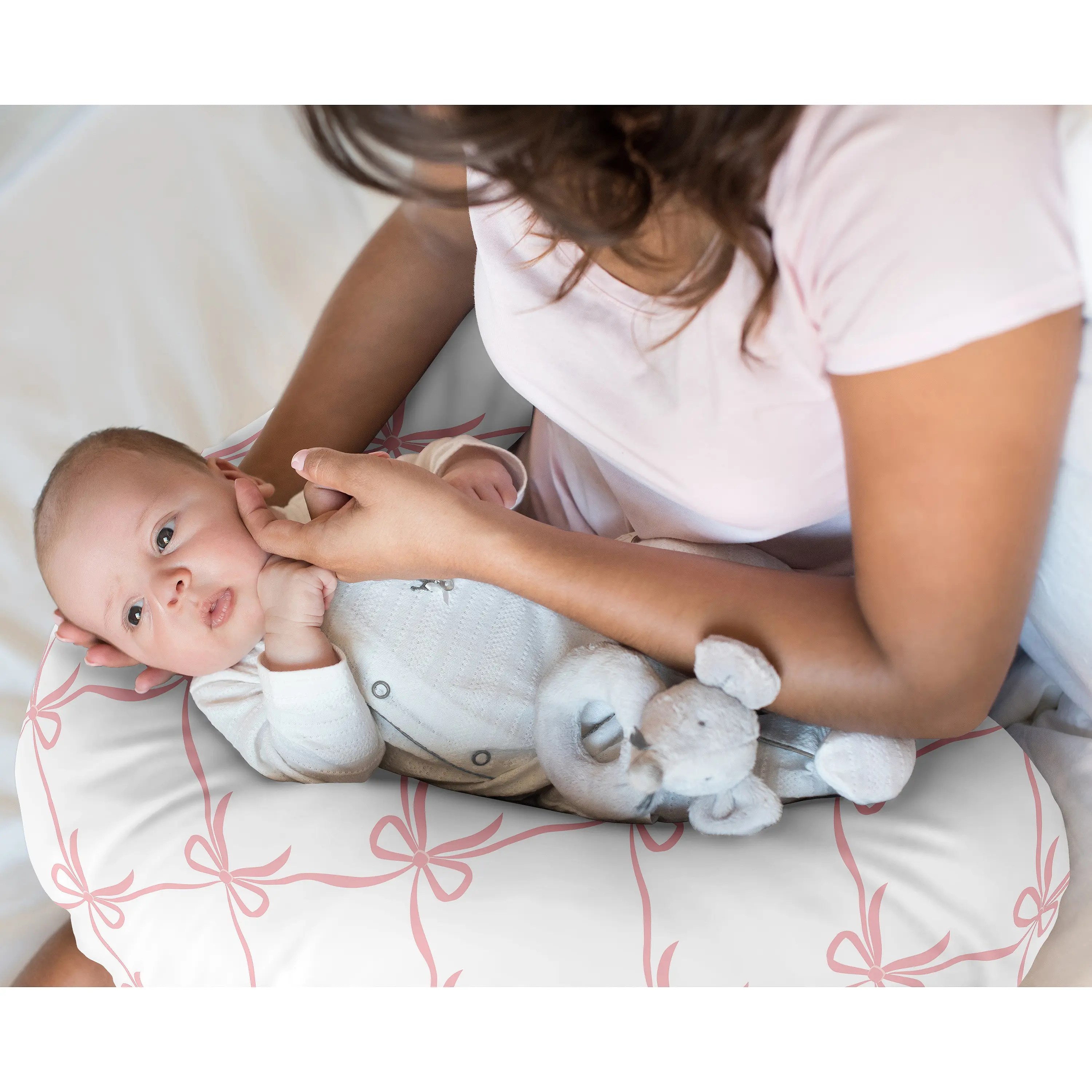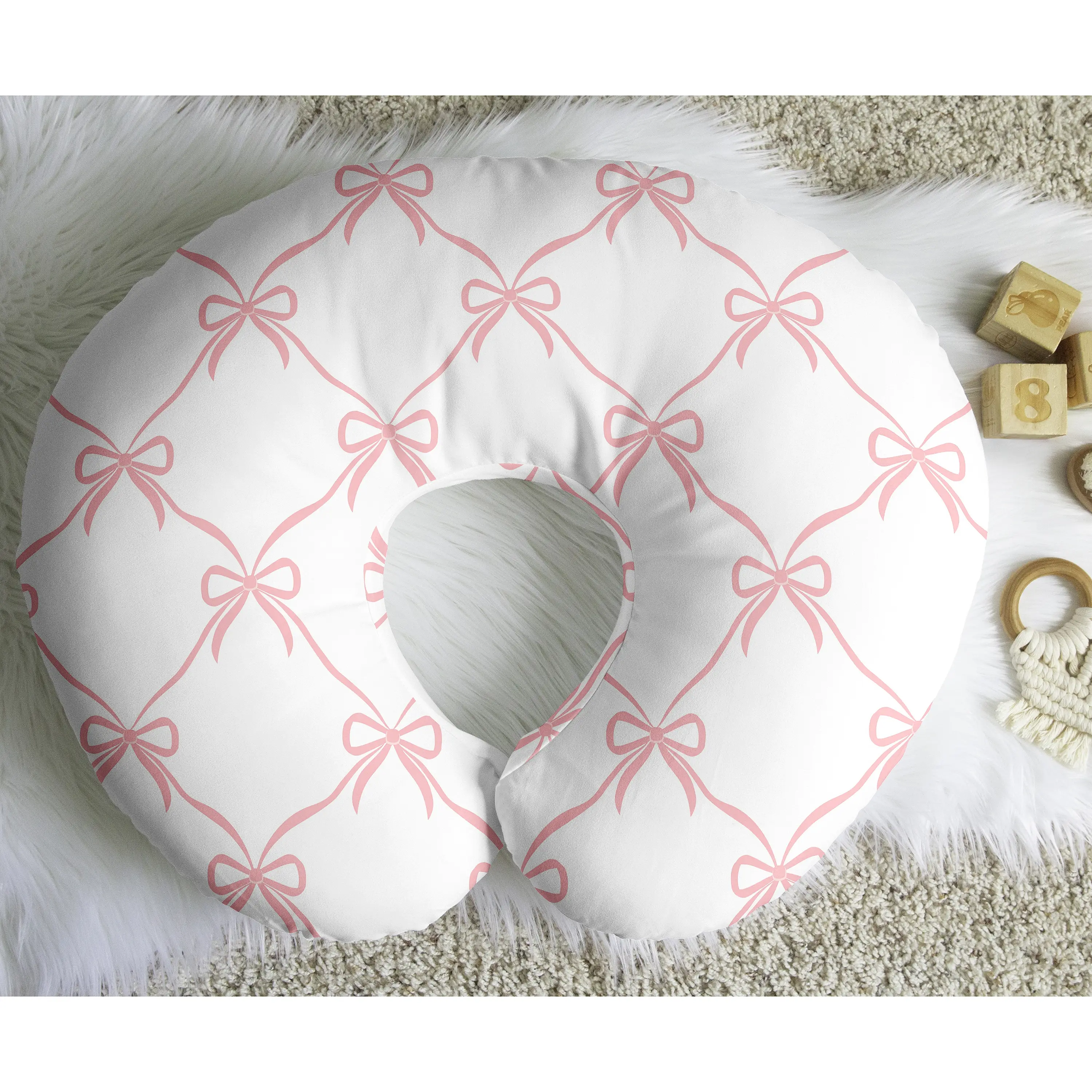 Protect your nursing pillow with a Sweet Jojo Designs nursing pillow cover. Designed with comfortable and snuggly fabrics, this nursing baby pillow cover is a must have newborn essential and the best addition to any baby room. We’ve put extra thought to include a hidden zipper in each infant pillow cover to ensure that they are easy to slip on and off your standard nursing pillow for washes as needed. Each nursing pillow slip cover is made with stretchy jersey fabric to coordinate perfectly with our exclusive patterns and designs of crib bedding sets, swaddle blankets, and room decor accessories to complete the look of your nursery theme. Our versatile slipcovers fits most standard nursing pillows which help care takers hold your baby during feedings and will support your little one during supervised awake time as they grow and experience first year milestones. Our feeding and infant support pillowcases are made from soft durable fabrics and are machine washable, so no matter what messes may happen, you can easily wash it off in your regular washing cycle. They also make the perfect baby shower gift for parents welcoming a new addition to their family.Includes: (1) Nursing Pillow Cover: 25.25 in. x 17.25 in. COVER ONLY – PILLOW NOT INCLUDED. Fits most standard nursing pillows. Materials: 95% Rayon / 5% Spandex Jersey Stretch Knit. Machine wash cold, tumble dry low.This baby nursing pillow cover is designed using a blush and white shabby chic dancer princess bows print.Add a breastfeeding pillow slipcover to a standard nursing pillow in your infant room to help parents, guardians, care takers, babysitters, and grandparents during meal time with your bundle of joy or use it with your newborn during supervised hand-free play or tummy time. Keep one always within reach in your nursery or newborn room when it’s time for some quality time with your special little one. Covers with fun designs are visually stimulating and offer an adorable back drop for photos.Purchase multiple washable slipcovers so you can use the easily hidden zipper on each one to change designs based on whatever theme suits your space. And when a spill or spit up happens on your bottle feeding cover, extra covers are easy to swtich out while one is in the wash. Please note: Nursing pillows are NOT intended for sleep. They should only be used while baby is awake and being supervised by an adult.Makes the perfect gift to coordinate with Sweet Jojo Designs baby bedding sets, changing pad covers, crib sheets, nursery decoration accessories, window treatments and wall decor. Include it in your baby shower gift basket or gender reveal presents or add to your baby gift registry to ensure you have all you need to complete your Sweet Jojo Designs baby bed room look. Don't forget to pick out extras to leave at grandparents house for sleepovers and visits.