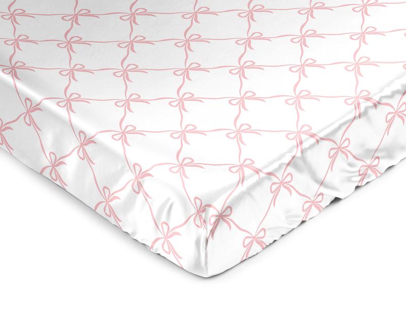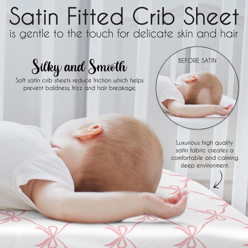 Sweet Jojo Designs satin fitted crib sheets combines the benefits of cozy soft fabrics with stylish designs to help create the ideal sleeping environment for your little one in their nursery and become your next newborn essential. Baby bad hair days are a thing of the past! Use a delicate satin crib sheet to help prevent cradle cap, baby hair loss and bald spots while also helping to reduce frizzy locks and knots. This silky smooth fabric is designed to absorb baby's natural oils to help ensure fresh glowing skin and hair for your bundle of joy while also being gentle on sensitive skin. Satin cribsheets are perfect for new parents or expecting mom and dads in need of crib fitted sheets made of unique designer fabrics in exclusive patterns and colors that match a Sweet Jojo Designs coordinating baby crib bedding set. Each crib sheet is made with a fully elastic bottom for a more secure fit on most standard size cribs and toddler beds.Includes: (1) Baby Satin Crib Mattress Sheet: 52 in. x 28 in. x 8 in.Materials: 100% Satin. Easy machine washable. Tumble dry low.This satin crib fitted sheet features an exclusive design of a blush and white shabby chic dancer princess bows print.Satin fitted crib sheets are the perfect addition to your little ones nursery. With the use of the unique and luxurious satin fabric, help reduce baby hair loss, cradle cap, frizz and tangled hair to set up the ideal environment for a comfortable night sleep for your newborn. Keep a standard satin fitted cribsheet in your infant room and grab extras to use in between washes. The fully elastic bottom ensures a secure fit on most standard size cribs and toddler mattressesMakes the perfect gift to coordinate with Sweet Jojo Designs nursery bedding, changing pad covers, nursing pillow covers, room decor accessories and layette sets. Include it in your baby shower gift basket or gender reveal presents or add to your baby gift registry to ensure you have all you need to complete your Sweet Jojo Designs baby bed room look.