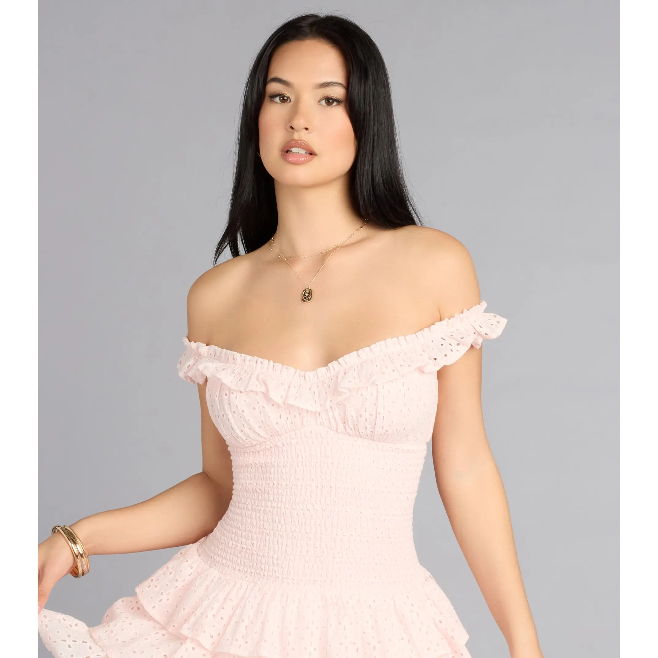 Soft, flirty, and already booked for plans. This eyelet ruffled skater dress hugs where it should, floats where you want, and brings an off-the-shoulder moment that feels effortlessly pretty.