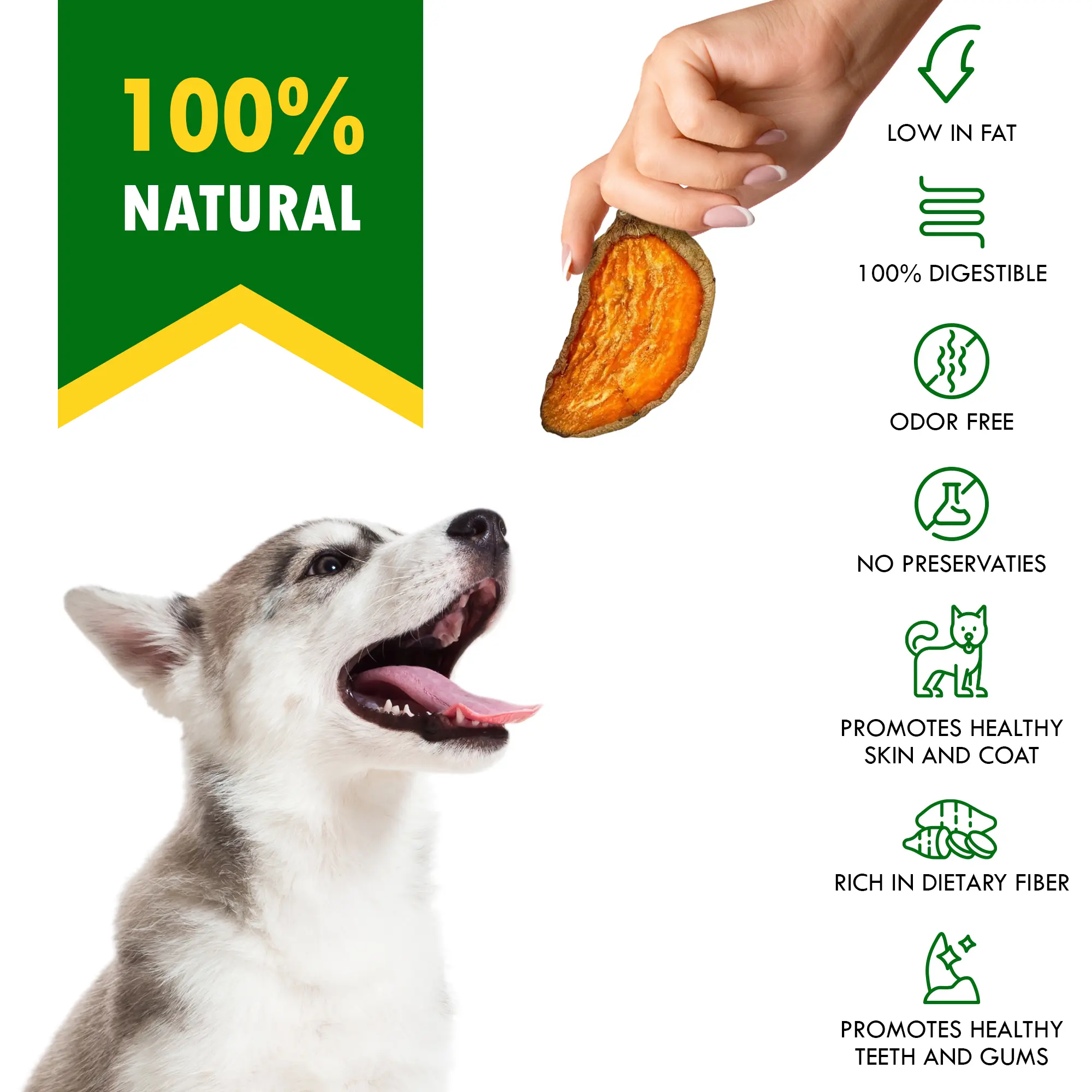 Nutrition Facts and Product Specifications: Package size: 10.6lb, Weight: 300 gr, Ingredients: 100% sweet potato, Calories per treat: 30-40 kcal, Protein: 1-2g, Fat: 0g, Fiber: 2-3g, Moisture: 10-15%, No artificial colors, flavors, or preservatives, Packaging: Resealable for freshness and convenience