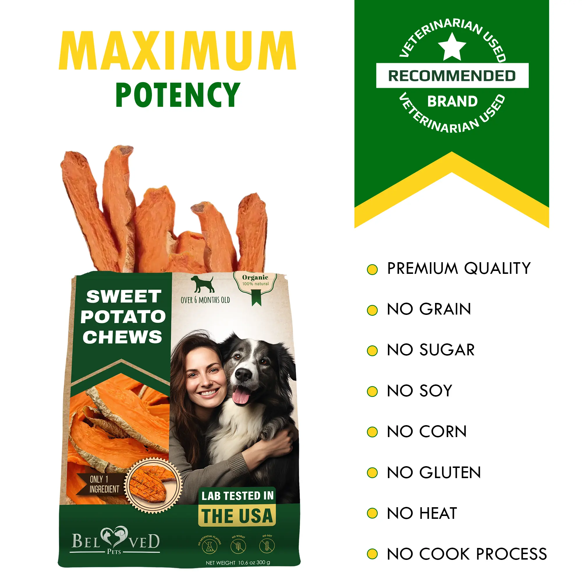 Single ingredient sweet potato dog treats: Made with 100% high-quality sweet potatoes, these chews offer a natural and healthy snack for your dog. They help reduce plaque and tartar, promote dental health, and keep jaws strong and breath fresh, making them perfect for training or rewarding your pet.
