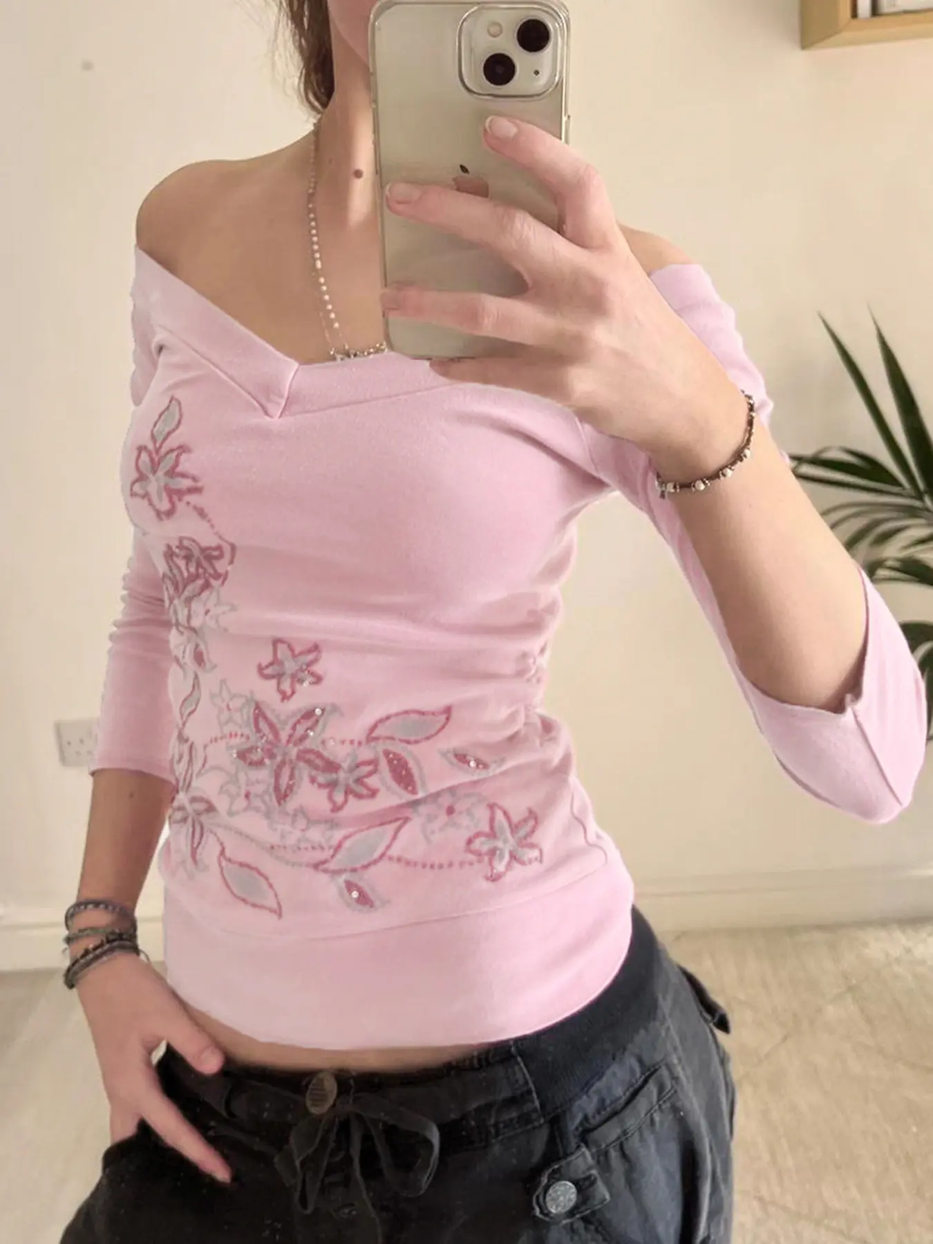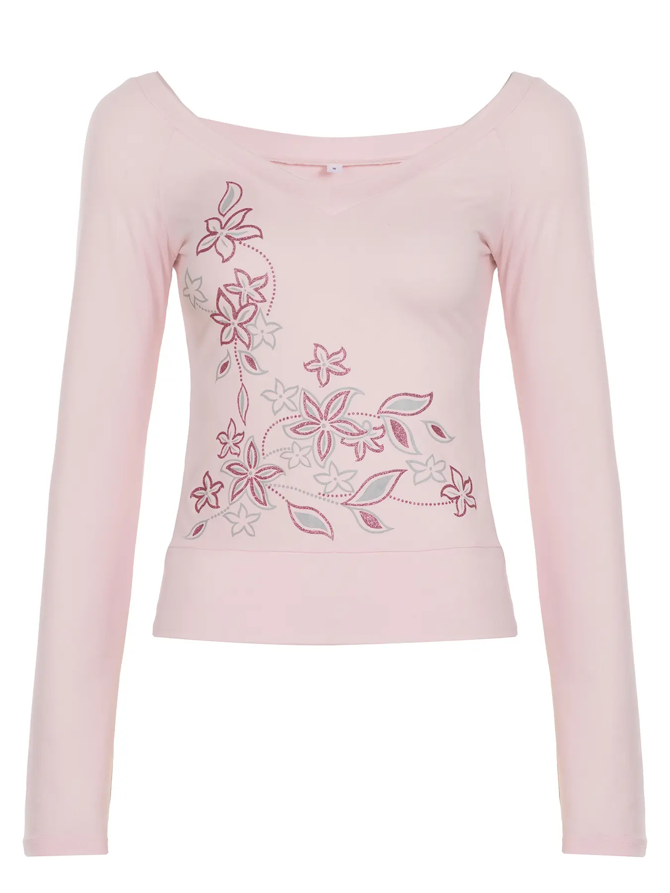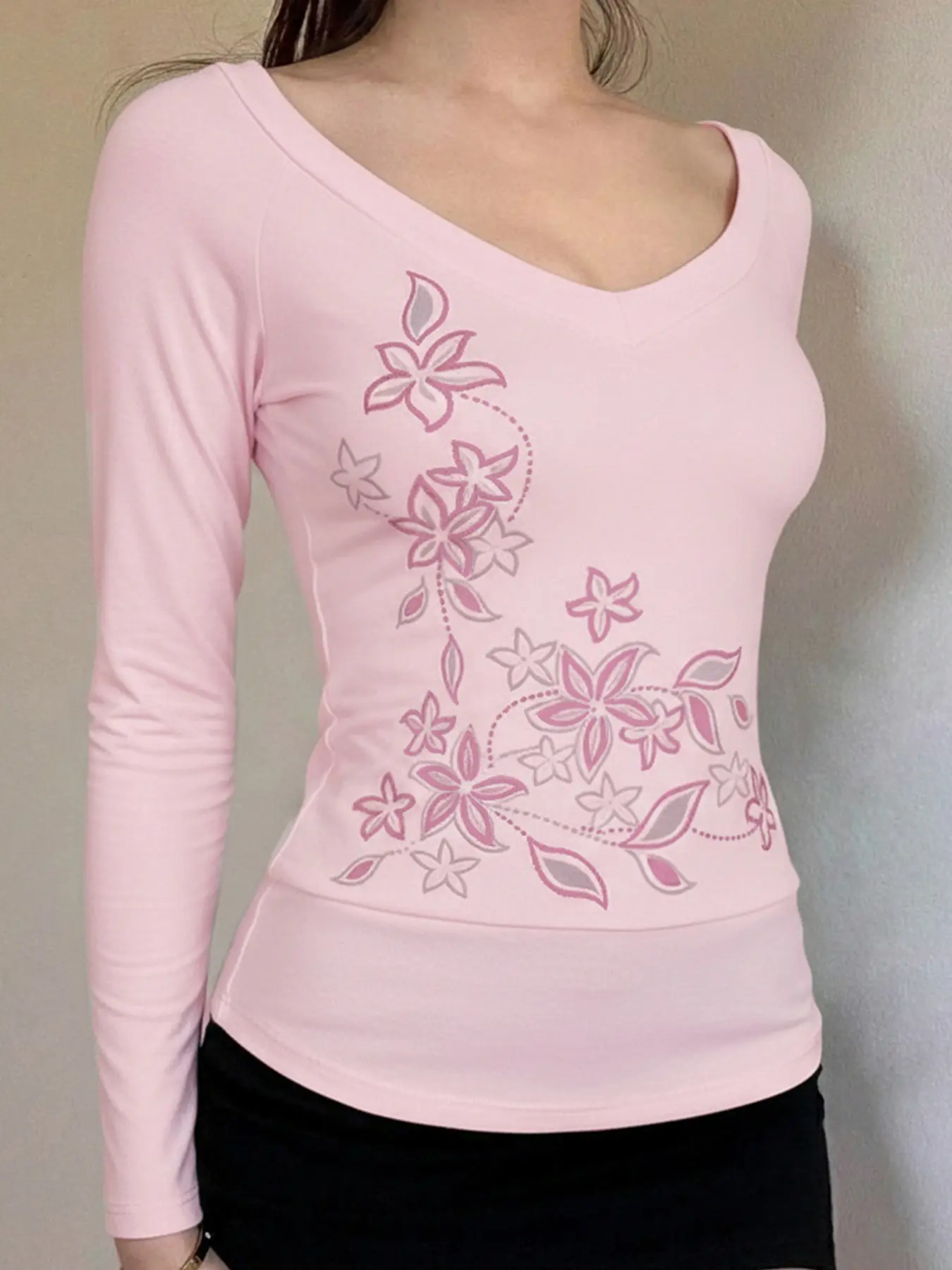 5. Sweet Slim-Fit V-Neck Floral Print Long Sleeve Top, Y2K Aesthetic College Style Casual Basic Tee, Spring & Fall Women's Fashion