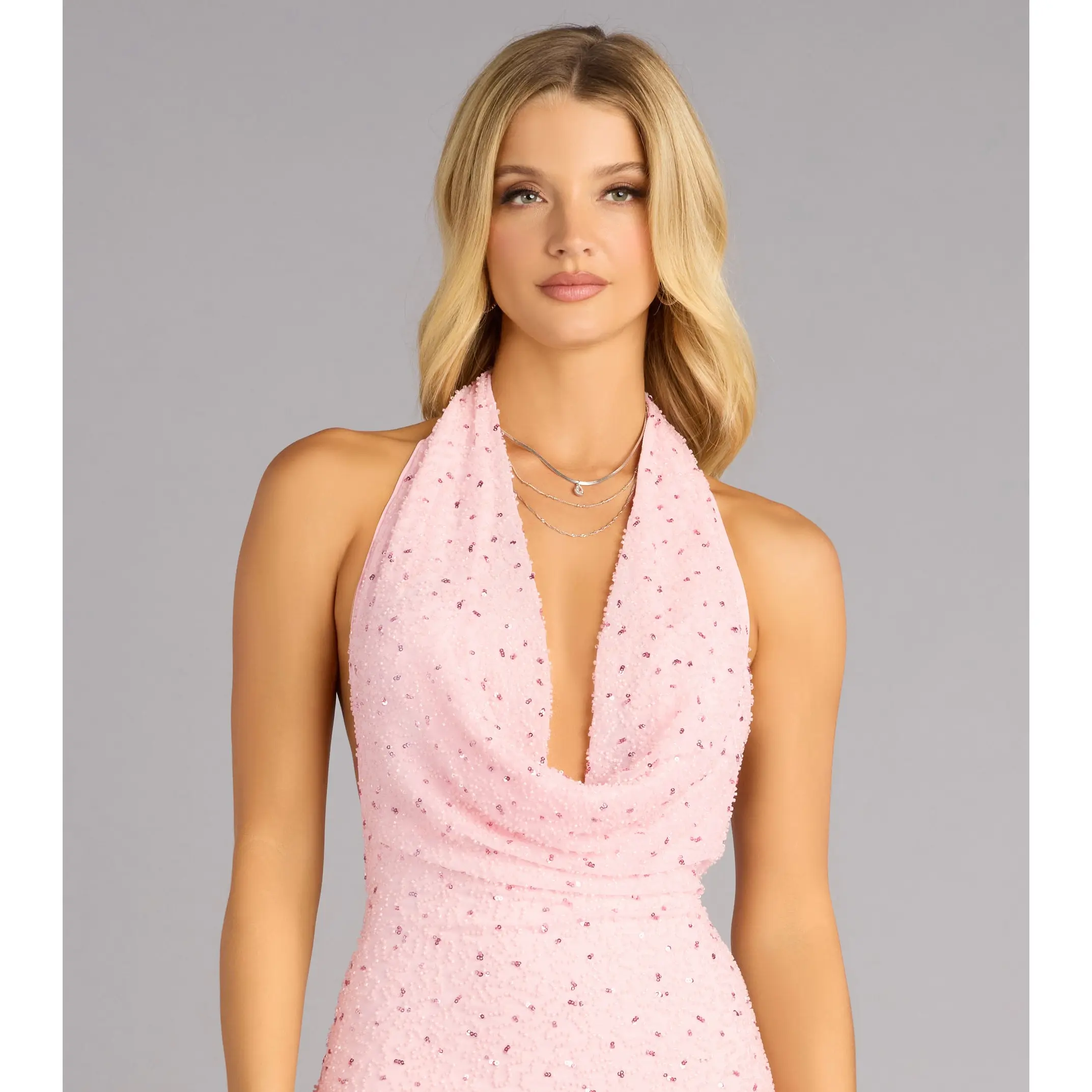 This mini dress is pure soft glam with a confident streak. The plunging halter neckline sets the tone, while subtle beading catches the light just enough to feel special without trying too hard. The open back keeps it unexpected—perfect for birthdays, bachelorettes, or any night that deserves a little extra glow.