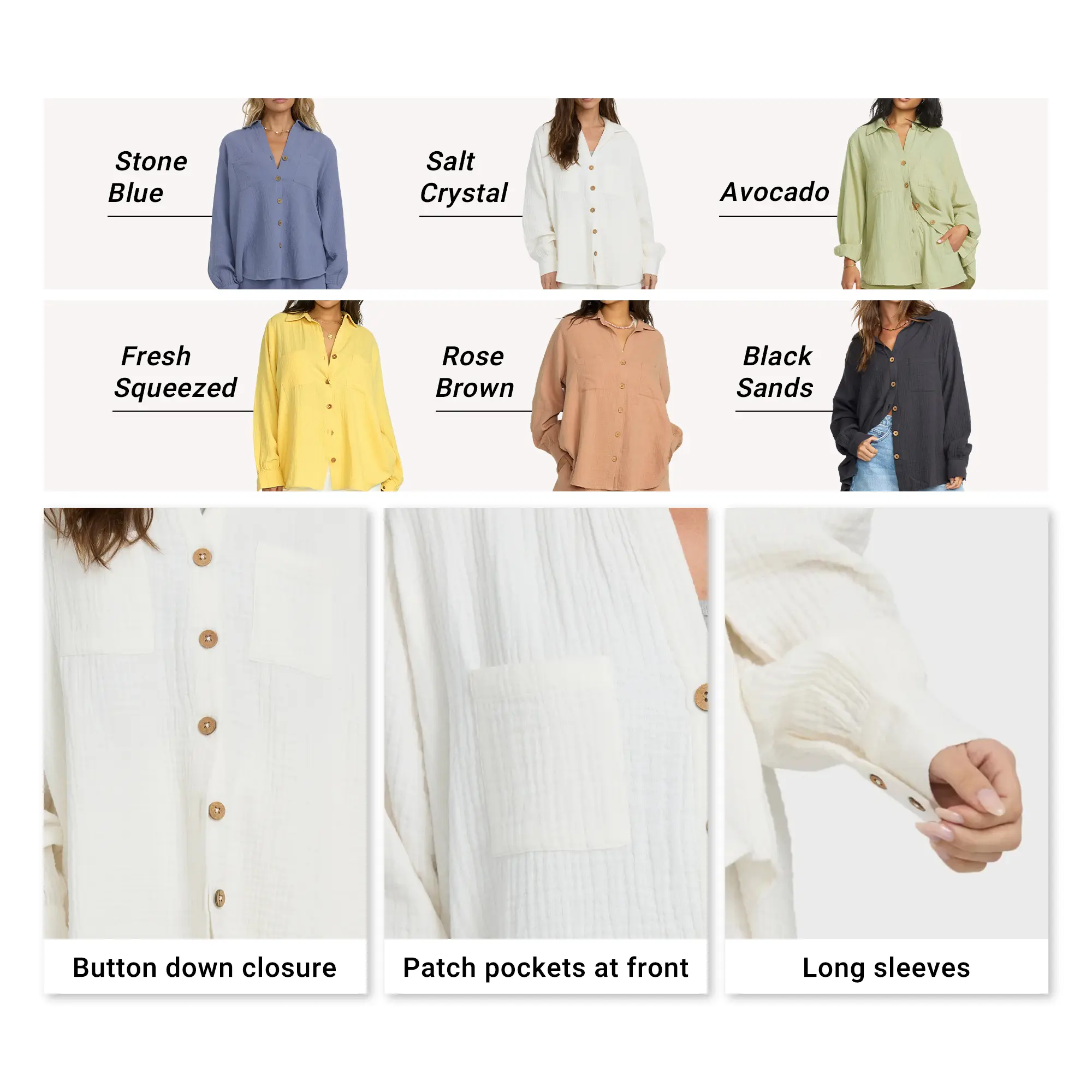 Breezy 100% cotton double gauze shirt with laid-back, oversized fit. Long sleeves, button-down closure, patch pockets, and metal plate. Featured here in the Stone Blue colorway.