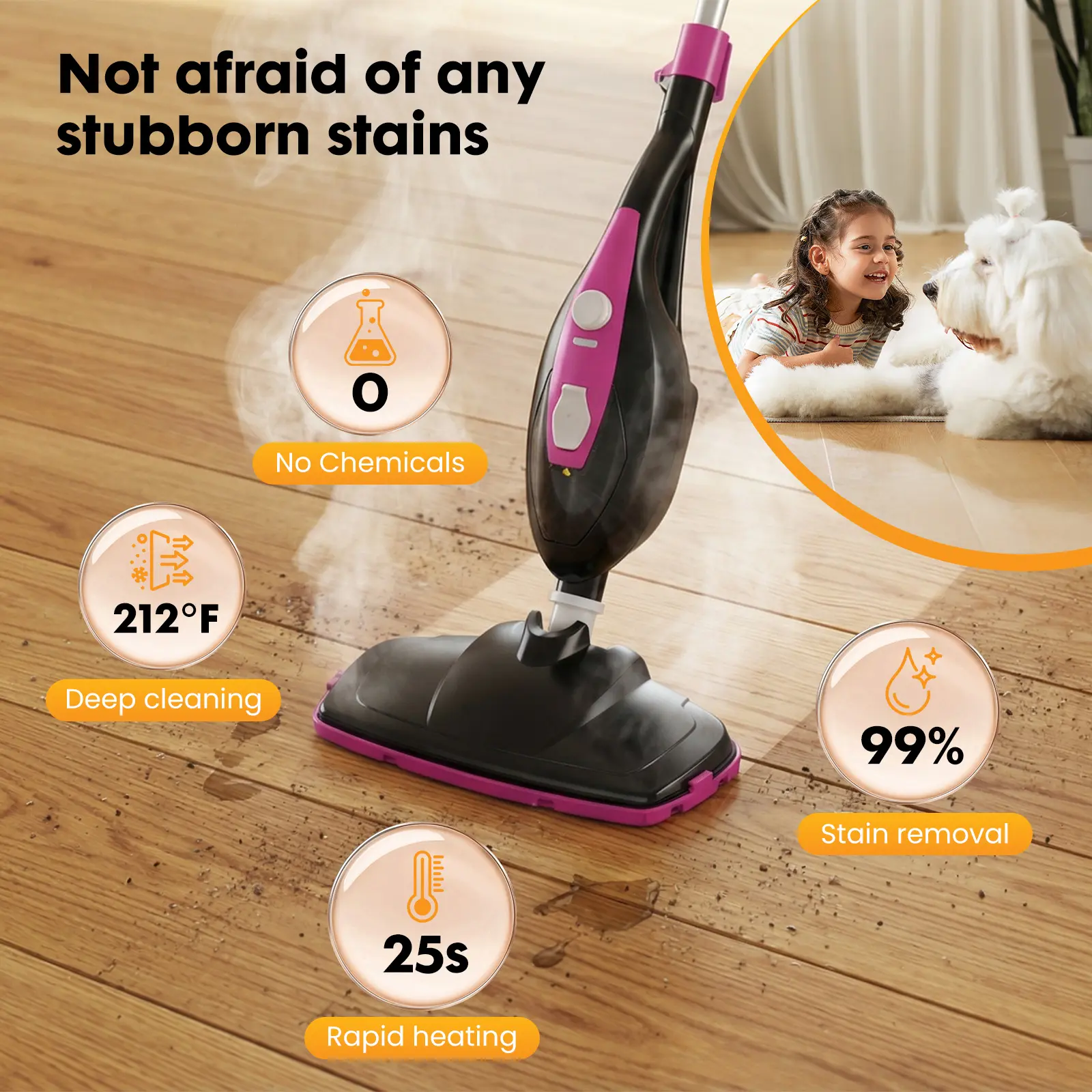 ·【Powerful Steam Mop】Our steam mops can rapidly heat up to 212°F, creating a steady and powerful stream of steam that effectively lifts away 99.9% of stubborn stains—safely protecting your floors and furniture at the same time. There’s no need for harsh or expensive detergents; just use water for a clean that’s safe, chemical-free, and kind to the planet—making it a thoughtful choice for your home and family.
