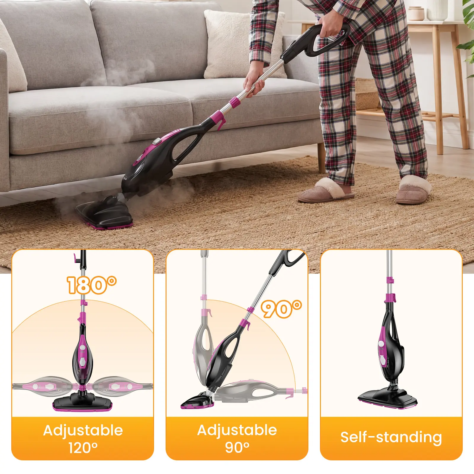 ·【Whole-Home Cleaning】Designed with your comfort and ease in mind, this portable steam cleaner comes with an adjustable height and a flexible swivel head that rotates smoothly 180°left and right, and 90°forward and backward. It glides effortlessly into corners, and tight spaces—so you can clean without bending or straining. With a 16-foot power cord and a lightweight build, it moves easily from room to room, making deep cleaning gentle, efficient, and truly hassle-free throughout your home.