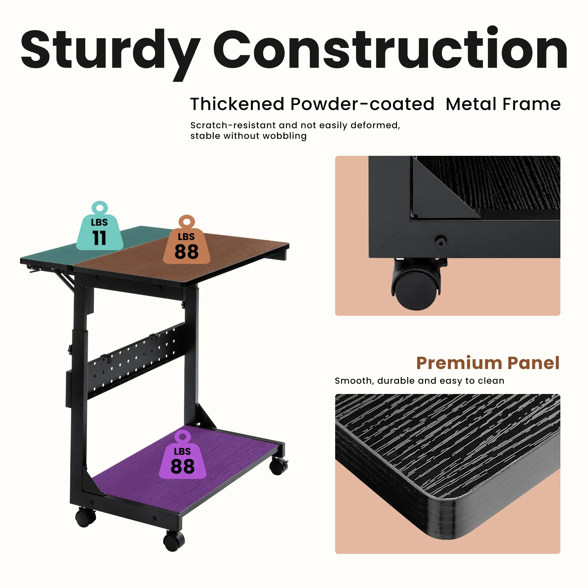 ·Sturdy Construction: EPA TSCA Title VI & CARB Phrase Ⅱ Certified desktop panel with premium anti-scratch finish.Thickened steel frame with powder-coated finish resists corruption to ensure stability and durability, not easy to scratch or deform, no wobbling. The bottom shelf max weight up to 88 LBS, and top shelf 100 LBS.