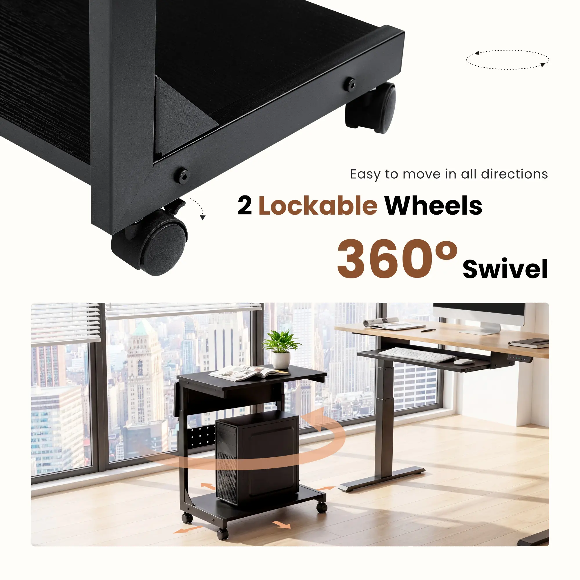 ·Easy to Move: Four 360-degree rotating mute wheels enable smooth movement on the carpet and floor. Mobile design allows for easier use in home and office even when fully loaded, reducing carpet prints and indentations, and easy to clean the floor. Dual casters with brakes hold the PC stand firmly in place for stable performance.