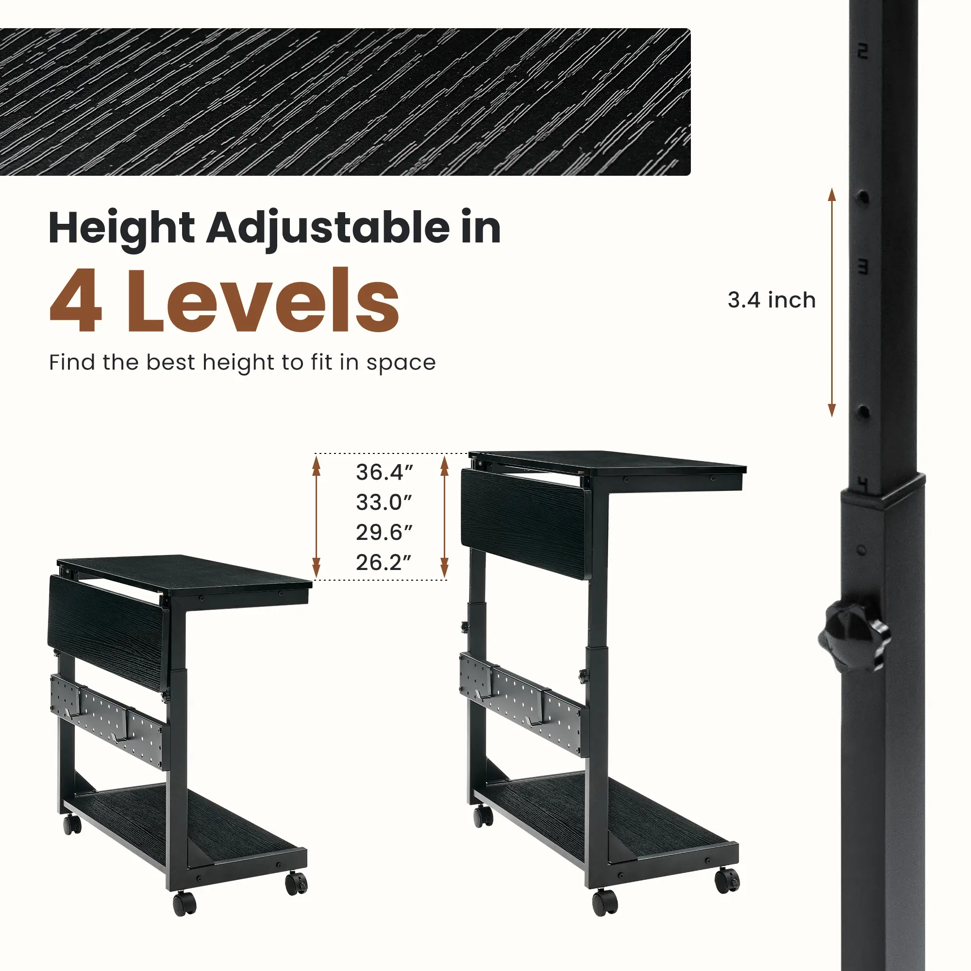 ·Height Adjustable in 4 Levels: Ranging from 26.2'' to 36.4'', 3.4inch each level, this manually height adjustable tower stand allows you to find the best height to fit in space. The stand can be stored under desk or next to table, supporting most computer cases on the market. Customize height increases distance between the computer tower and top shelf to speed up heat dissipation.