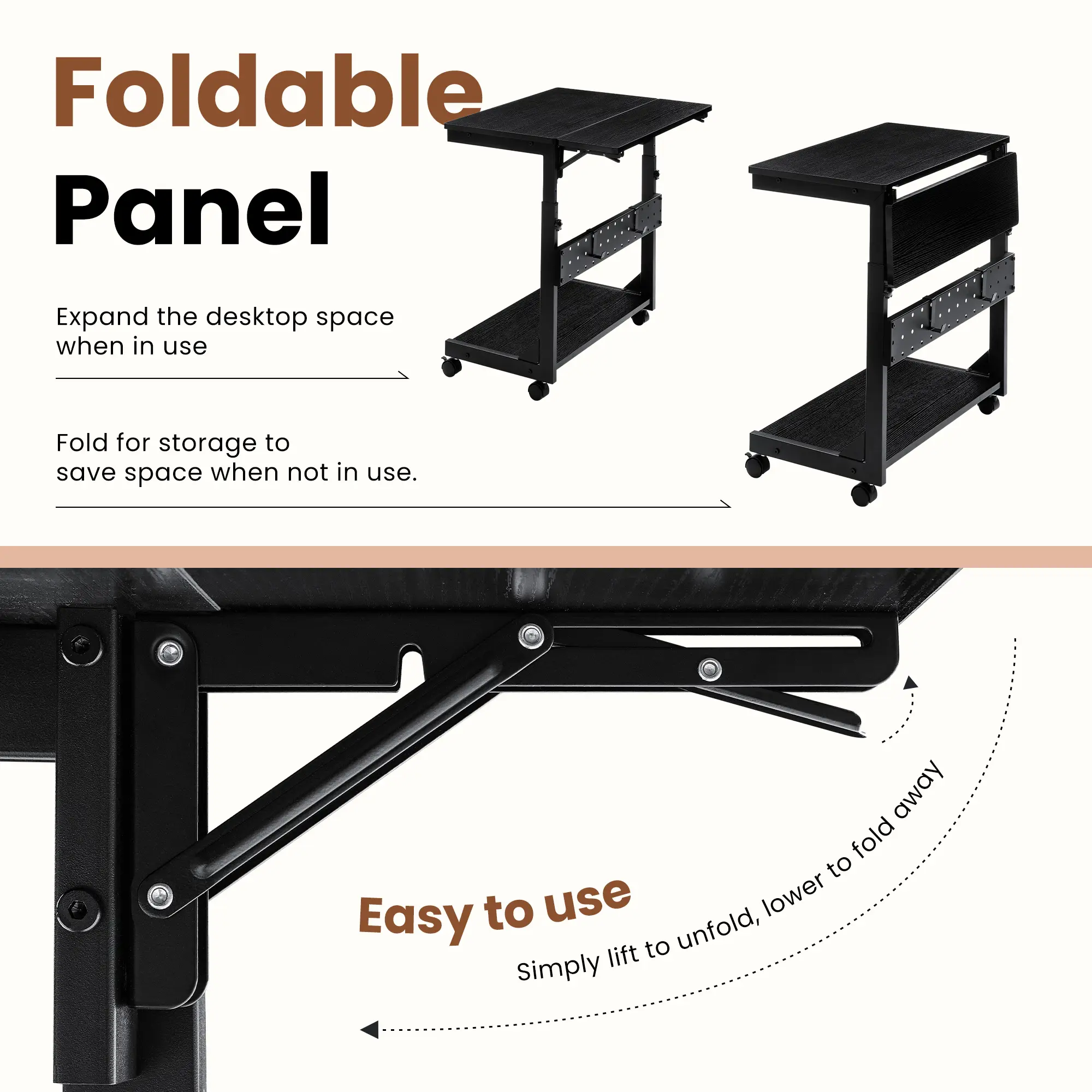 ·Folding Panel: Comes with a foldable panel, expand the desktop space when in use, and fold for storage to save space when not in use. Simply lift to unfold, lower to fold away.