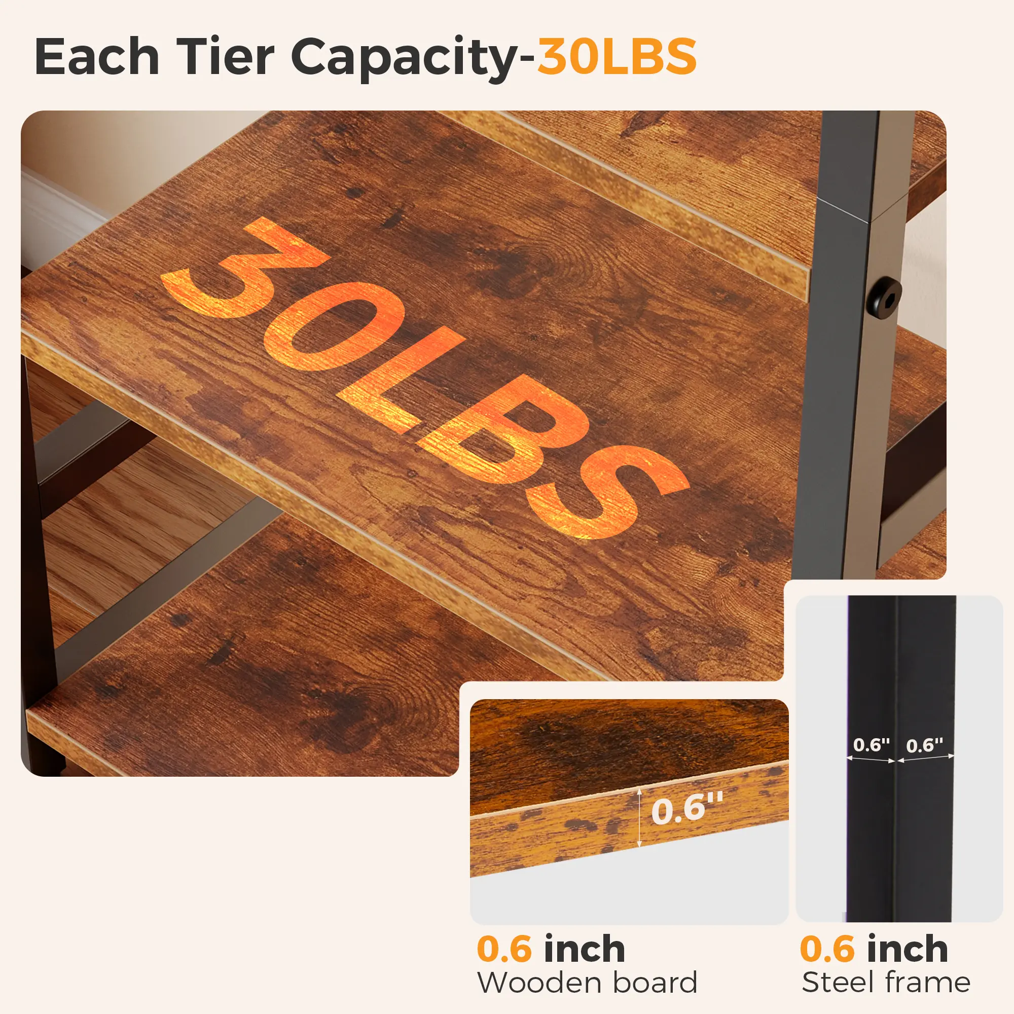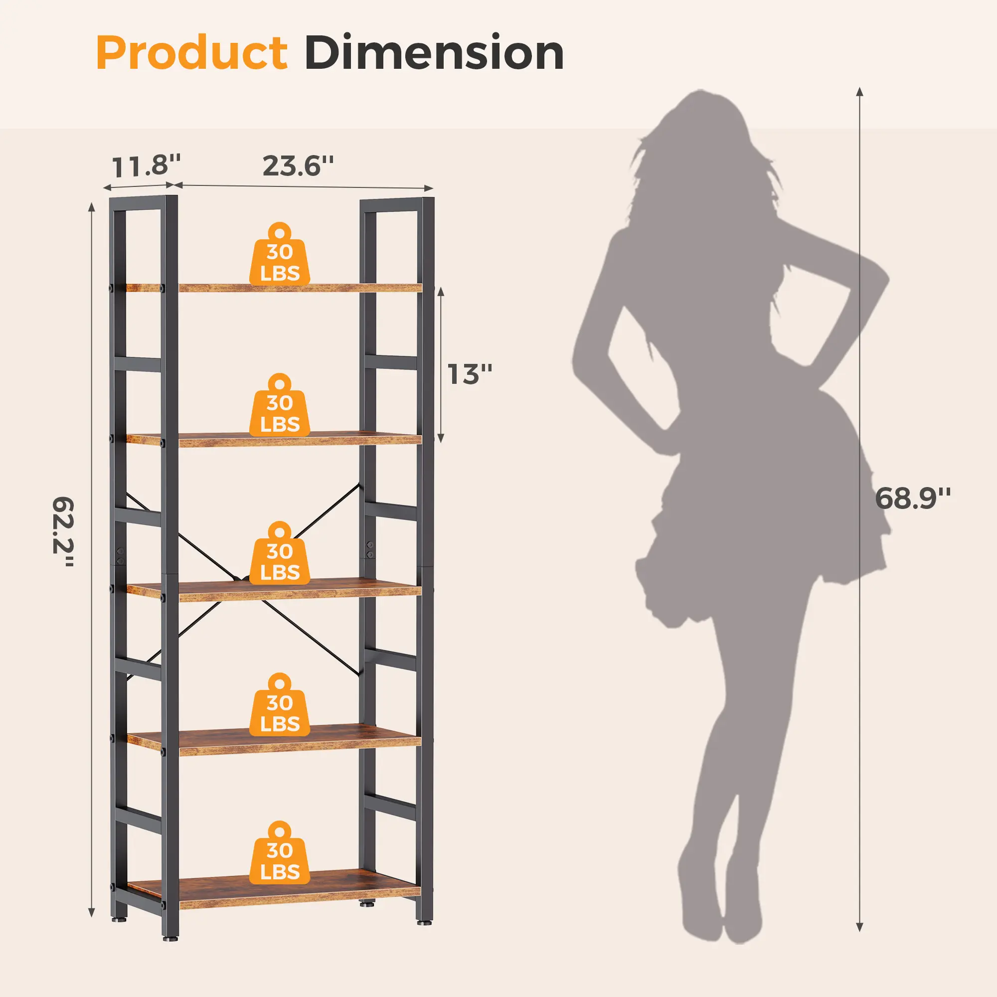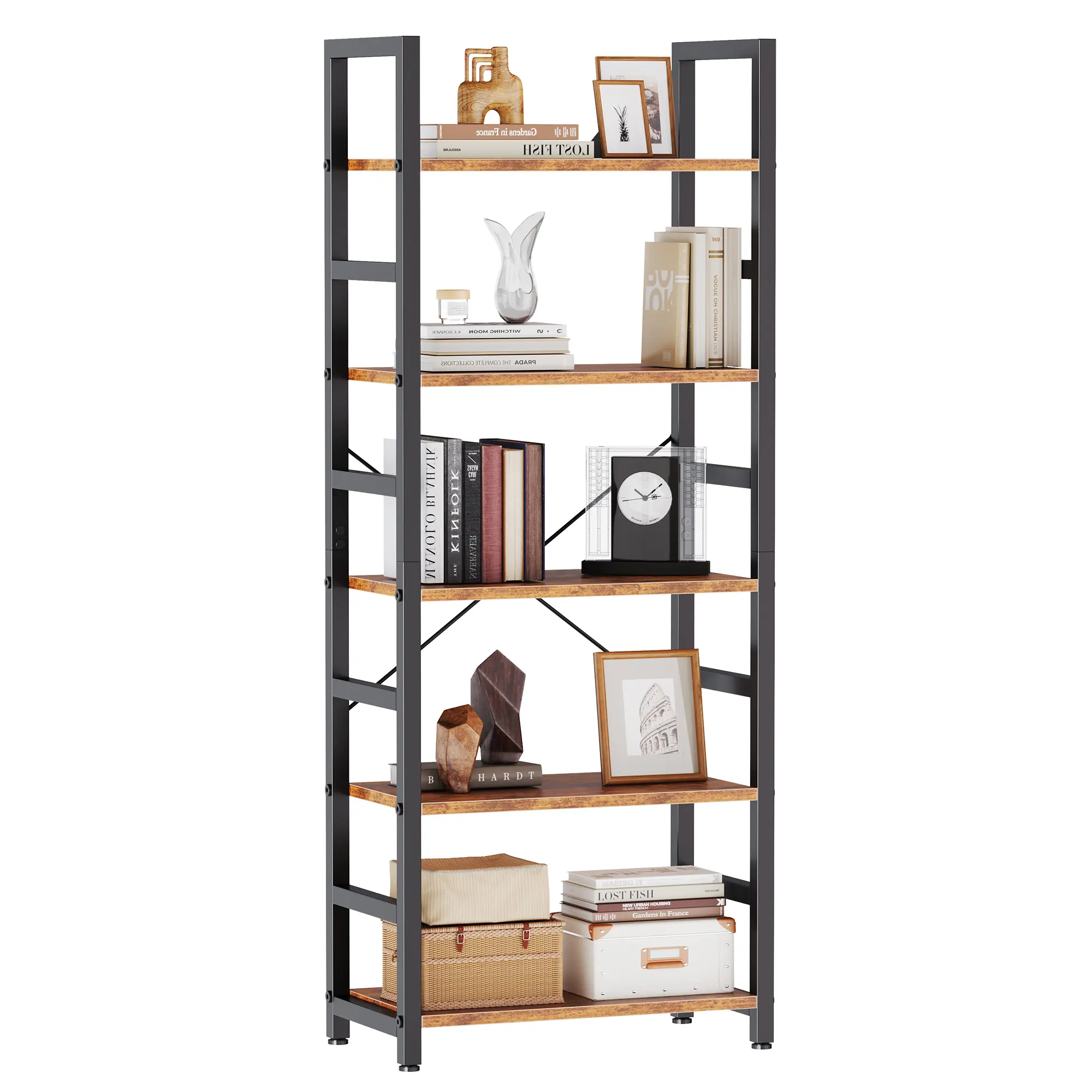 Crafted with wrought iron in a matte black finish, and constructed from sturdy boards and black coated metal frame. Uniquely designed metal sidebars with X-shaped rod in the back provides constant stability. Install the anti-tilting tool for better stability. 📚