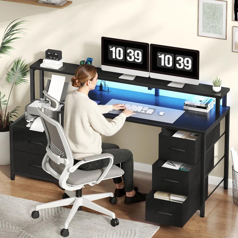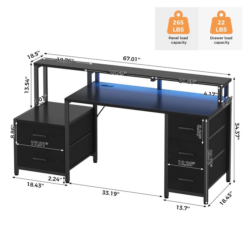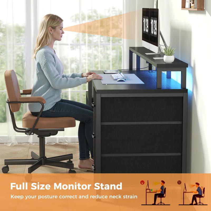 Create a versatile workstation that’ll meet all your needs with this all-in-one office desk. The desk is ideal for work, study, gaming and more. It offers ample storage with 5 fabric drawers to accommodate your belongings. The PC desk built-in charging station allows you to charge phones, computers, laptops, headphones and other devices. With RGB LED lights, you can set the perfect gaming atmosphere. Additionally, the full-size monitor stand helps maintain proper posture and reduce shoulder and neck fatigue. If you’re in the market for a multifunctional desk, this is an excellent choice.