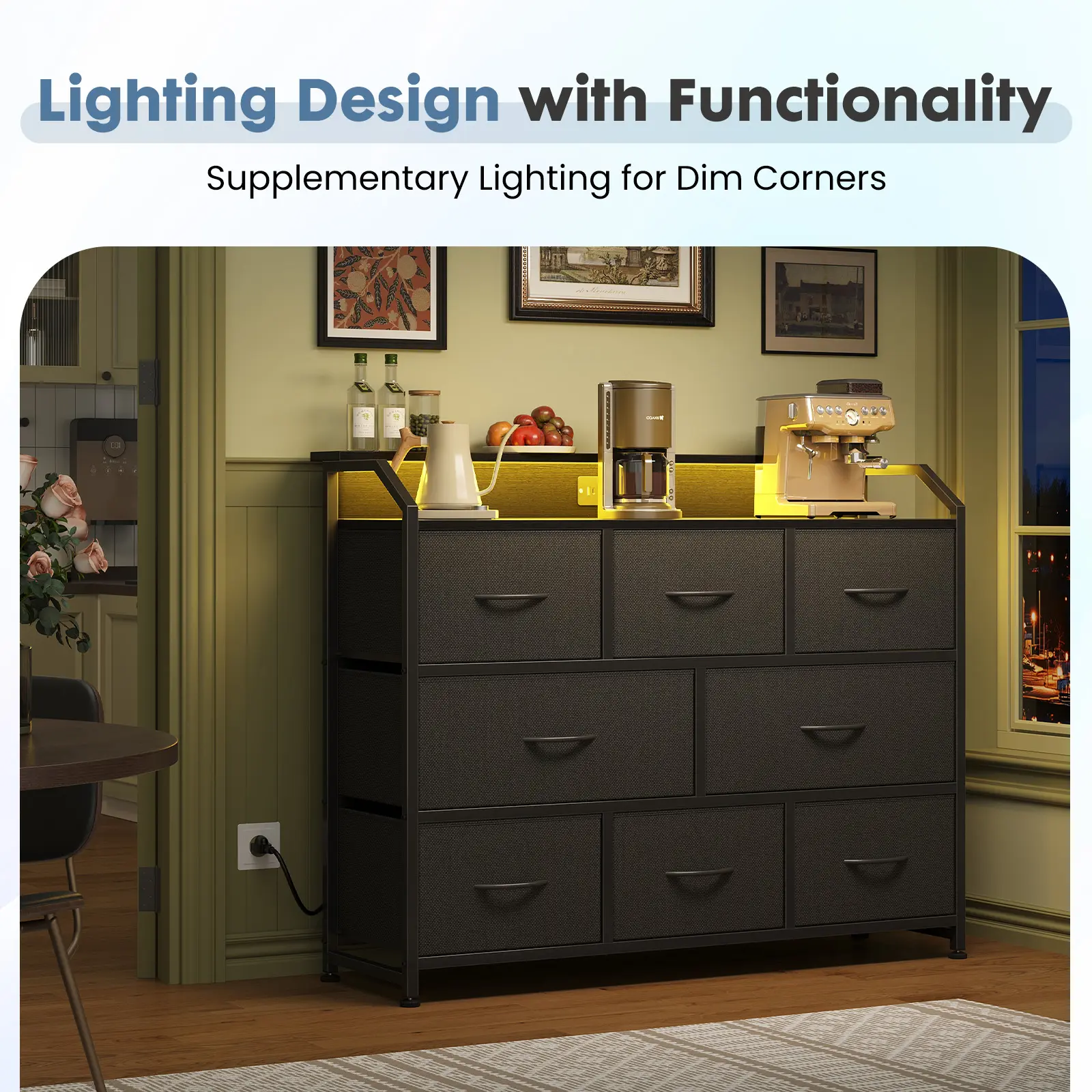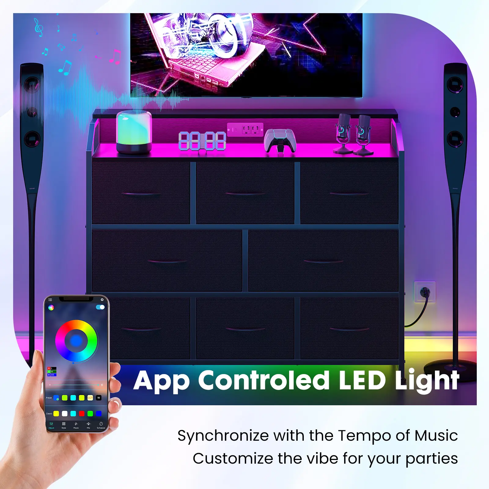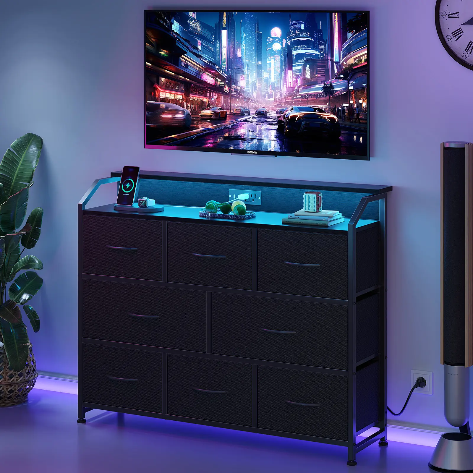 Sweetcrispy 8 Fabric Drawers Dresser with Power Outlets LED Light Multifunctional TV Stand Storage Cabinet for Bedroom Living Room Office Hallway
