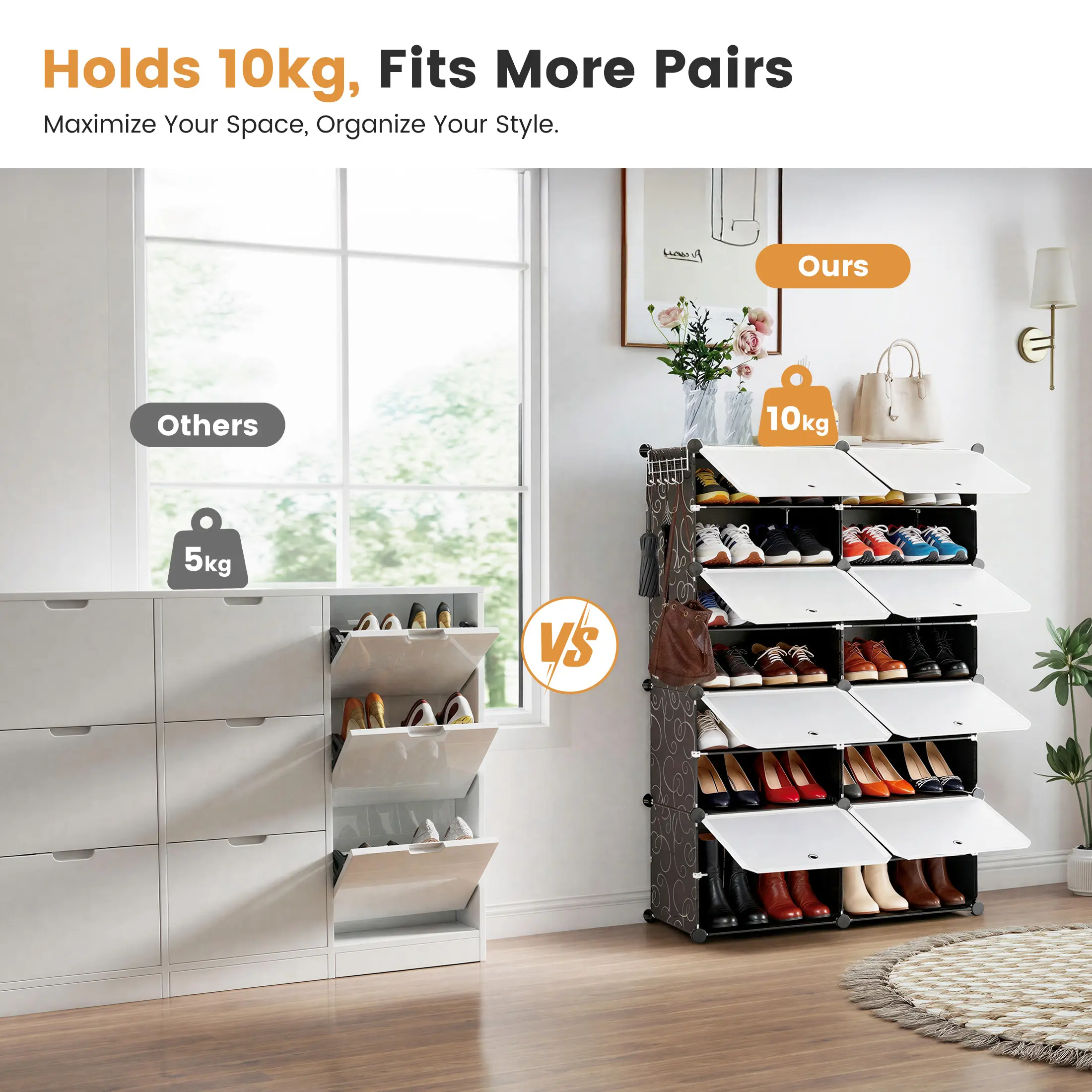 ·[Store Plenty Shoes] The rack is designed to fit all types of shoes, including sneakers, heels, boots, flats, and children's shoes. Holding 32 pairs should be enough for most individuals or families.