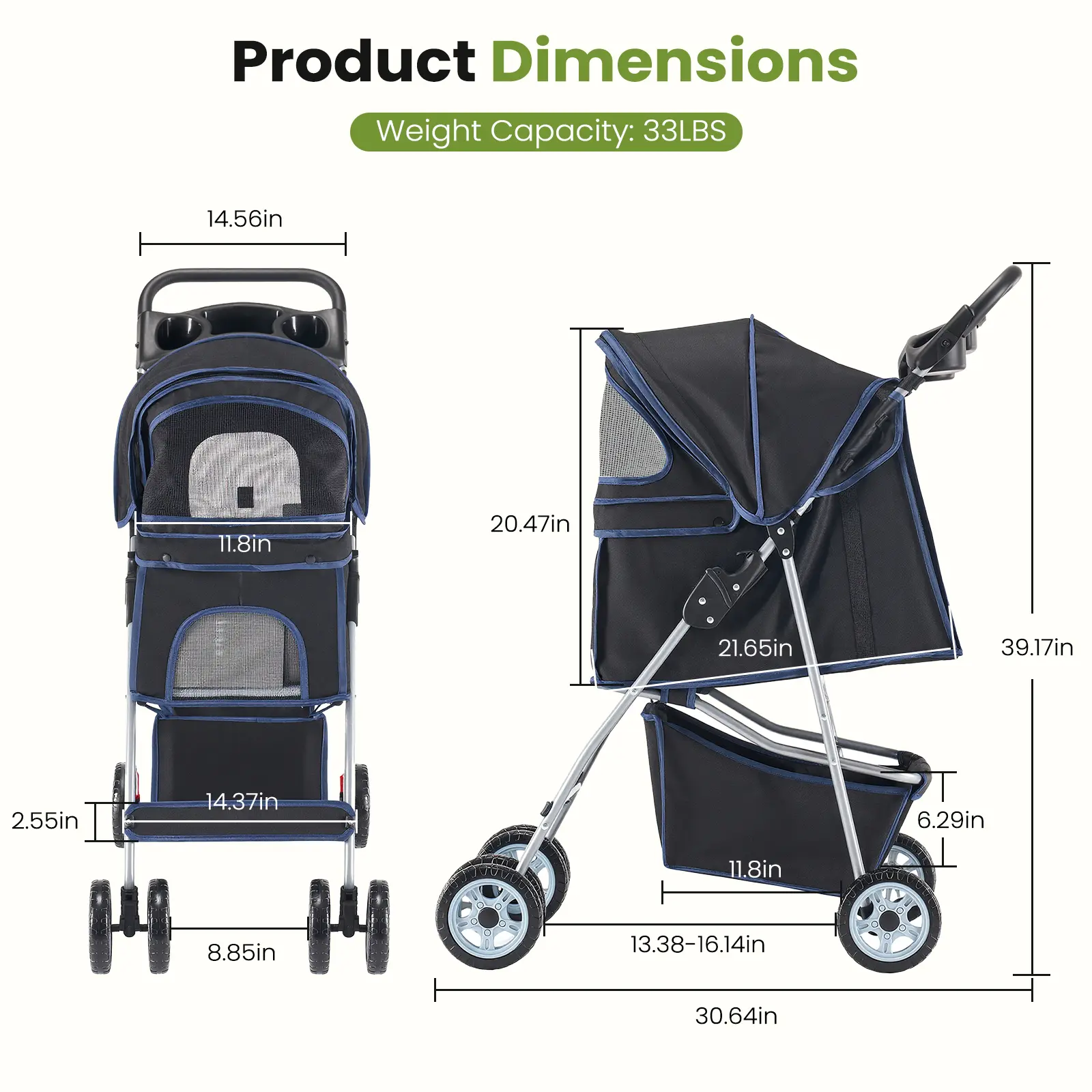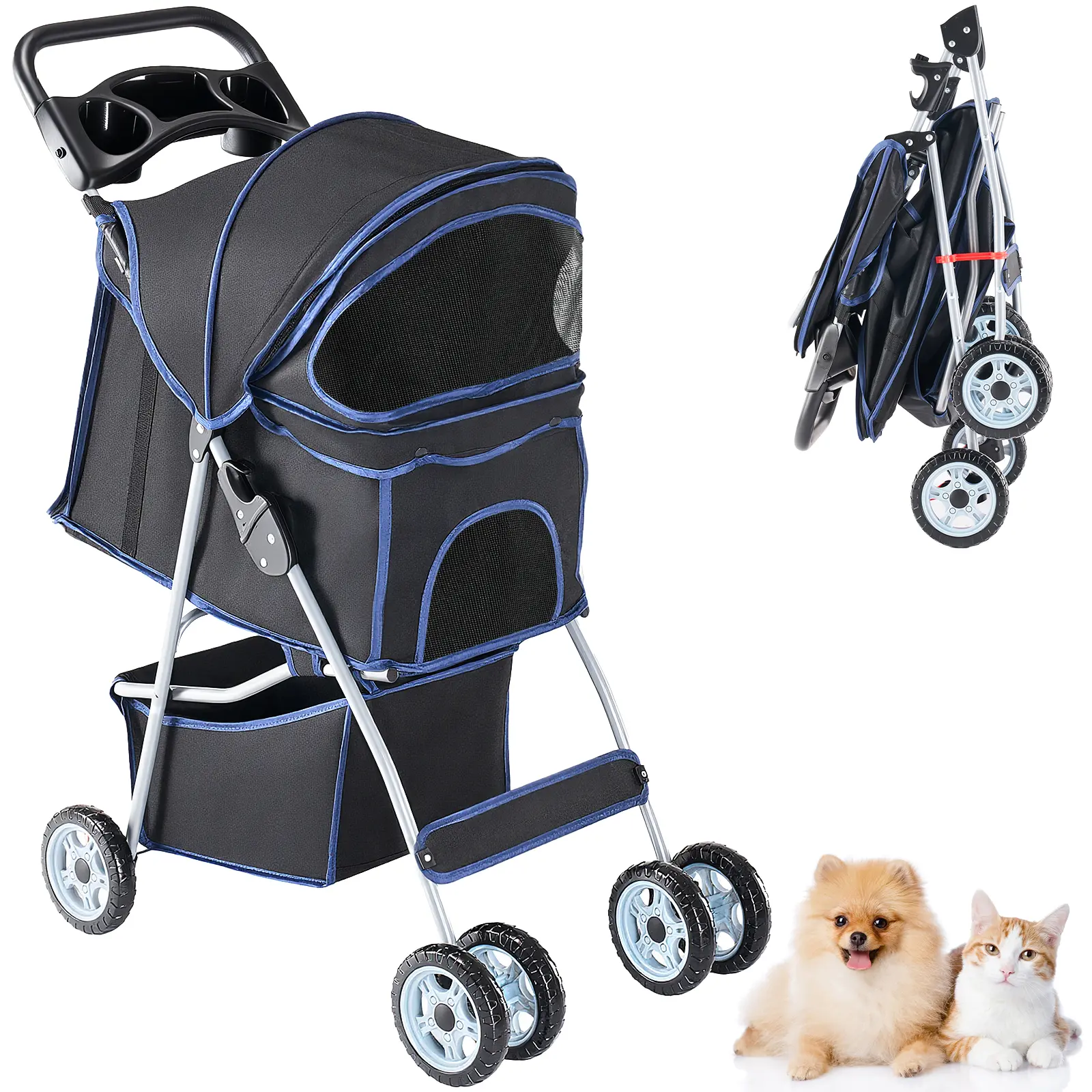 Explore with Ease - Sturdy Aluminum Frame: Ensures smooth navigation through any terrain. - Rugged Wheels: Provide stability and ease of movement. - Spacious Interior: Offers ample space for your pet. - Breathable Mesh Panels: Keep your pet comfortable and cool. - Storage Basket: Includes a basket for your essentials. - Cup Holders: Keep your drinks within reach.
