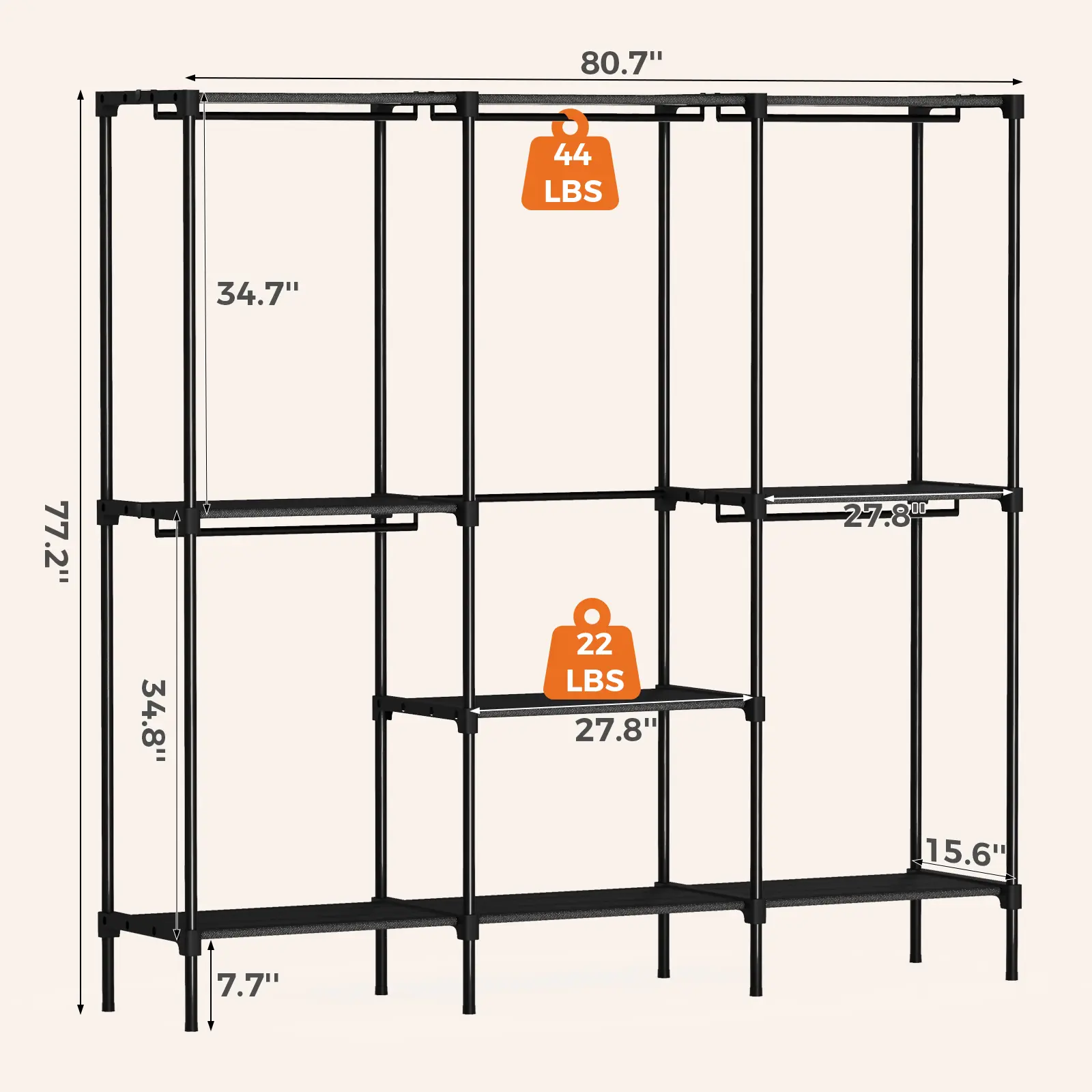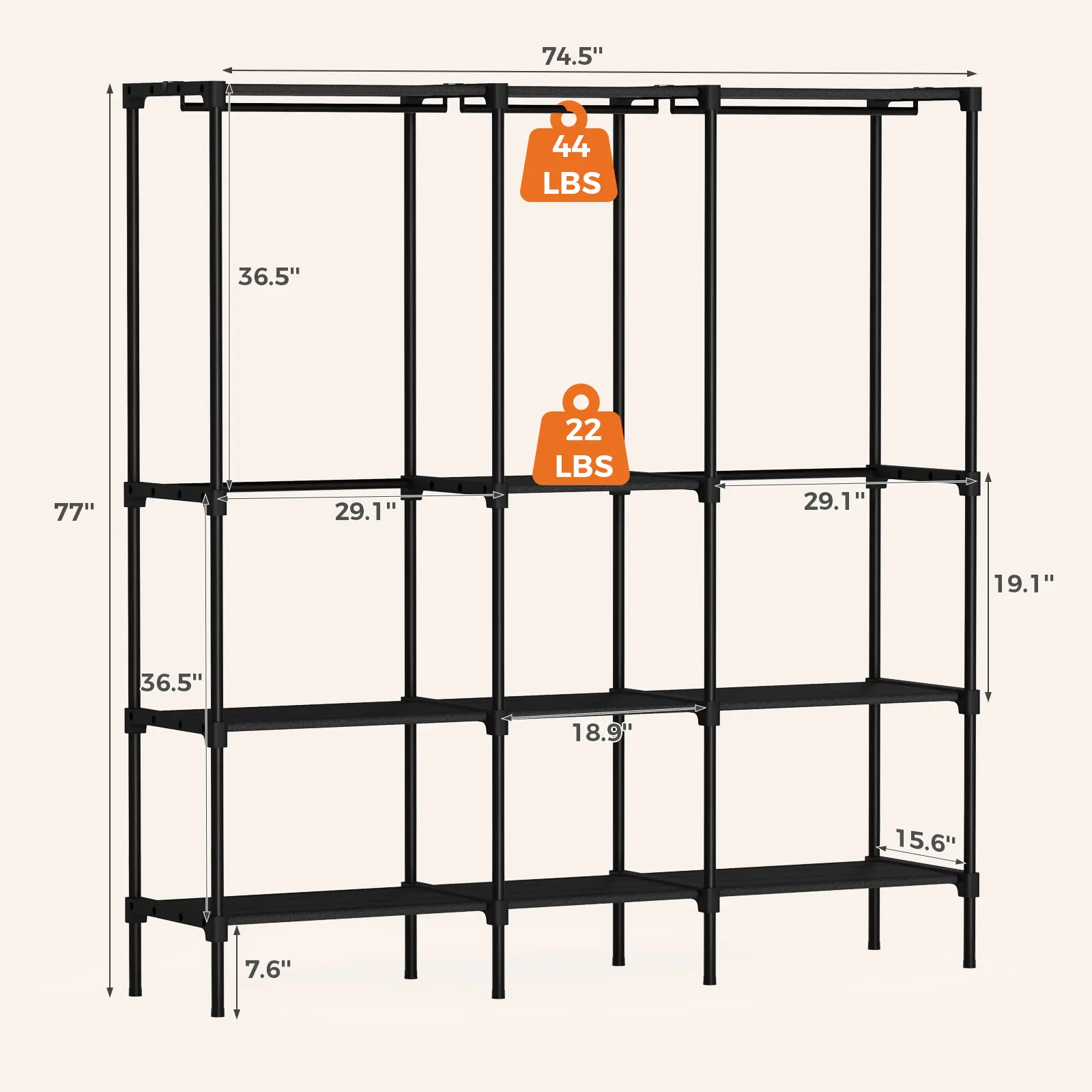 ·[Robust & Durable Construction] Built to last, portable wardrobe rack features thick steel tubes and reinforced connectors for exceptional sturdiness. It reliably supports up to 22 lb per shelf and 44 lb on the hanging rod. Adjustable feet ensure stability on any surface.