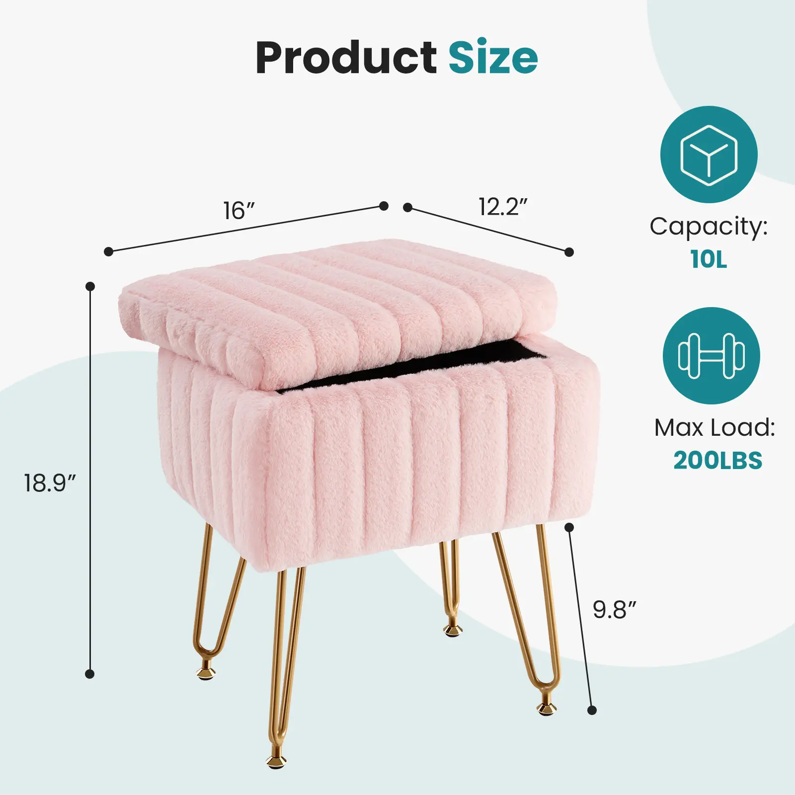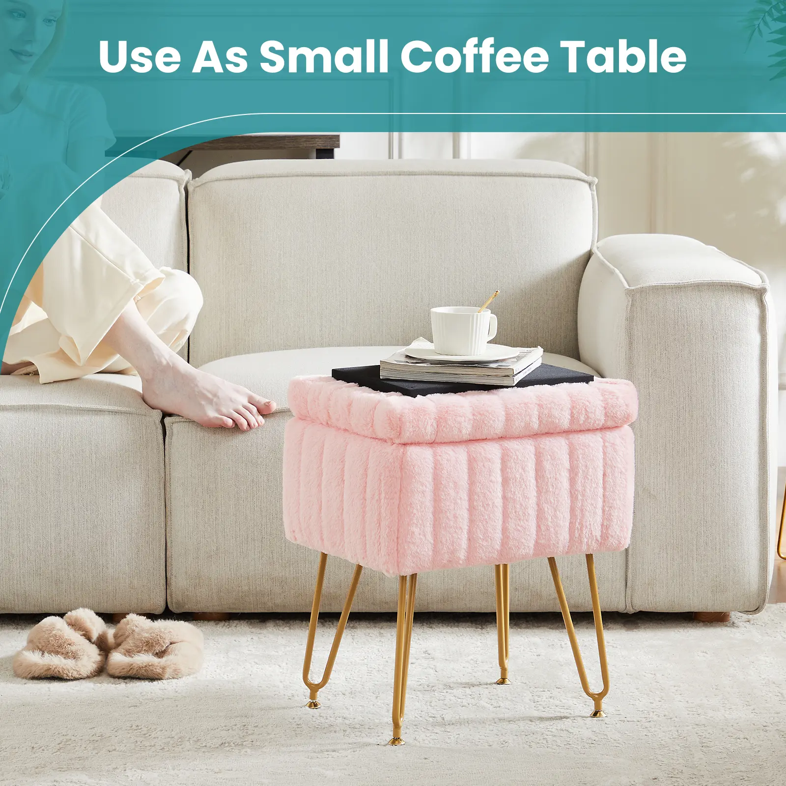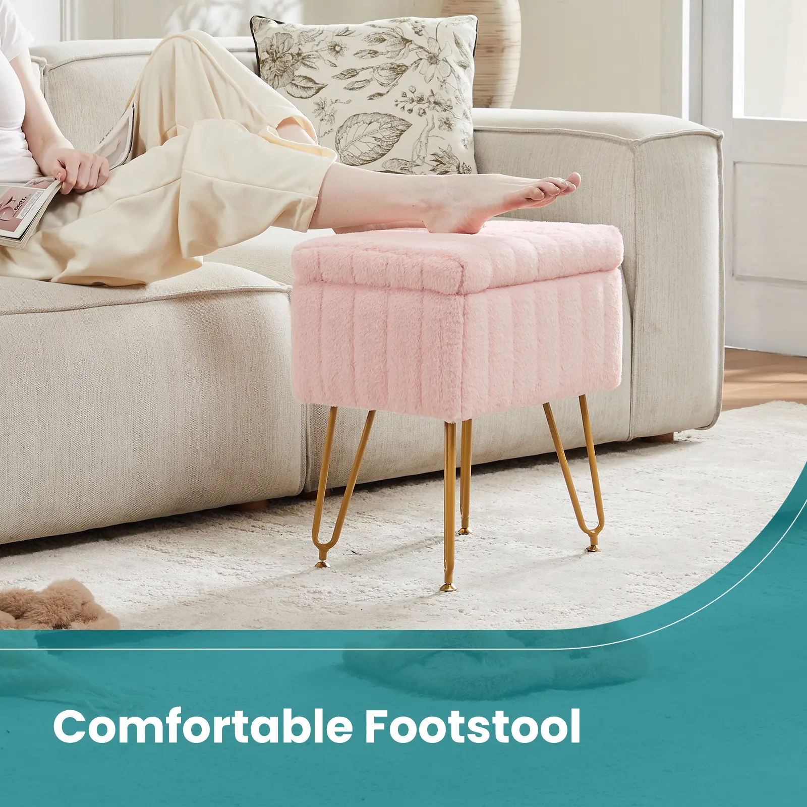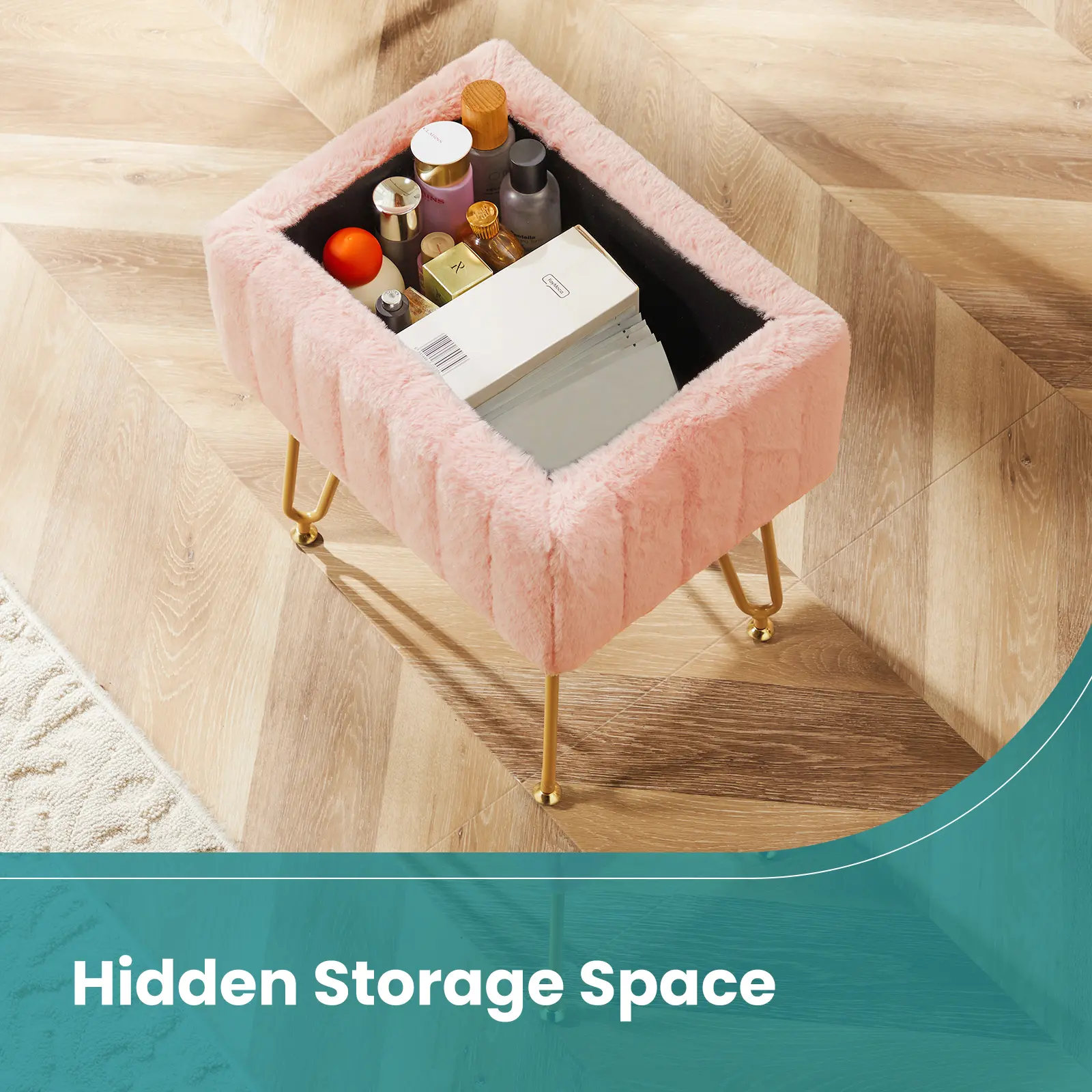 ·【Hidden Storage Space】: Enjoy a unique hidden storage space beneath the plush surface of the vanity stools makeup stool, offering approximately 10L of capacity volume. Perfect for storing various items discreetly, like makeups, cosmetics, magazine, and so on, saving valuable space.