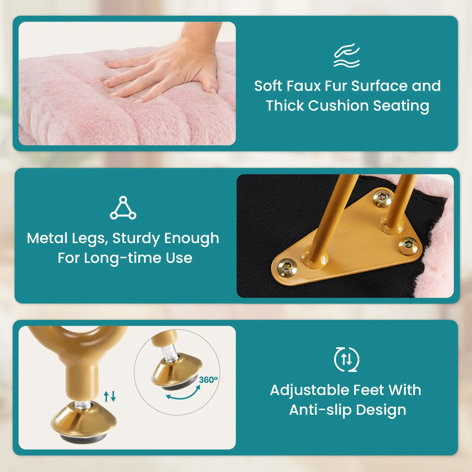 ·【Comfortable Faux Fur Fabric】: Crafted from soft faux fur fabric with a thick padded cushion, ensuring exceptional comfort. Available in 3 cute colors: white, pink, and grey, each adding a touch of charm and fashion to any setting. Suitable for diverse scenarios, such as bedroom, entryway, living room, office, bathroom, etc.