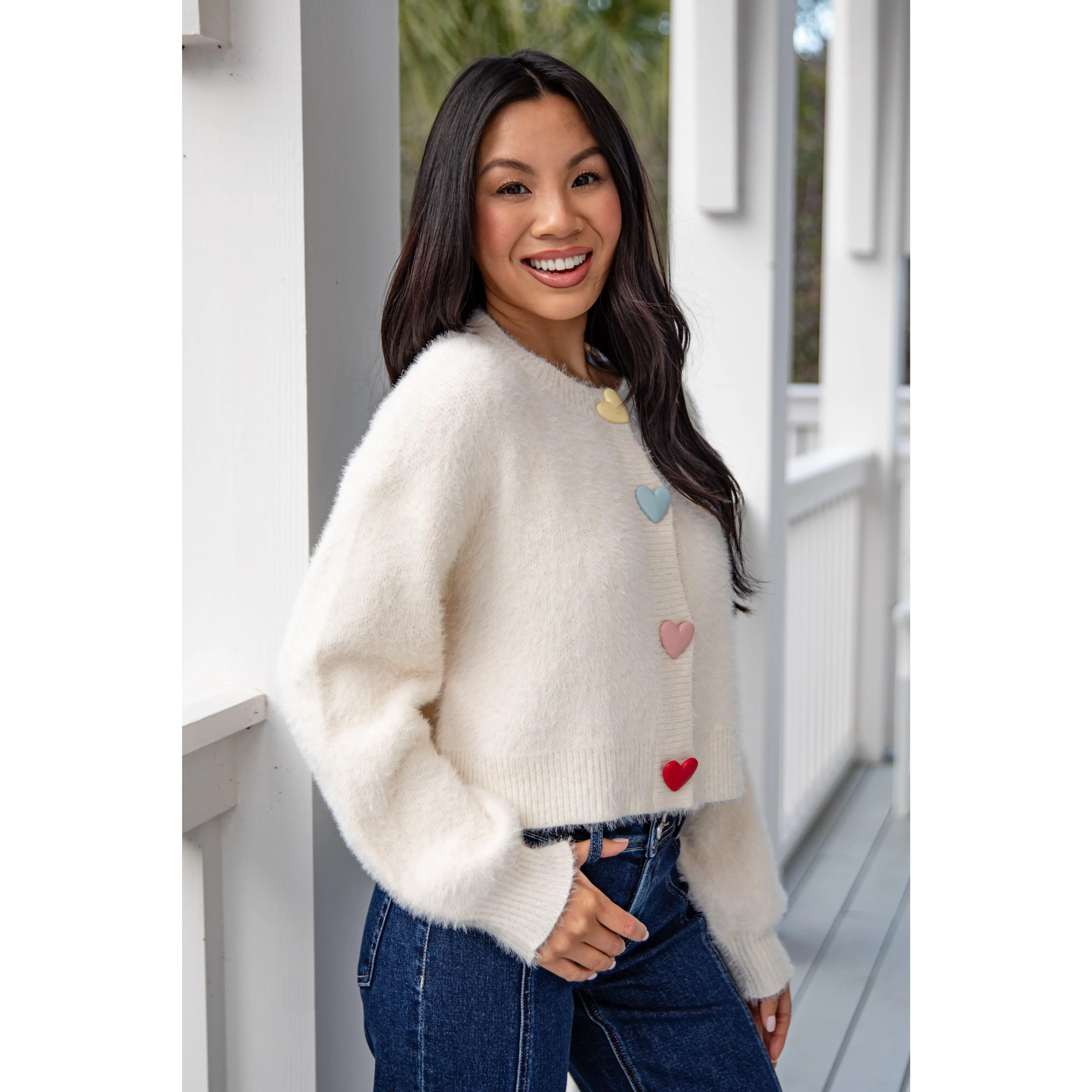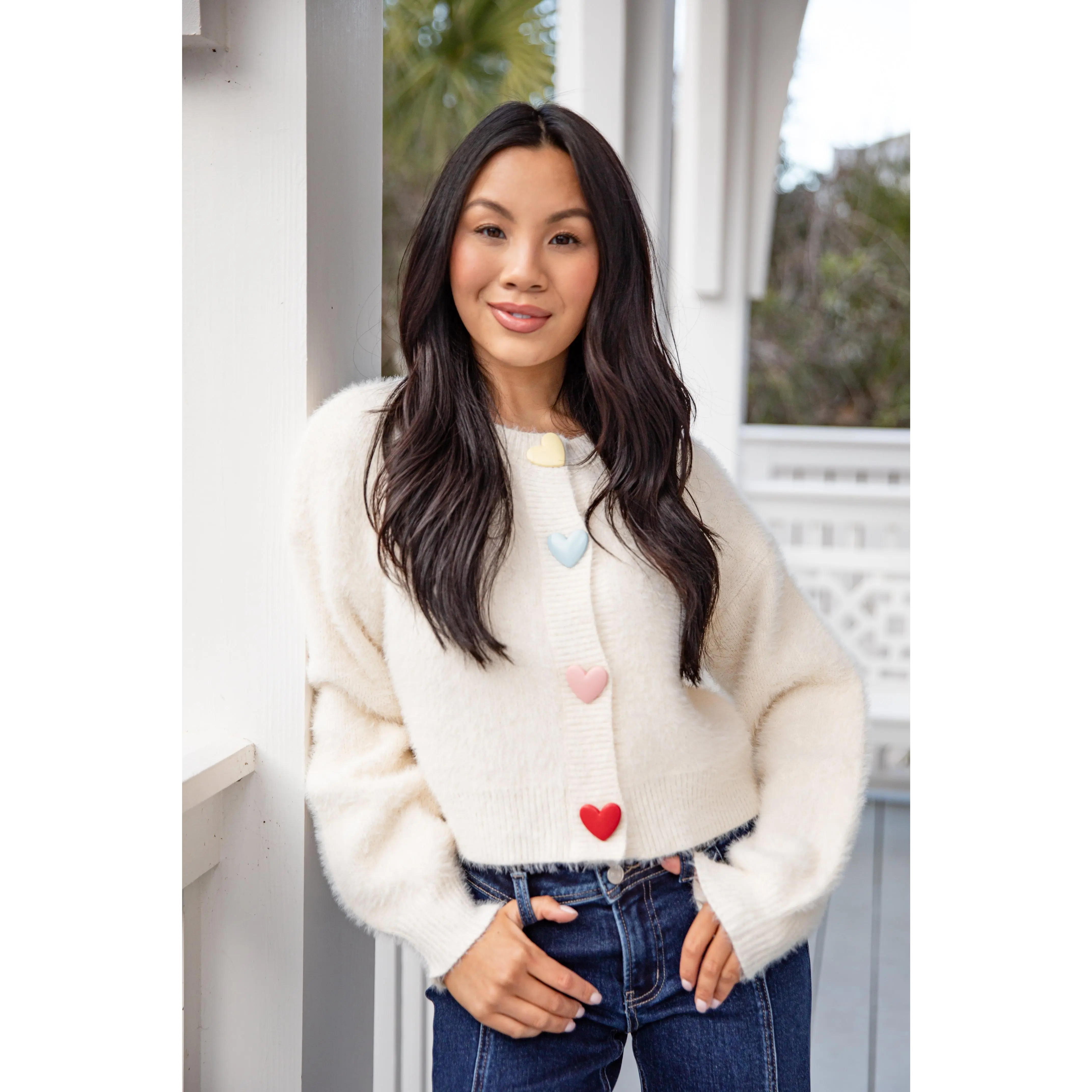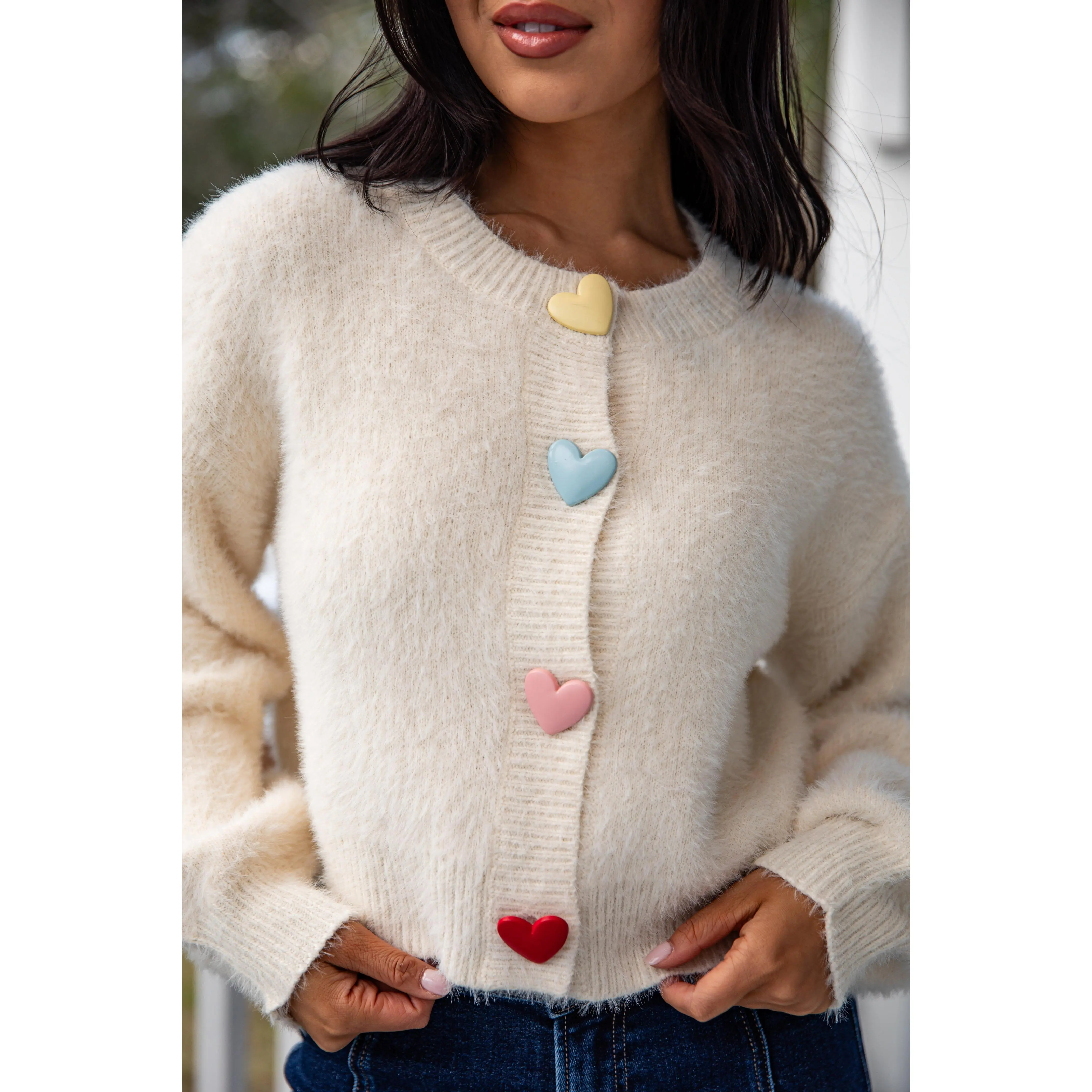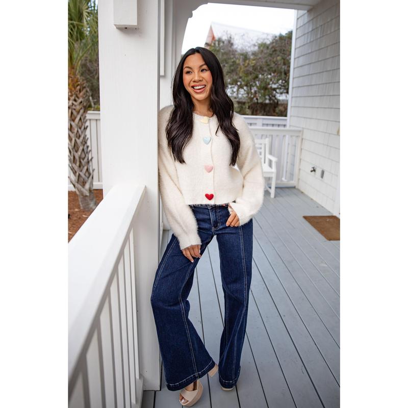 The Sweethearts Knit Ivory Sweater Cardigan is a neutral cream knit finished with multicolored pastel heart details for a subtle pop of color. Designed with a classic fit and soft feel, this sweater blends sweetness with versatility, making it perfect for transitioning between seasons. The relaxed fit makes it perfect for layering, while the playful Hearts adds a sweet pop of personality to any outfit. Wear it with denim, skirts, or your favorite basics for an effortlessly cute and comfortable look.