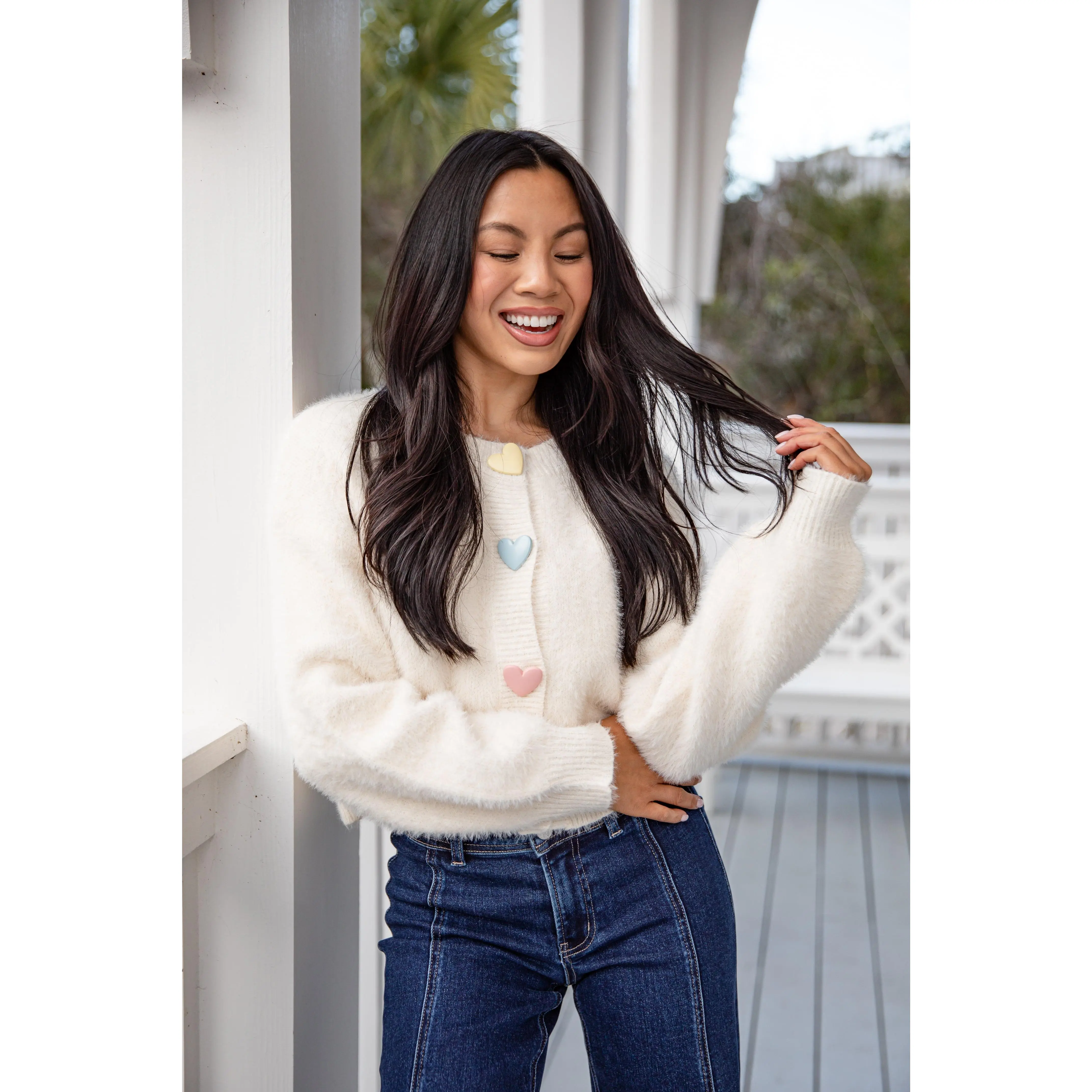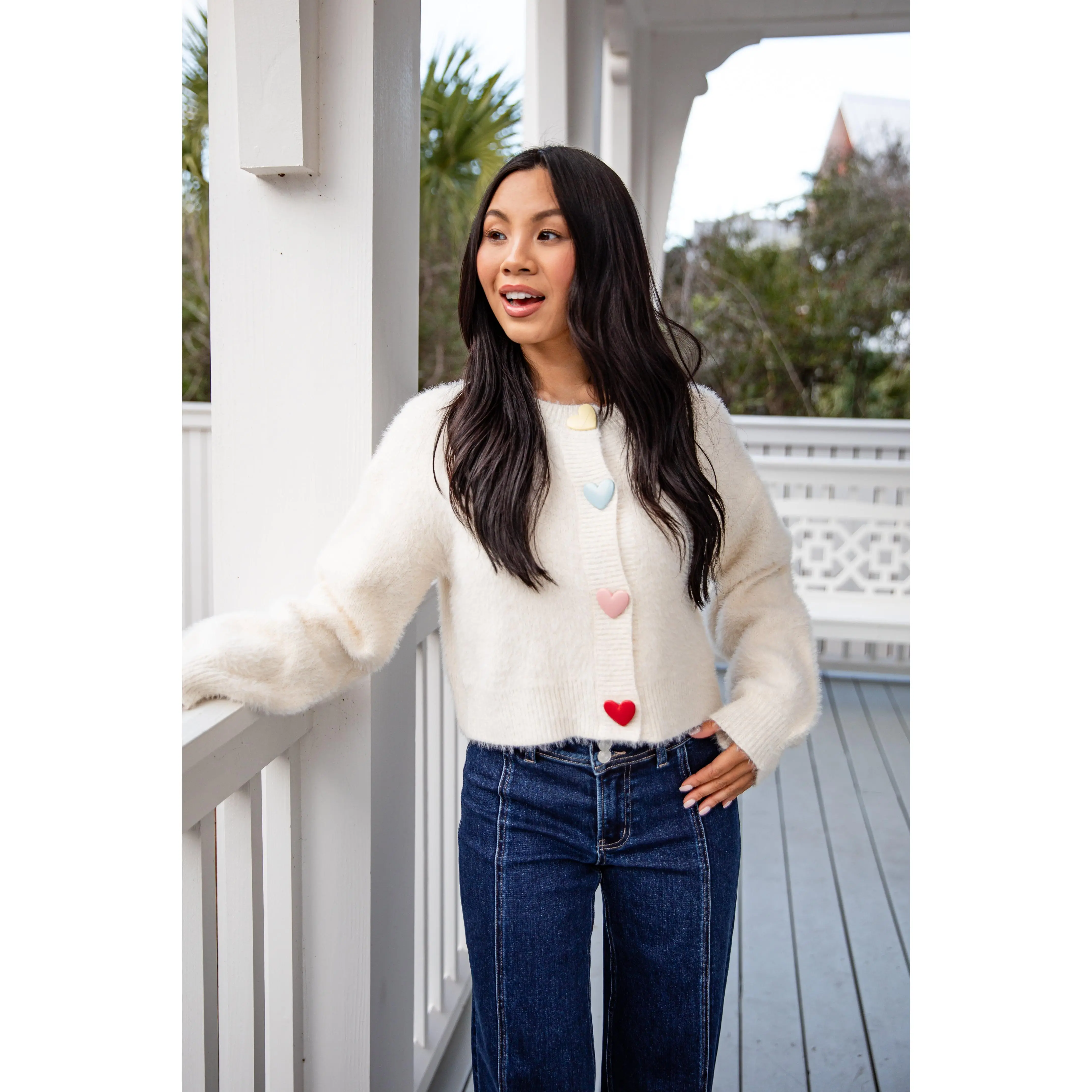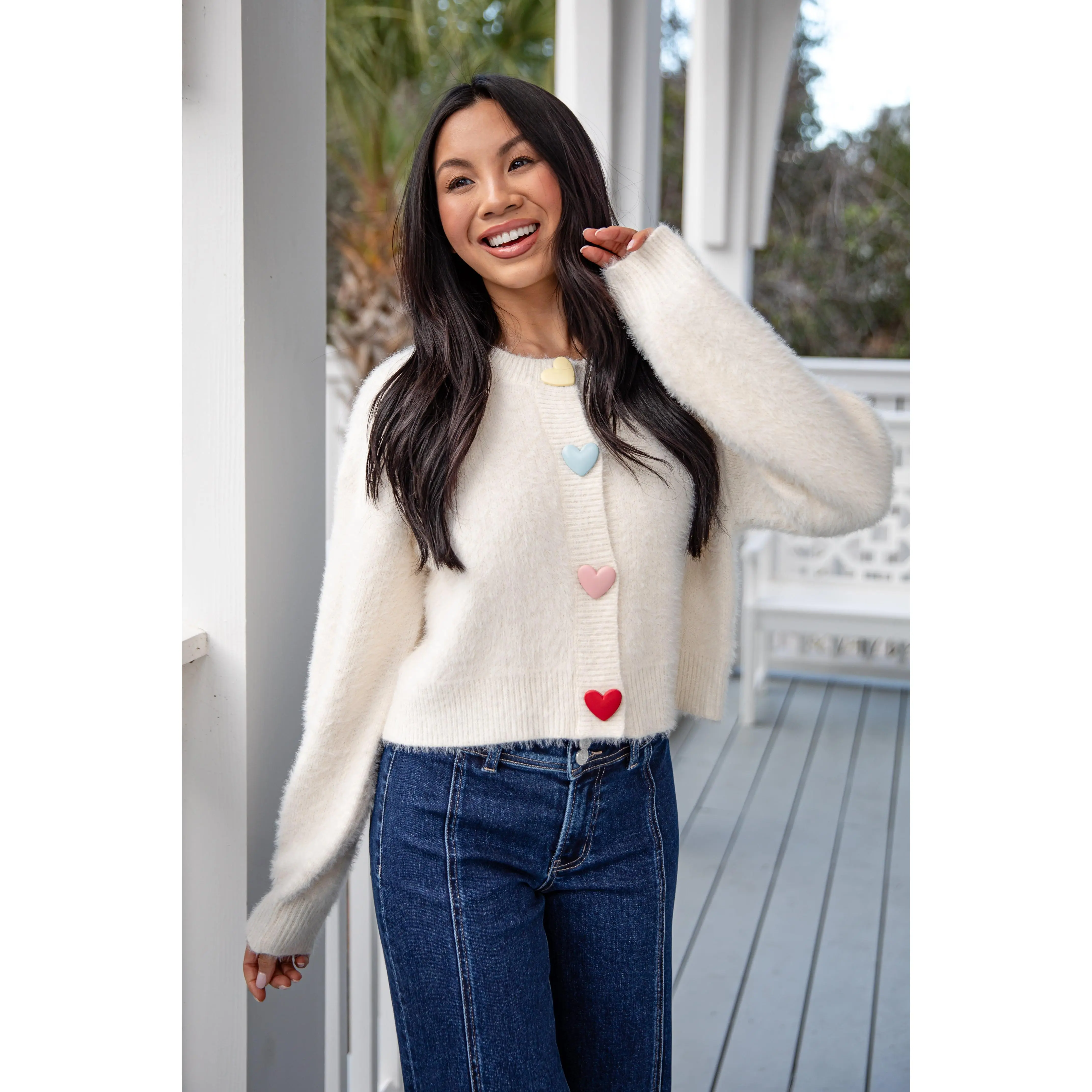 The Sweethearts Knit Ivory Sweater Cardigan is a neutral cream knit finished with multicolored pastel heart details for a subtle pop of color. Designed with a classic fit and soft feel, this sweater blends sweetness with versatility, making it perfect for transitioning between seasons. The relaxed fit makes it perfect for layering, while the playful Hearts adds a sweet pop of personality to any outfit. Wear it with denim, skirts, or your favorite basics for an effortlessly cute and comfortable look.