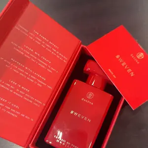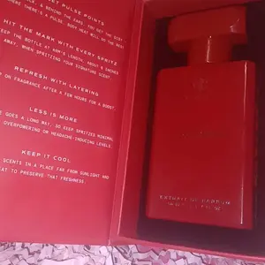 Unisex, versatile for day or night, perfect in cooler weather. The red bottle is sleek and luxurious.