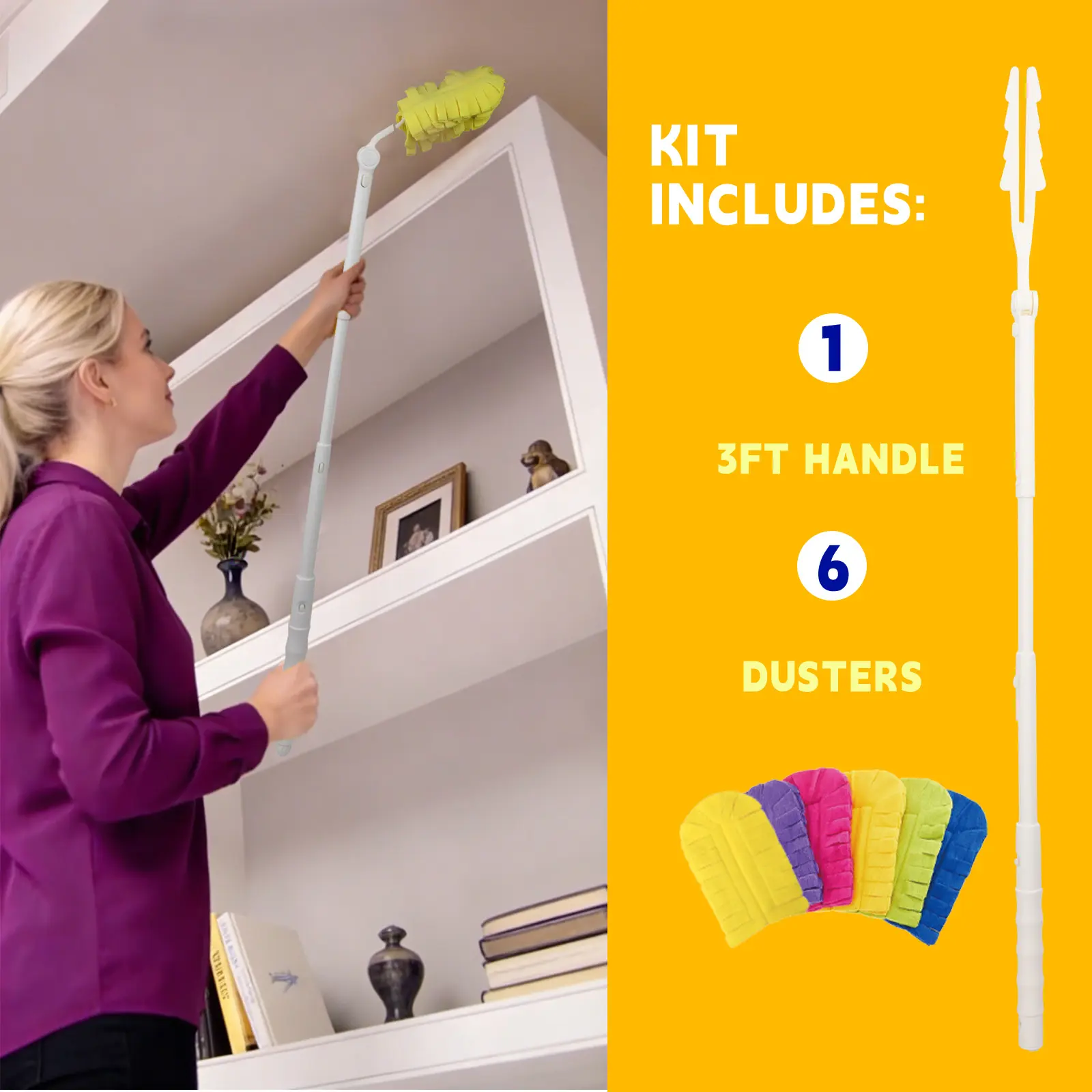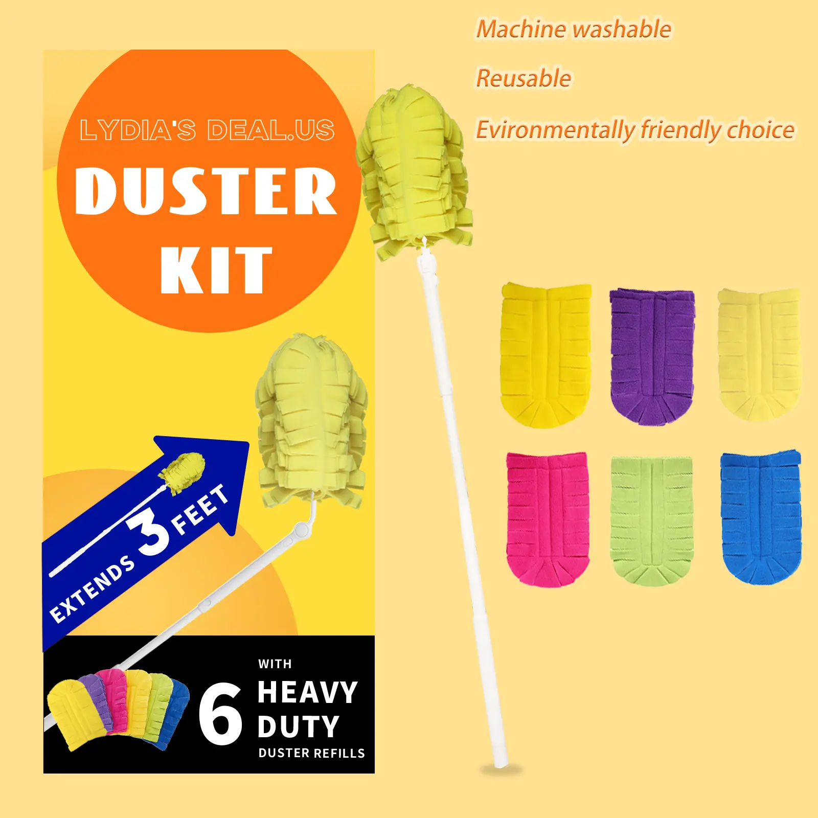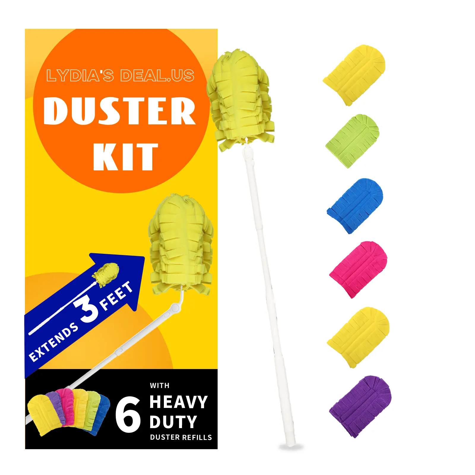 Upgrade your cleaning routine with our Heavy Duty Duster Refills. This Starter Kit includes 6 machine washable, reusable refills. Perfect for maintaining a clean home, these refills feature a 3 ft extendable handle for effortless reach. 🏠