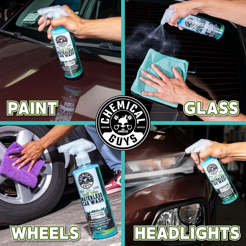 I have tried a few types of waterless car washes but after buying the spray bottles of Chemical Guys Swift Wipe Waterless Car Wash at local Walmart, this is the best there is. I use it in door jambs and around rear door hatches in SUVs after cleaning with Chemical Guys Invinsible Cleaner if area has a lot of dirt, etc. This stuff cleans well and leaves a fresh new look to paint without being overly shiny and sticky to touch which other waterless washes do, making them have to dry a long time before being touched or using a top coat. I just bought a gallon of it here on the website to fill my bottles. Only complaintt I have with the bottles is they will leak if laid on their side straight from factory, even if you tighten them more.